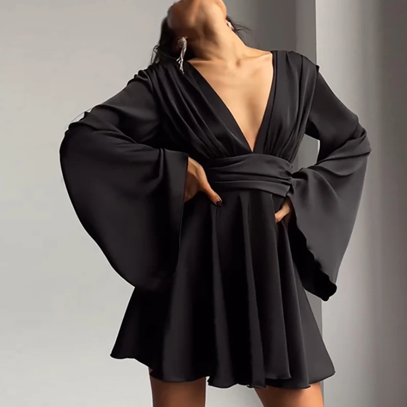 LBSFY  -  2024 High Waist Solid Mini Club Dress Women High Street Flare Sleeve Princess Dresses Winter Elegant Satin V-Neck Party Dress