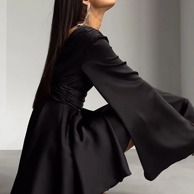 LBSFY  -  2024 High Waist Solid Mini Club Dress Women High Street Flare Sleeve Princess Dresses Winter Elegant Satin V-Neck Party Dress