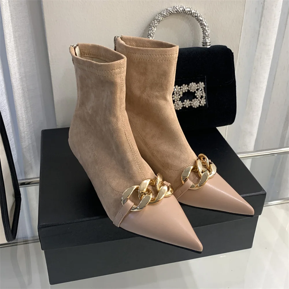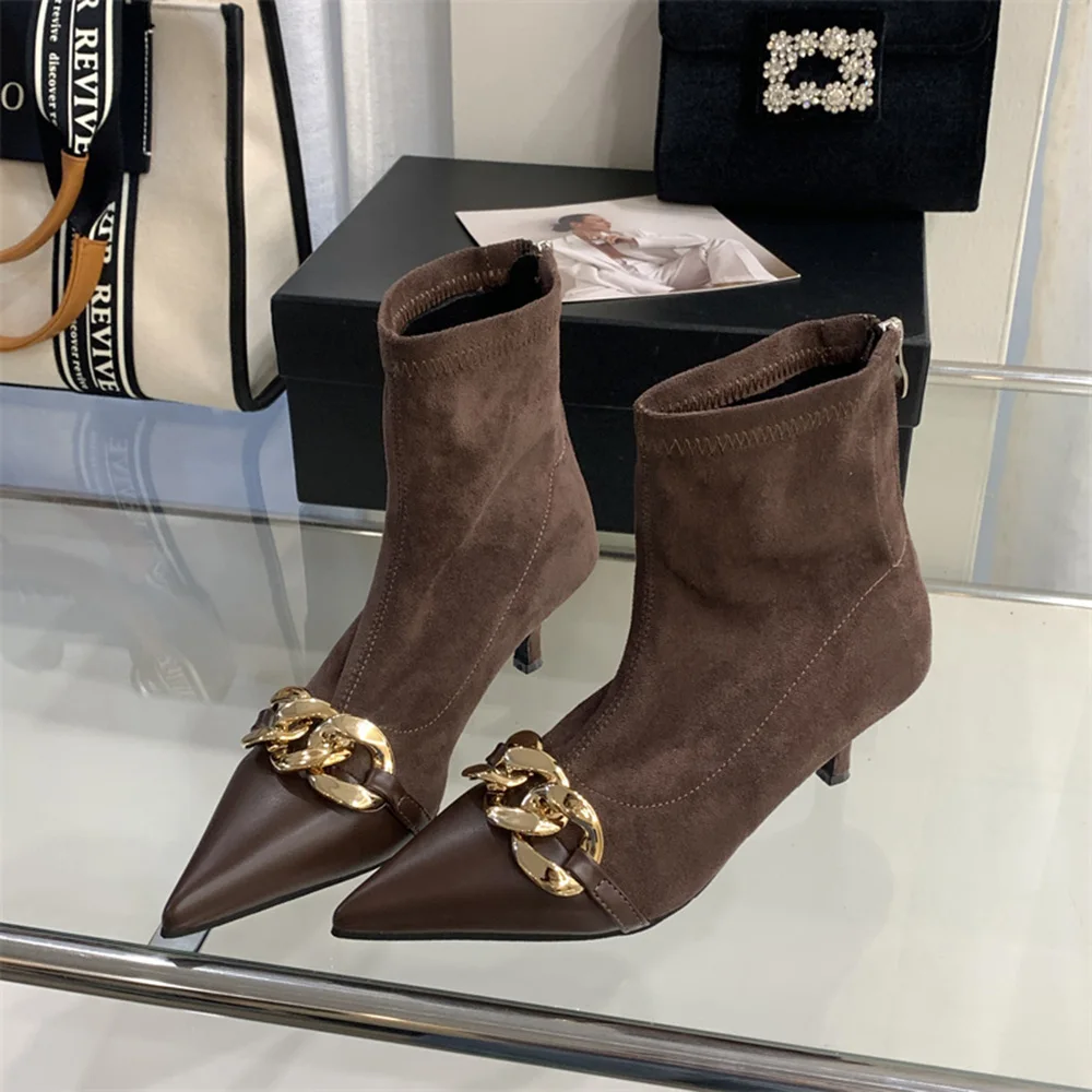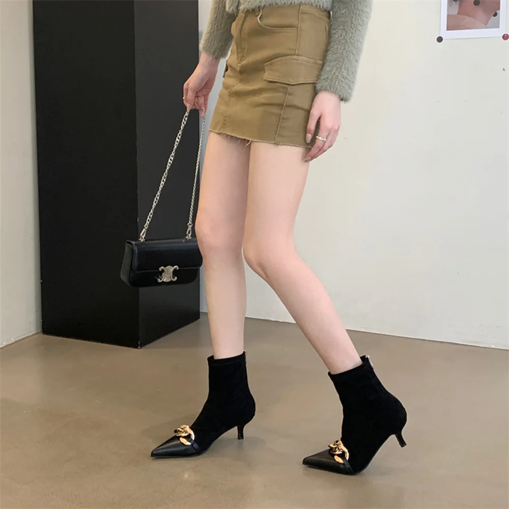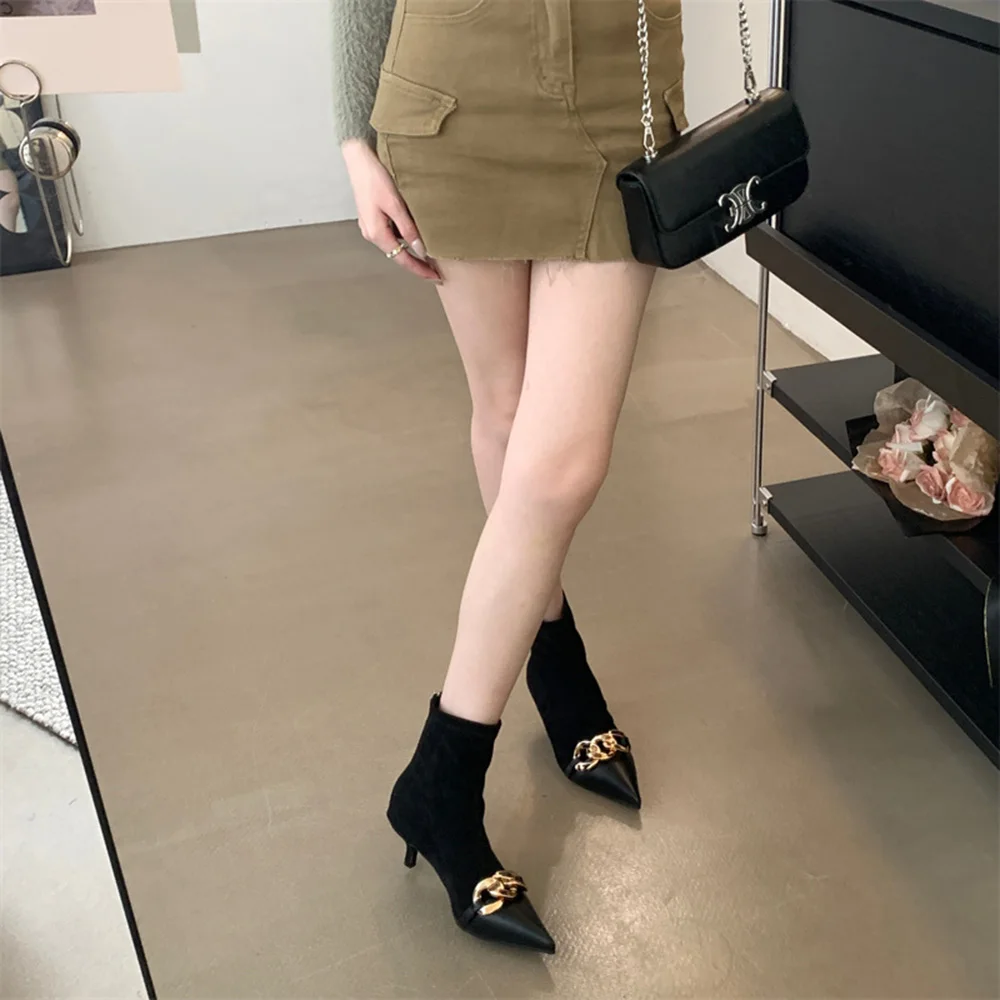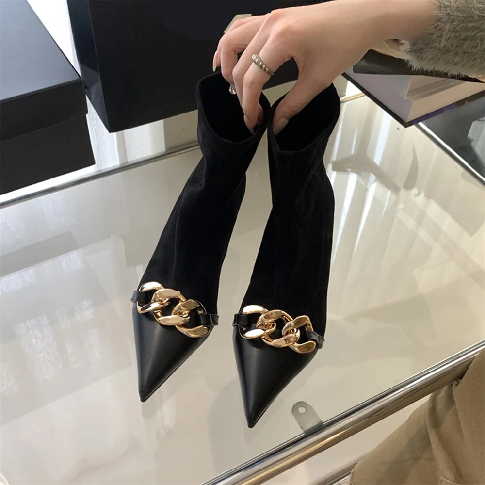 LBSFY - 2024 New Arrivals Women Ankle Boots Chelsea Botas Thin Mid Heels Metal Chain Size 35-40 Autumn Winter Sock Botas Size 35-40