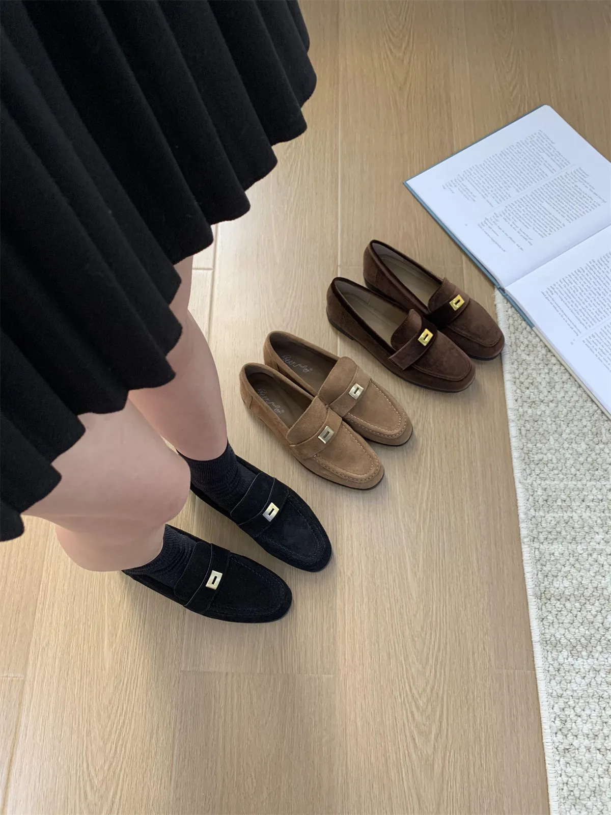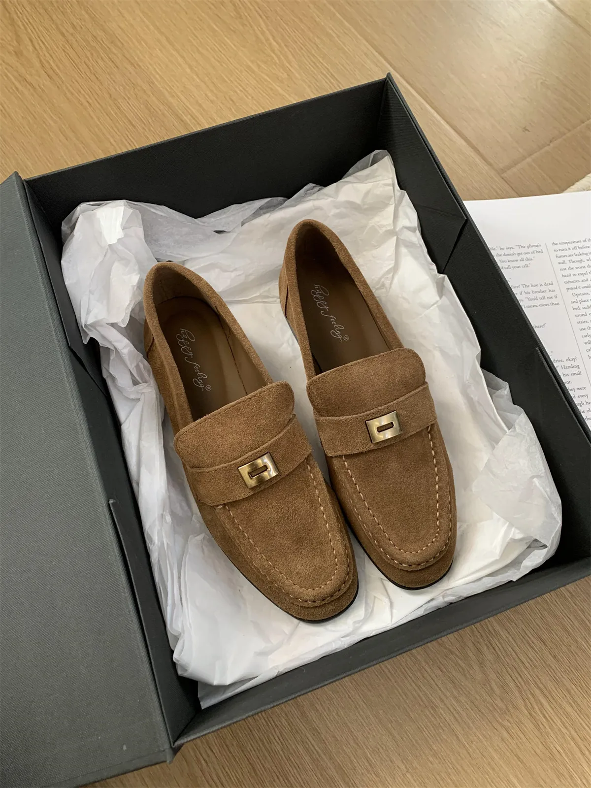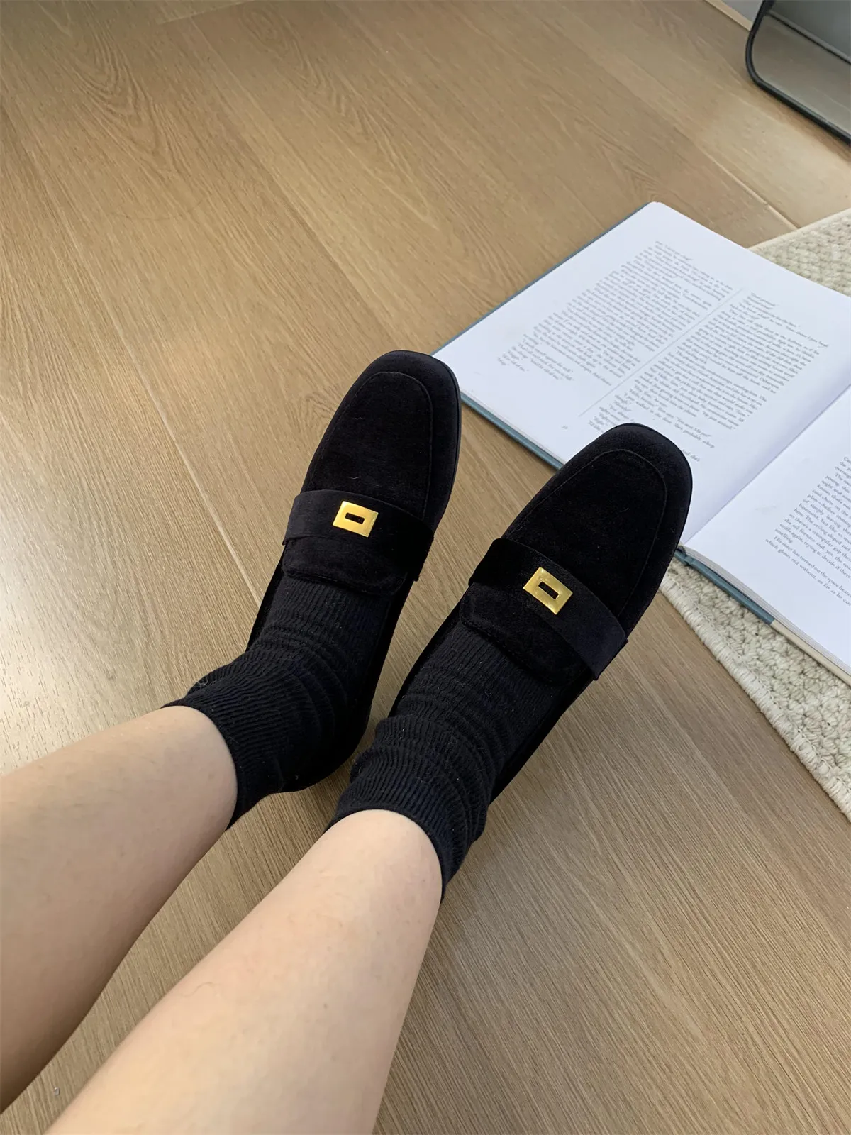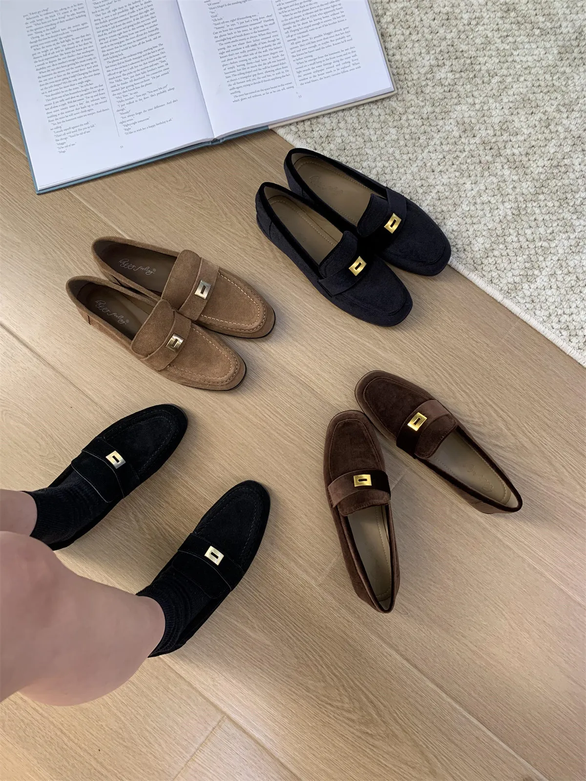 LBSFY - 2024 New Brand Women Flat Shoes Fashion Round Toe Flat Heel Slip On Laofer Shoes Casual Outdoor Gold Buckle Ballerinas