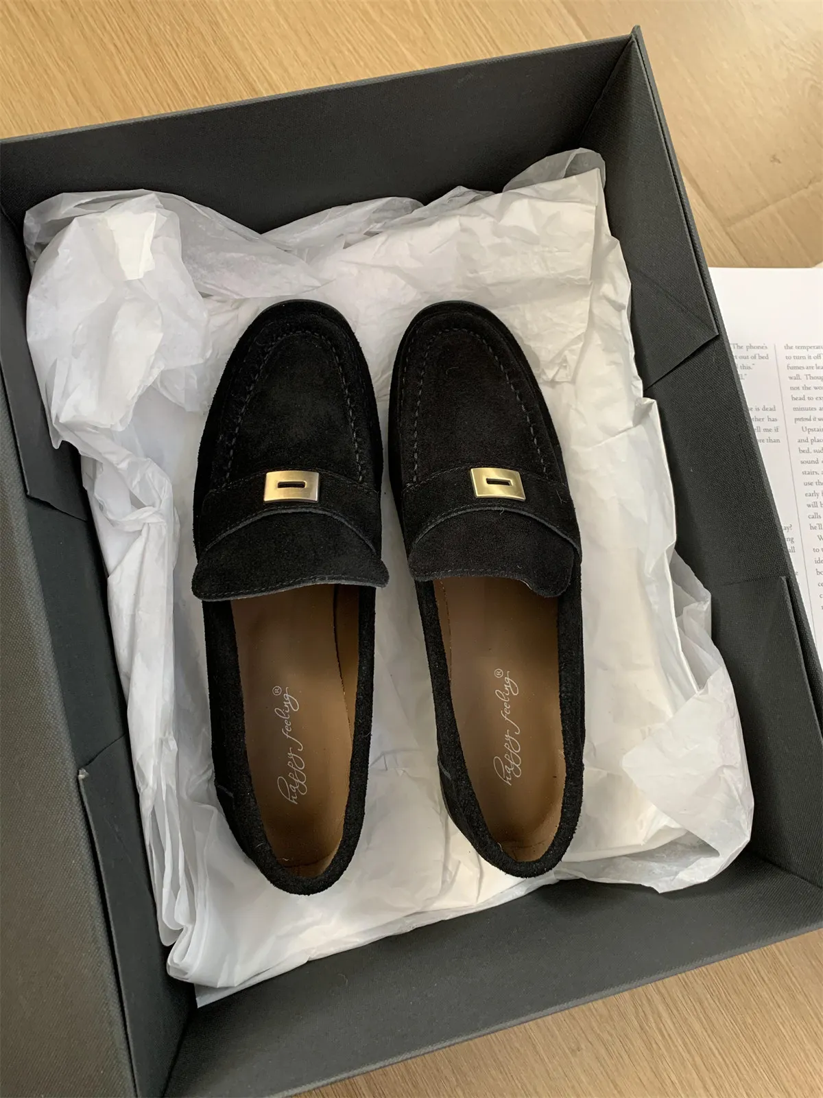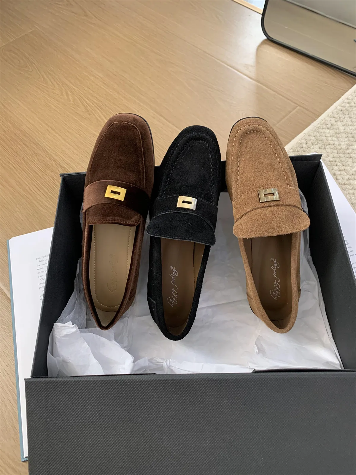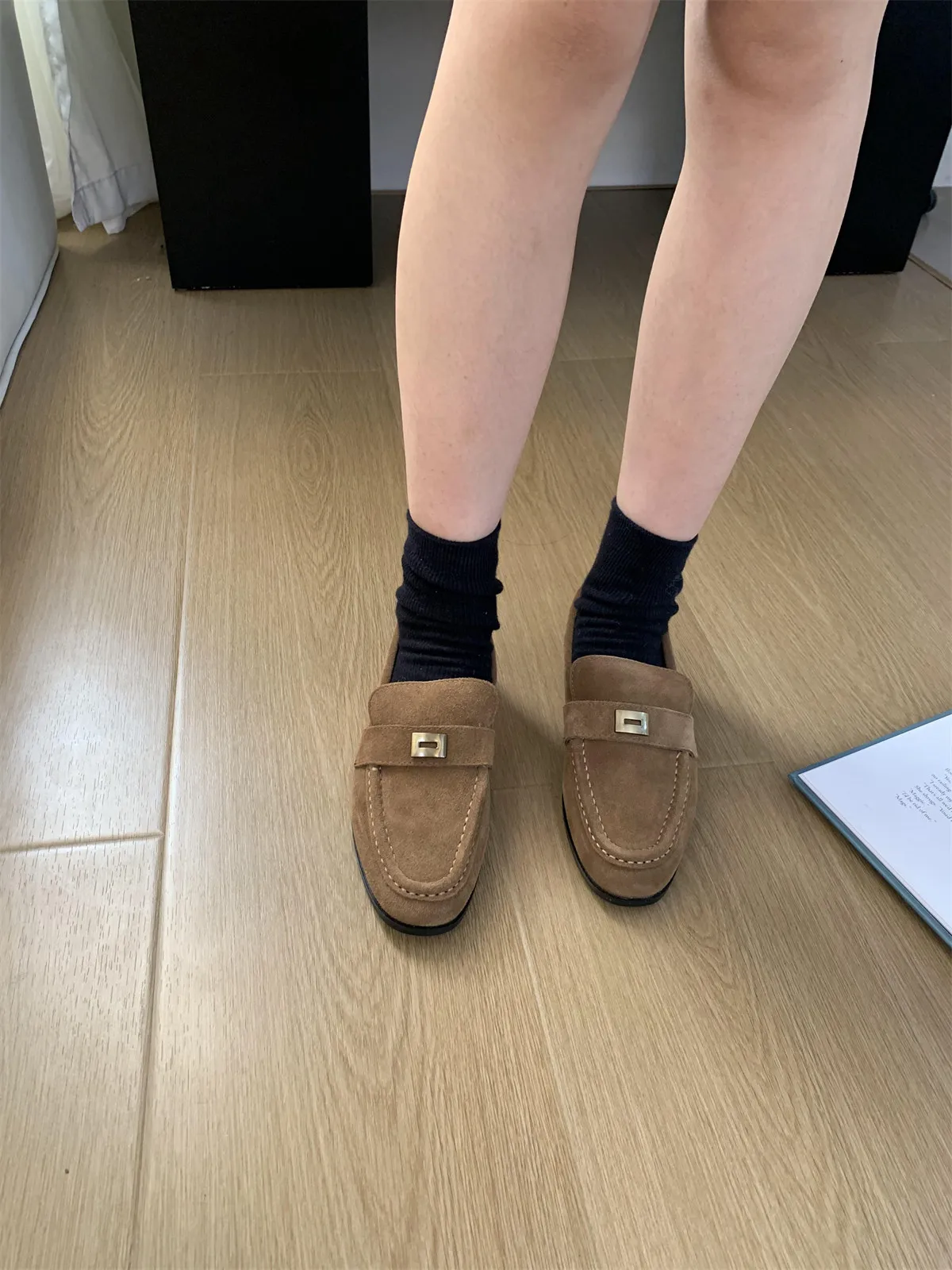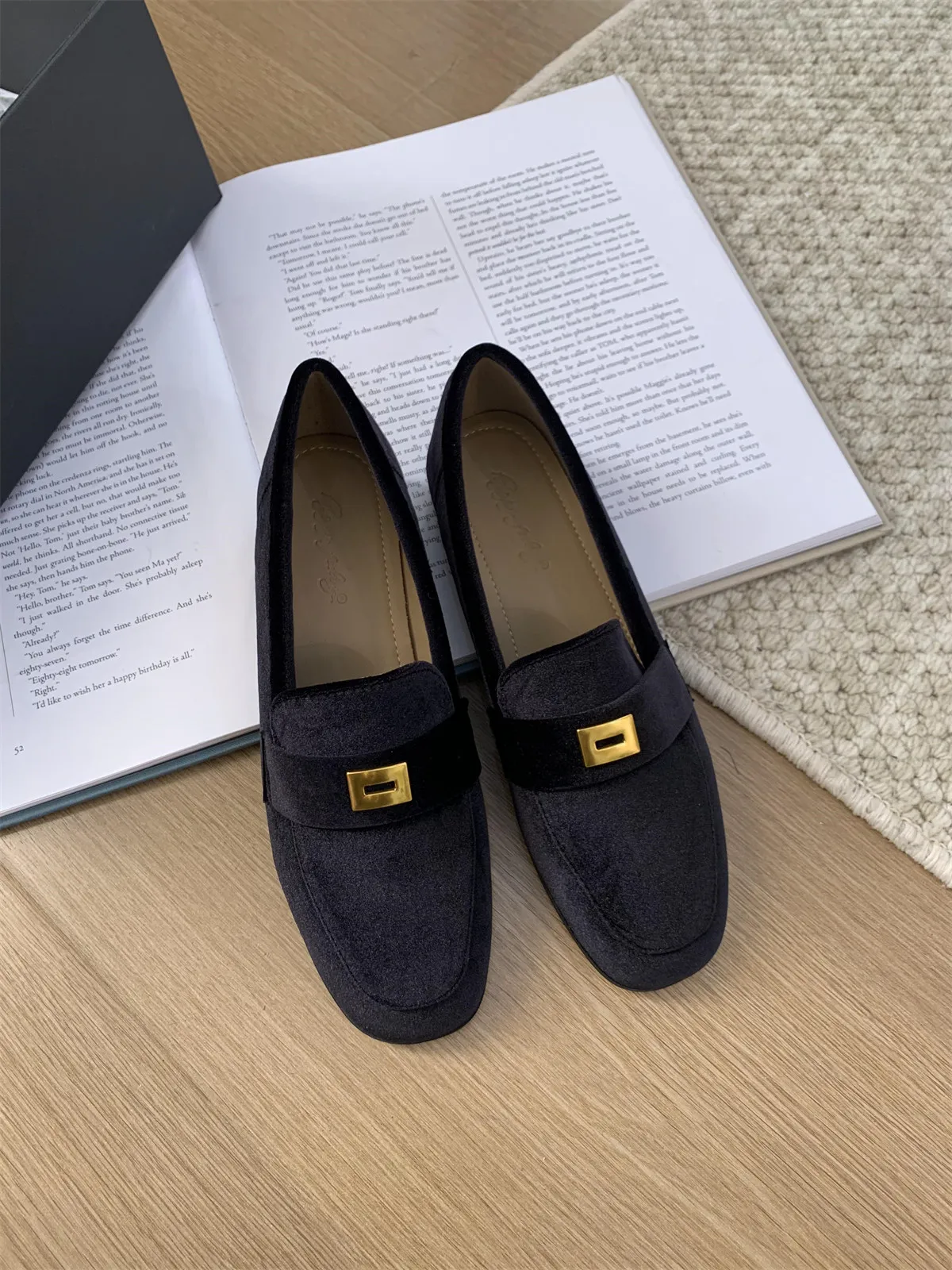LBSFY - 2024 New Brand Women Flat Shoes Fashion Round Toe Flat Heel Slip On Laofer Shoes Casual Outdoor Gold Buckle Ballerinas