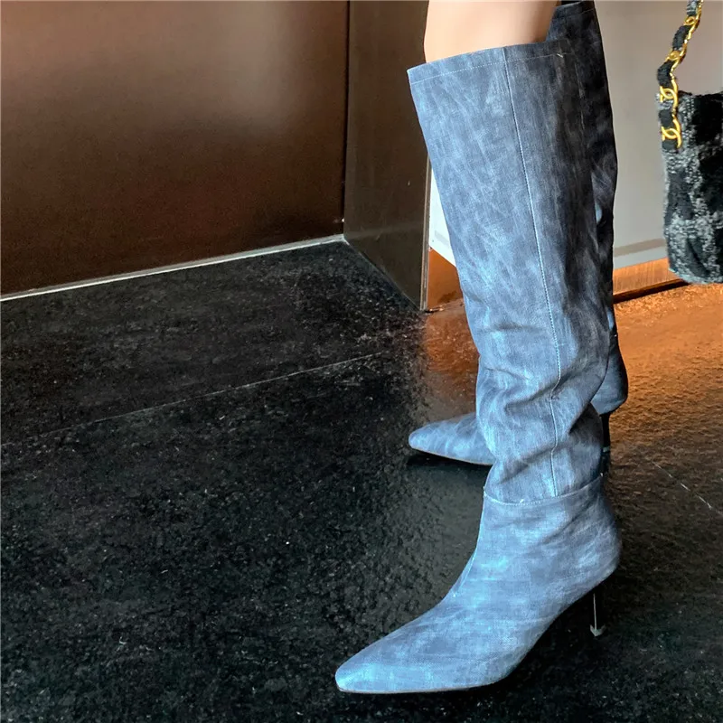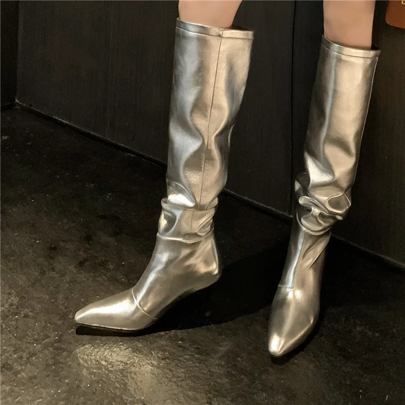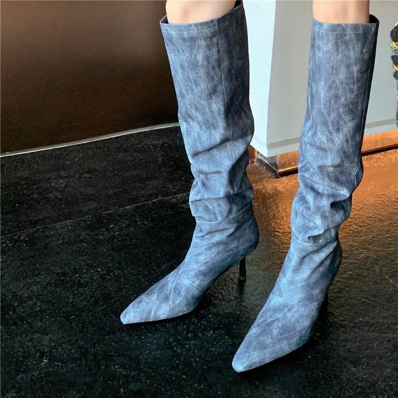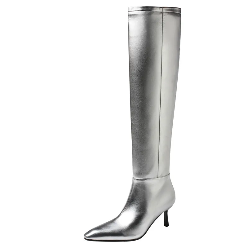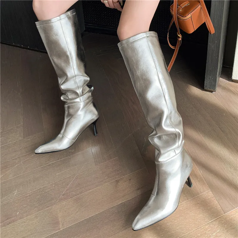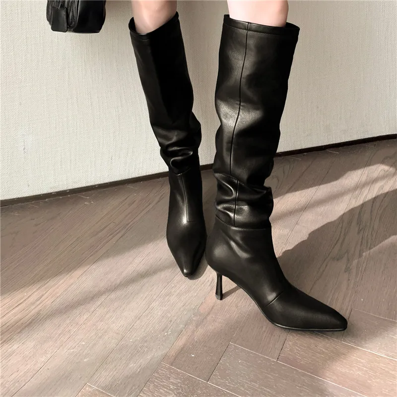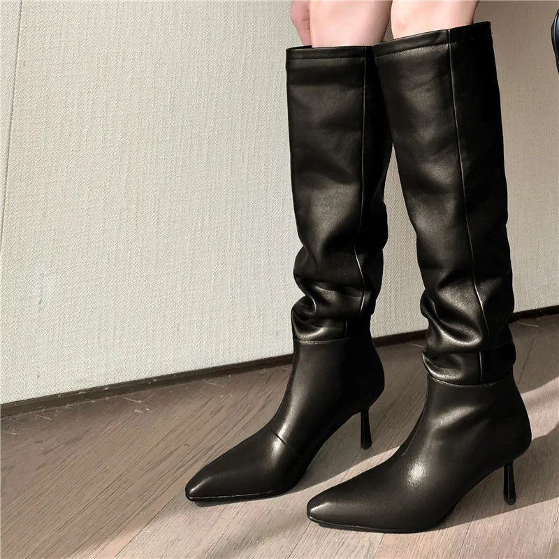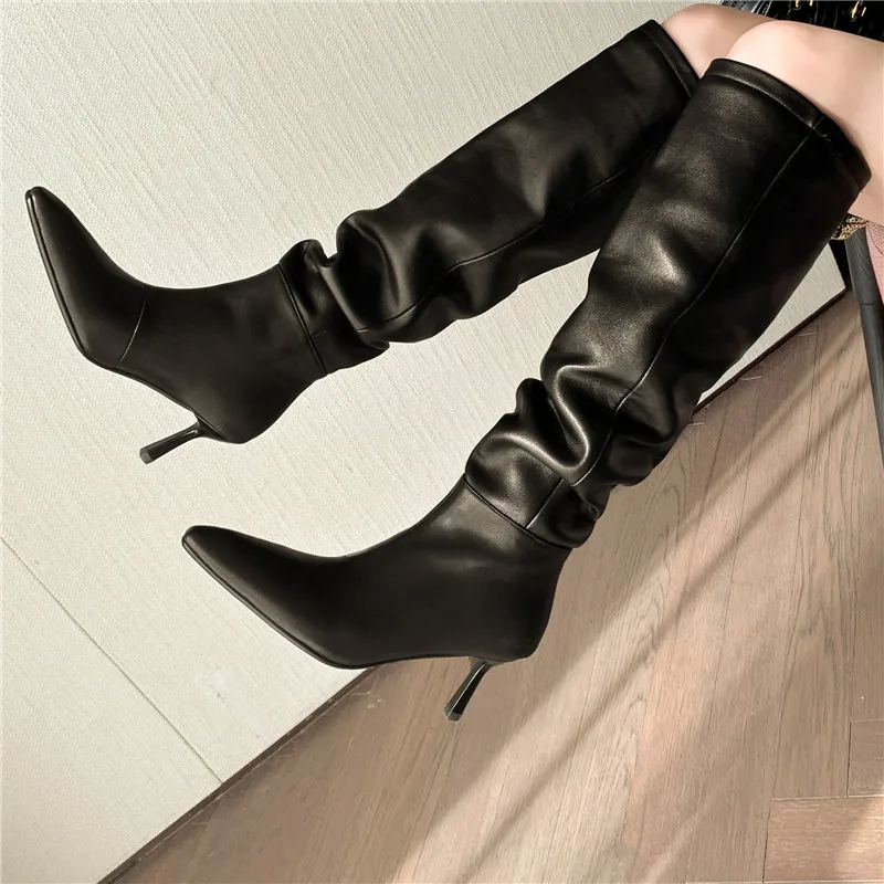 LBSFY - 2024 New Fashion Slip On Over The Knee Boots Pleated Genuine Leather Boots For Women Thin High Heels Winter Boots