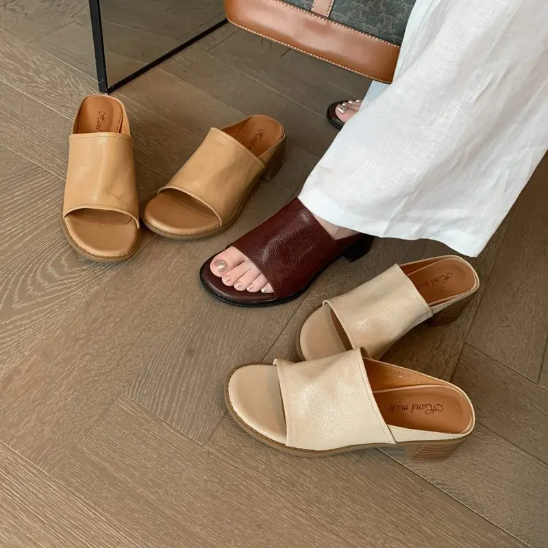 LBSFY - 2024 New Genuine Leather Shoes Women Slippers Chunky High Heels Office Dress Shoes Ladies Daily Footwear