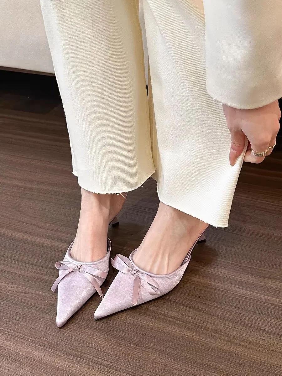 LBSFY - 2024 New Summer Elegant Purple Pointed Toe Half Slippers Bow Fine Heeled High Heels Sandals Heels Women