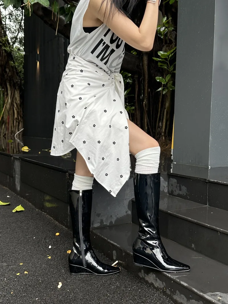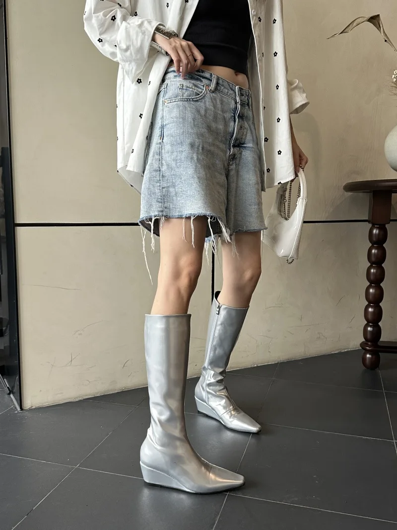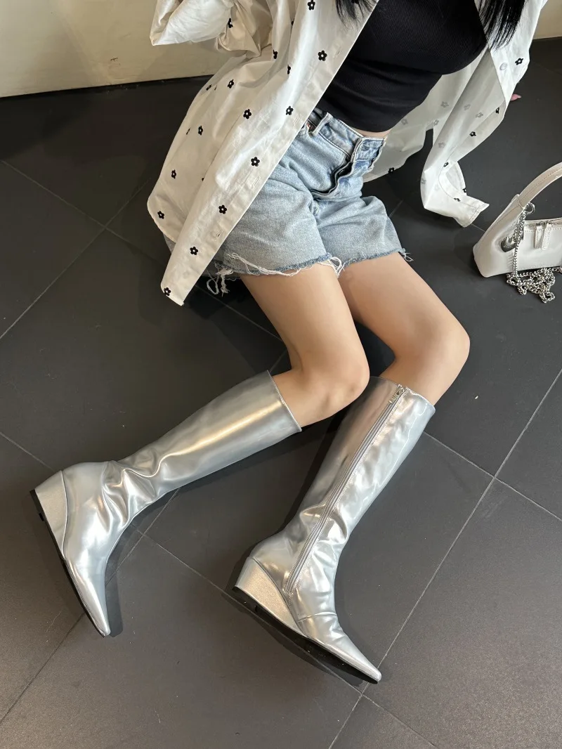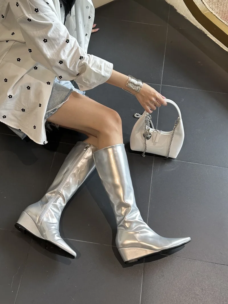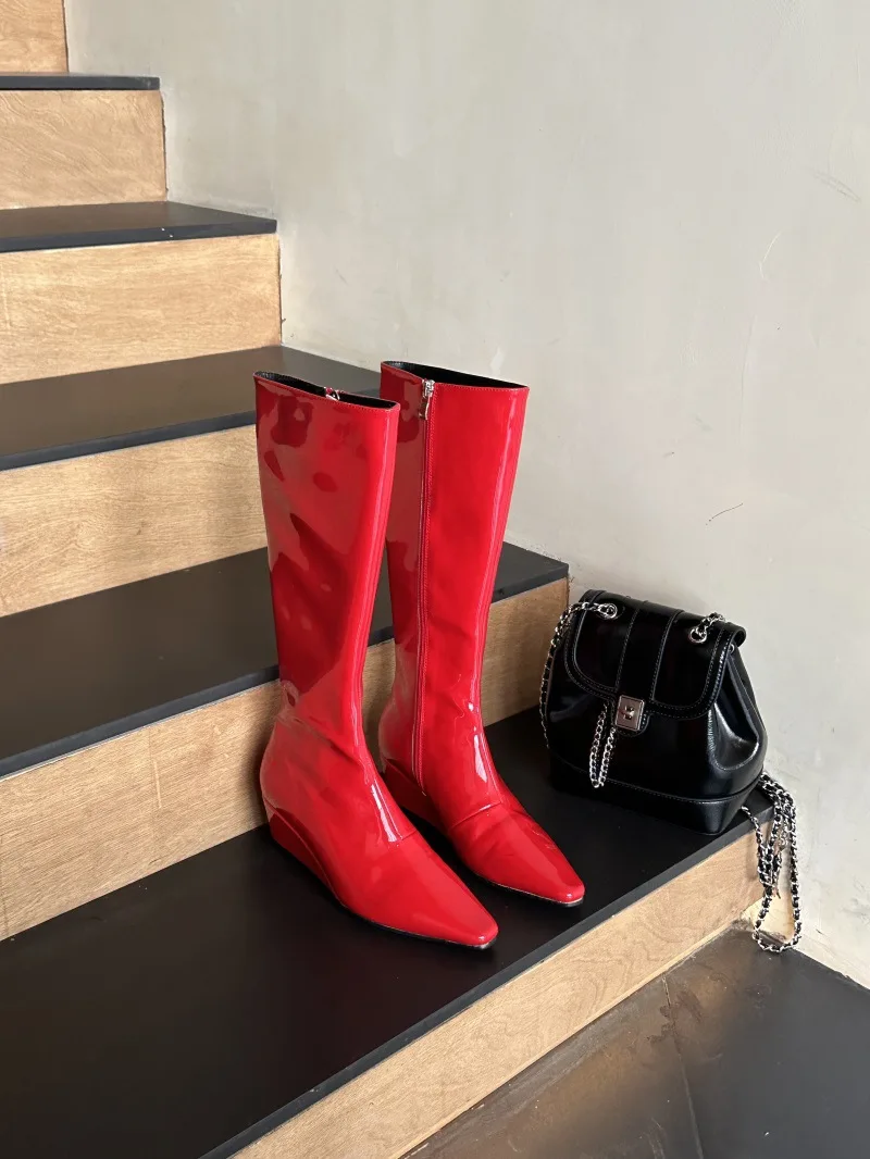 LBSFY - 2024 Shinpo Heel Lacquer Leather Pointed Long Boots Women's Underknee Knight Boots Slim Legged Long Boots Straight Boots