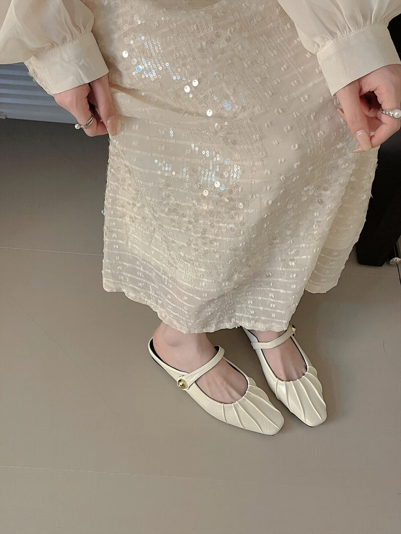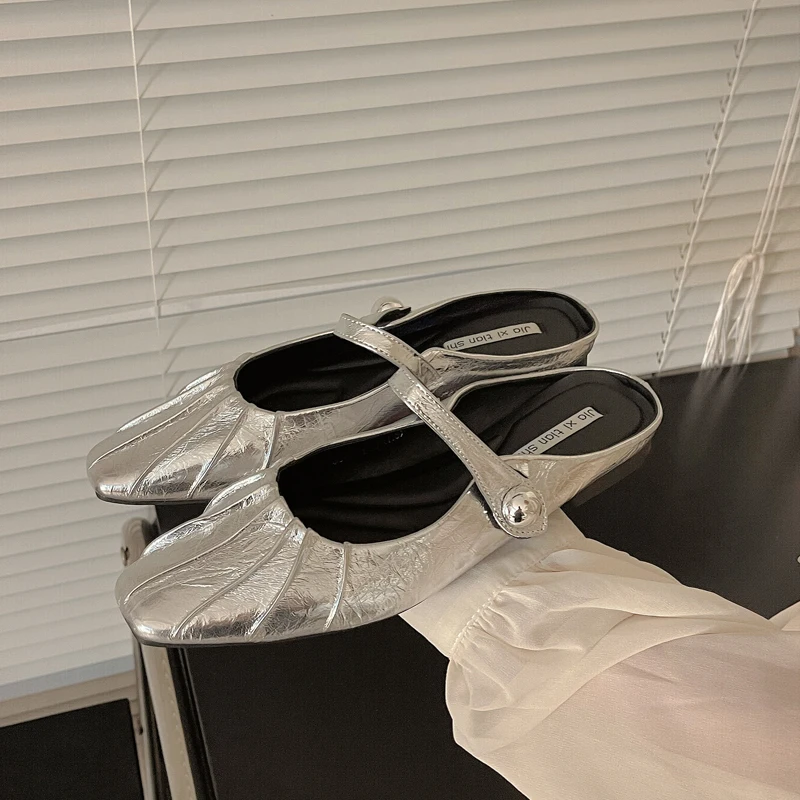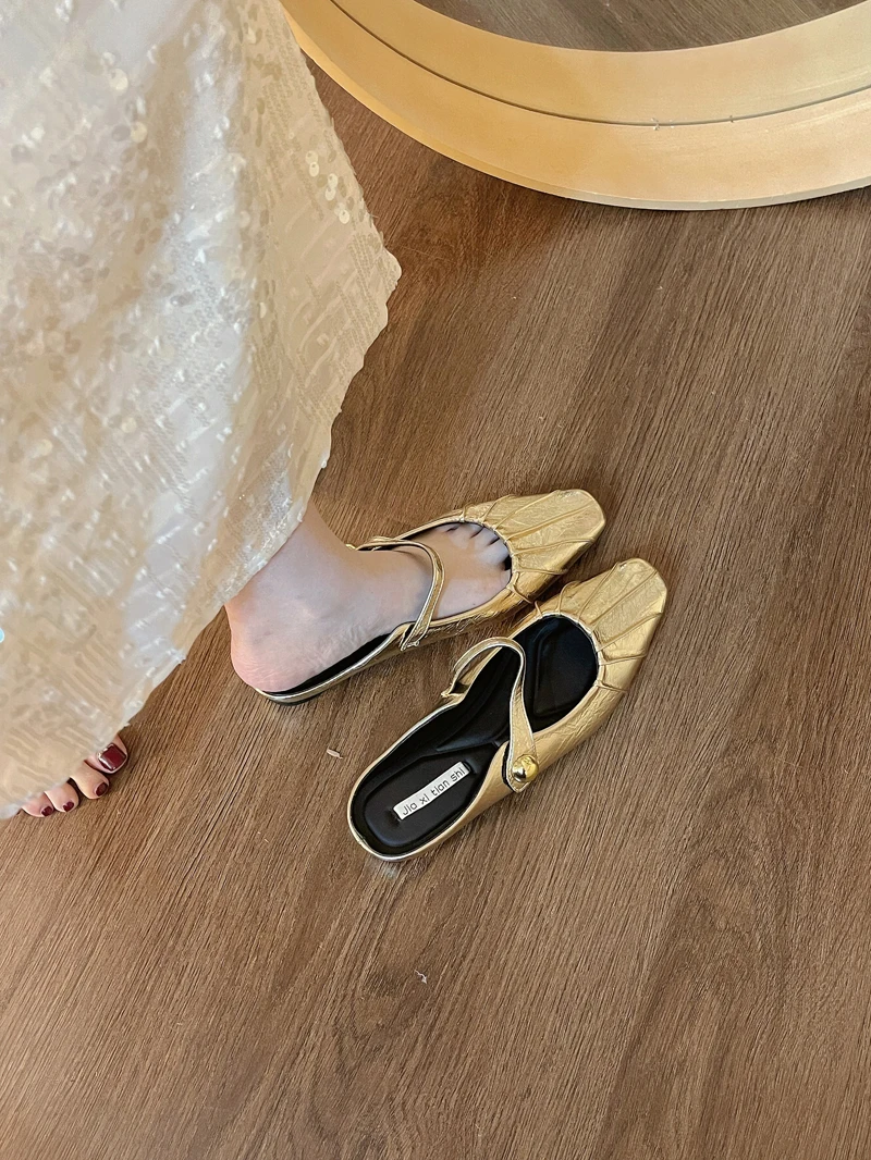 LBSFY - 2024 Spring Gold New Brand Women Slipper Fashion Pleated Round Toe Slip On Mules Shoes Round Toe Outdoor Dress Sandal Shoes