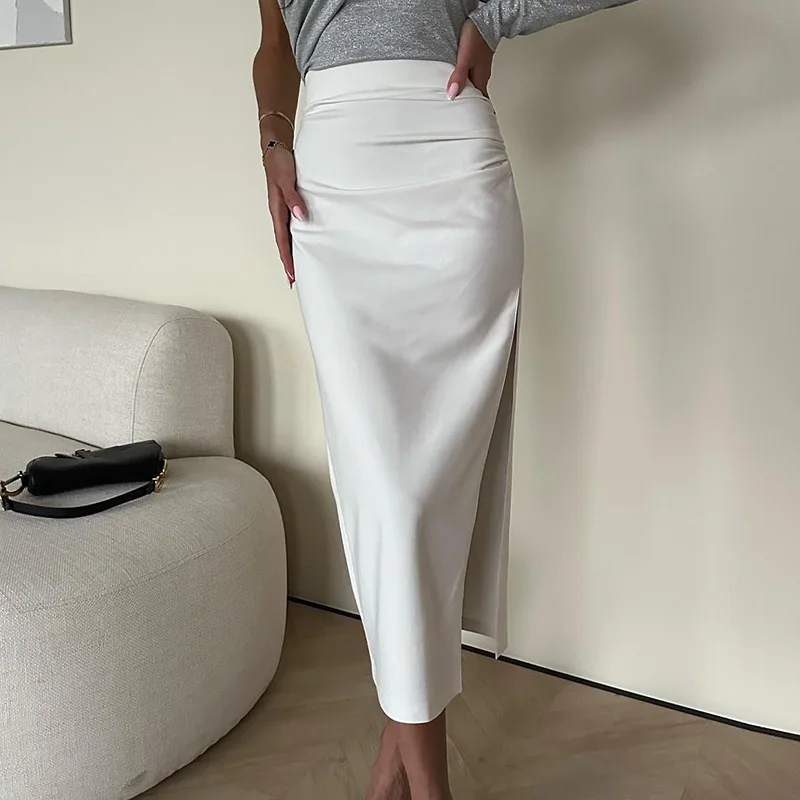 LBSFY - 2024 Women's Temperament Solid Wrap Hip Skirts Fashion Split Slim Commuting A-line Skirt Casual Elastic Waist Draped Half Skirt