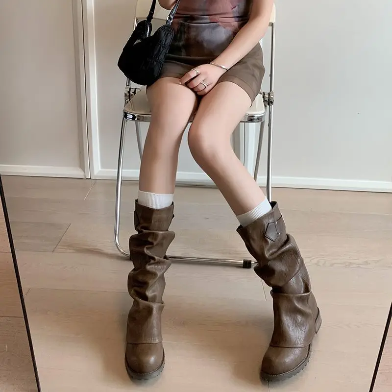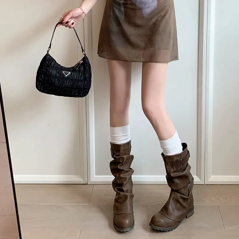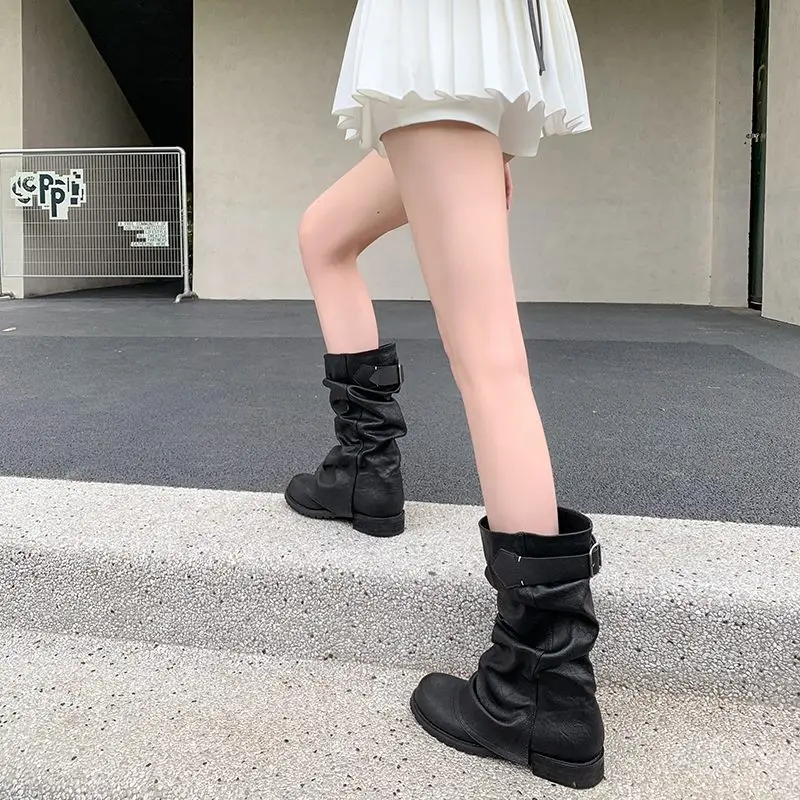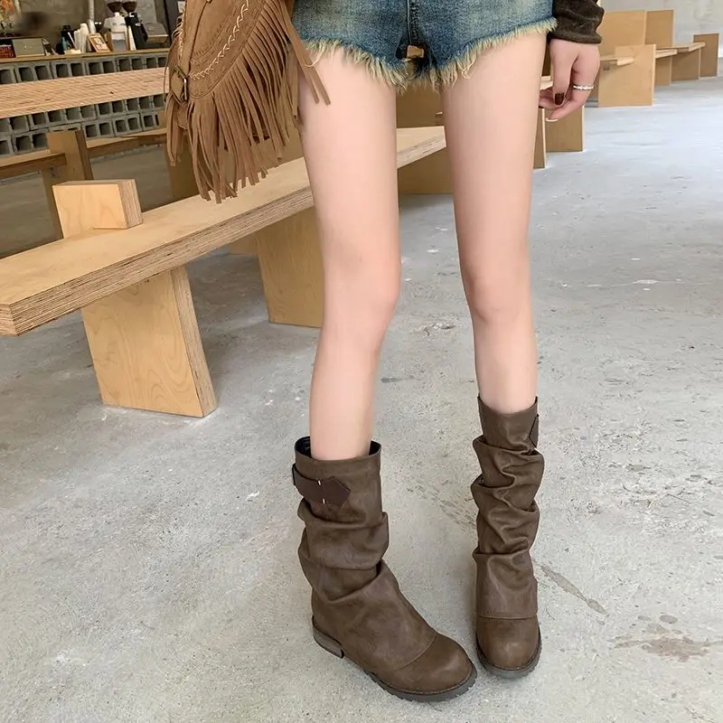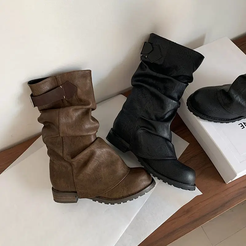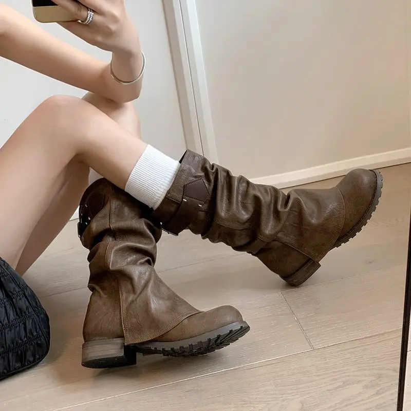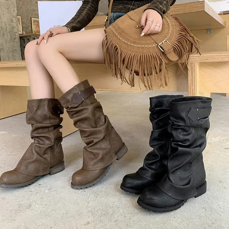 LBSFY  -  2025 New Genuine Leather Boots Women Pleated Mid Calf Boots Handmade Retro Western Boots Ladies Shoes