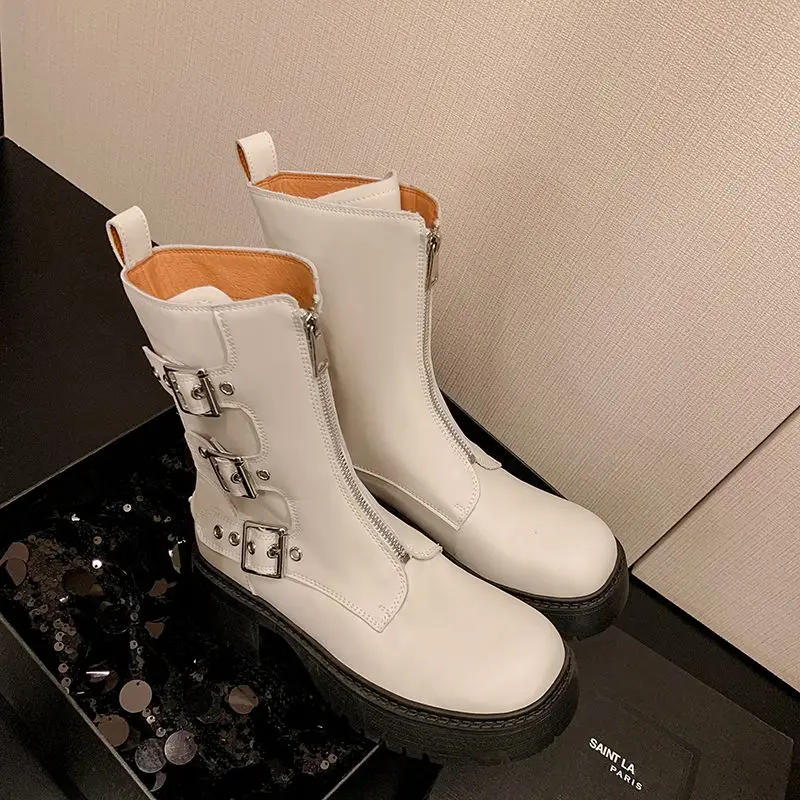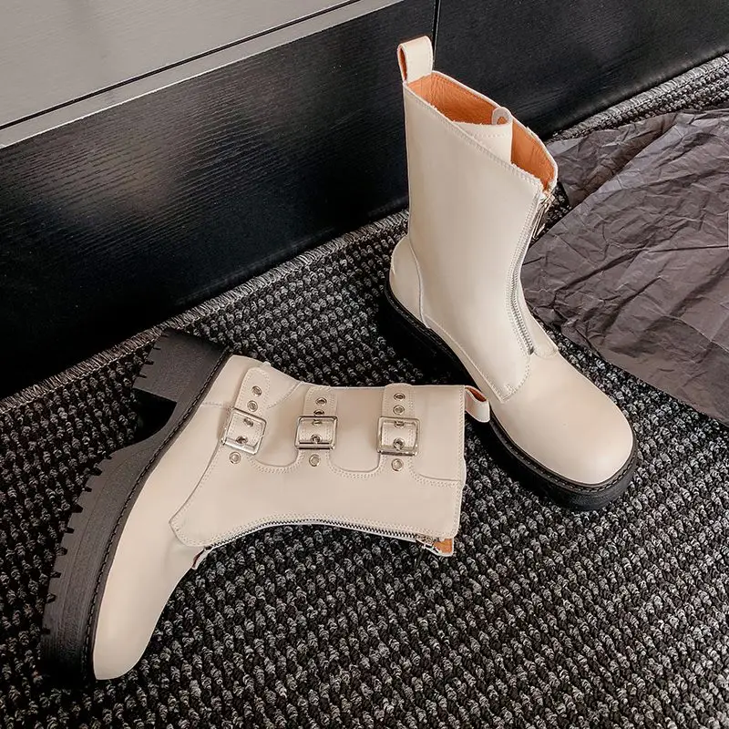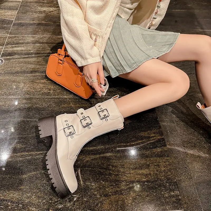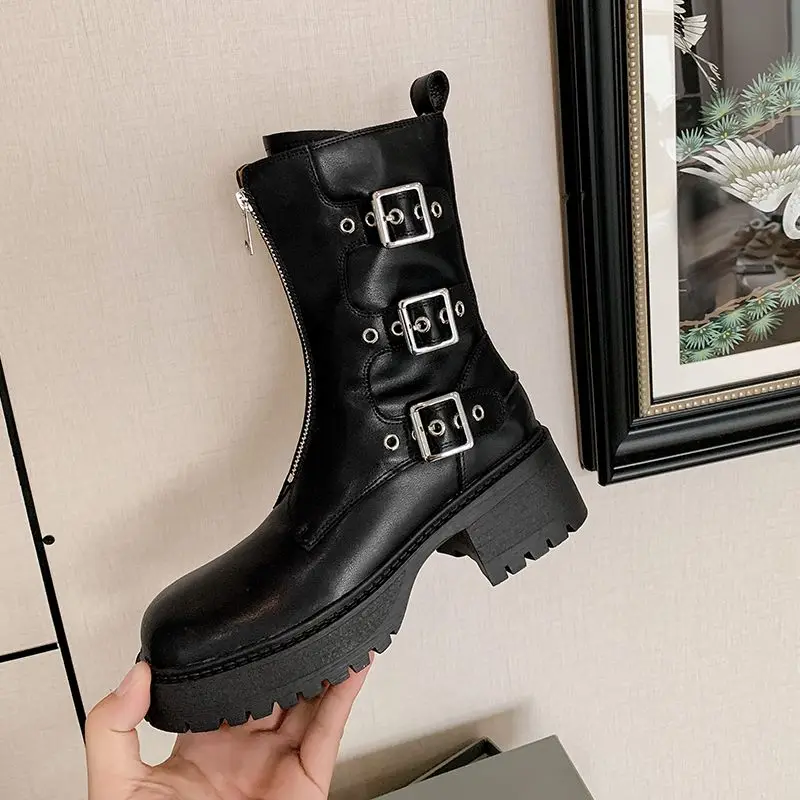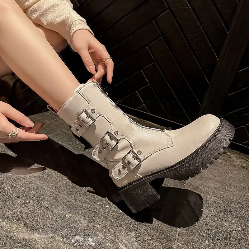 LBSFY - 2025 New Women's Ankle Boots Buckle Zipper Square High Heels Motorcycle Boots Handmade Autumn Winter Ladies Shoes