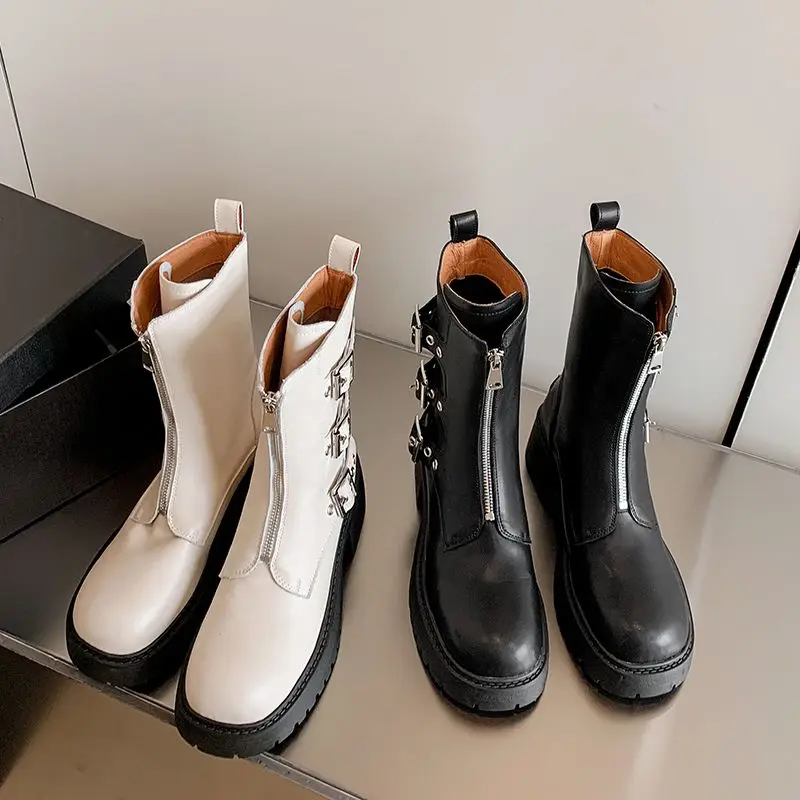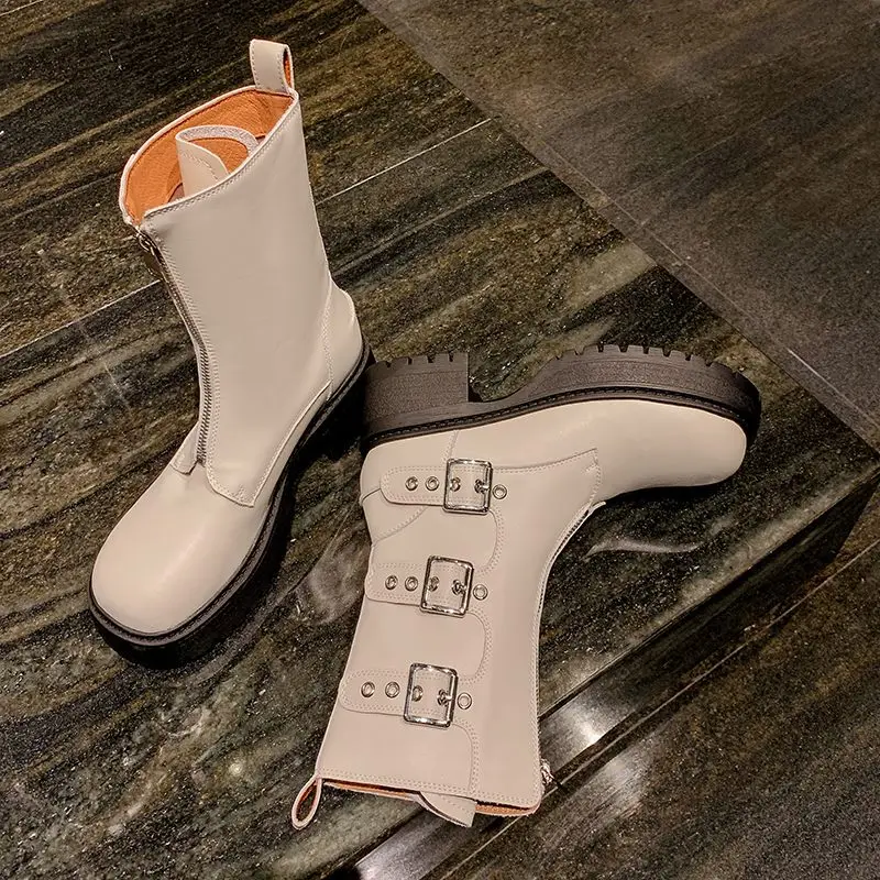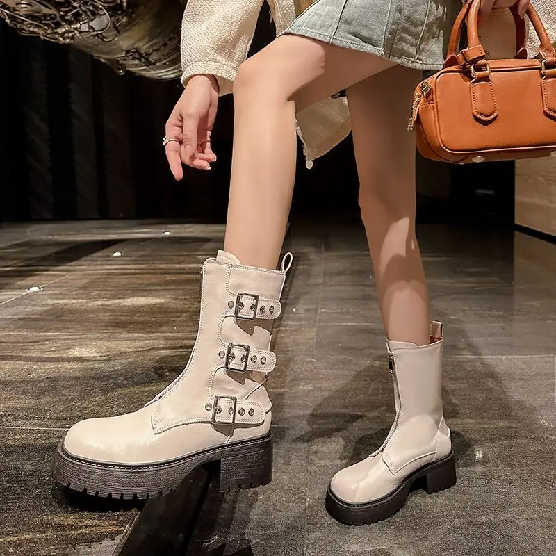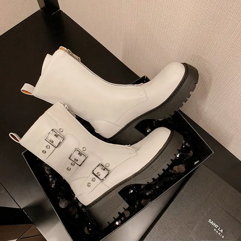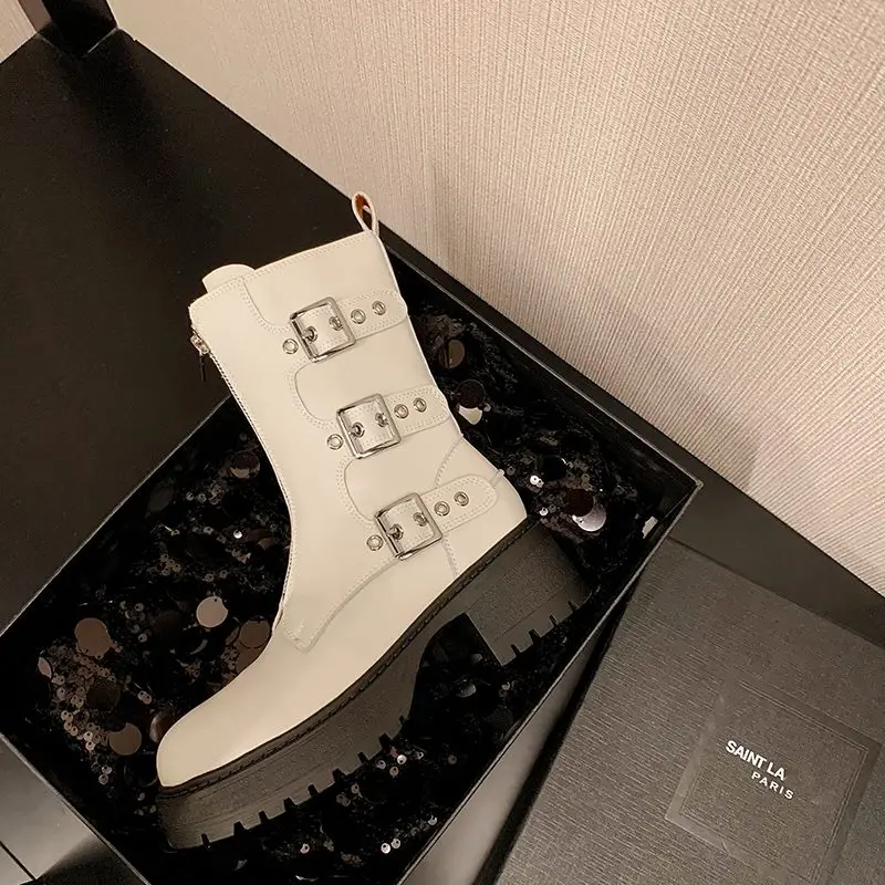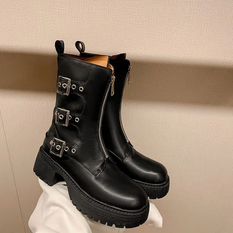LBSFY - 2025 New Women's Ankle Boots Buckle Zipper Square High Heels Motorcycle Boots Handmade Autumn Winter Ladies Shoes