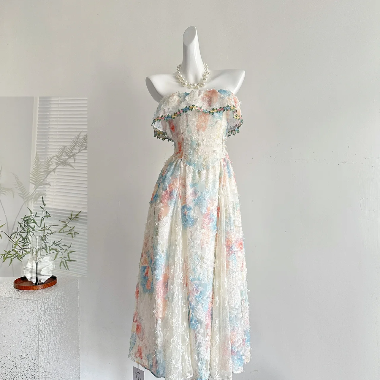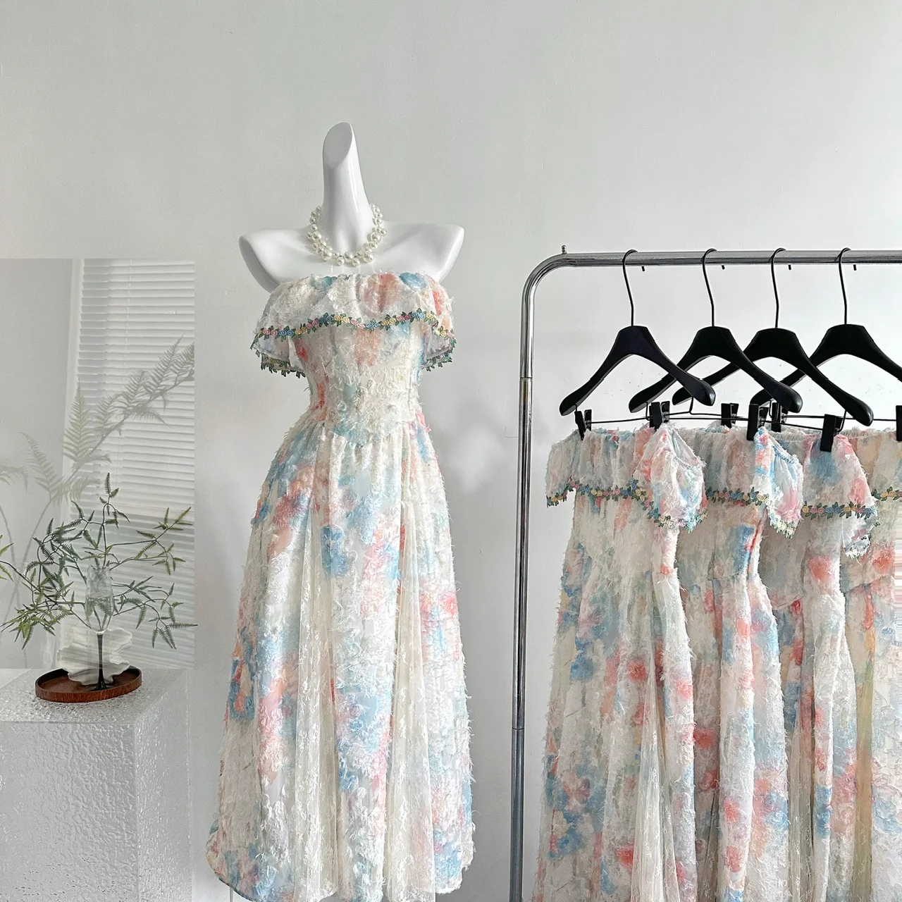 LBSFY -2025 Summer French Elegant Vacation Sweet Evening Dress Women Lace Strapless Long Vintage Dress Casual Original Design Clothes