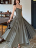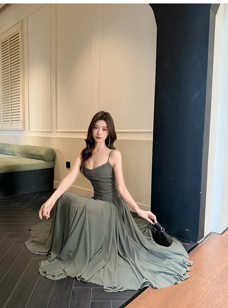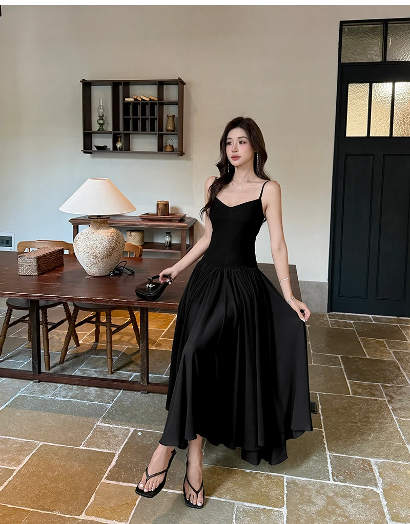 LBSFY -2025 Summer Office Lady Women's Dresses New Elegant V-Neck Slim Waist Pleated A-Line Long Sling Dress Holiday Casual Vestidos