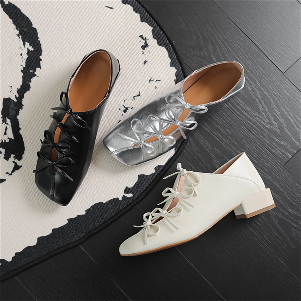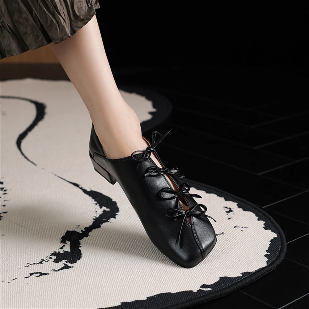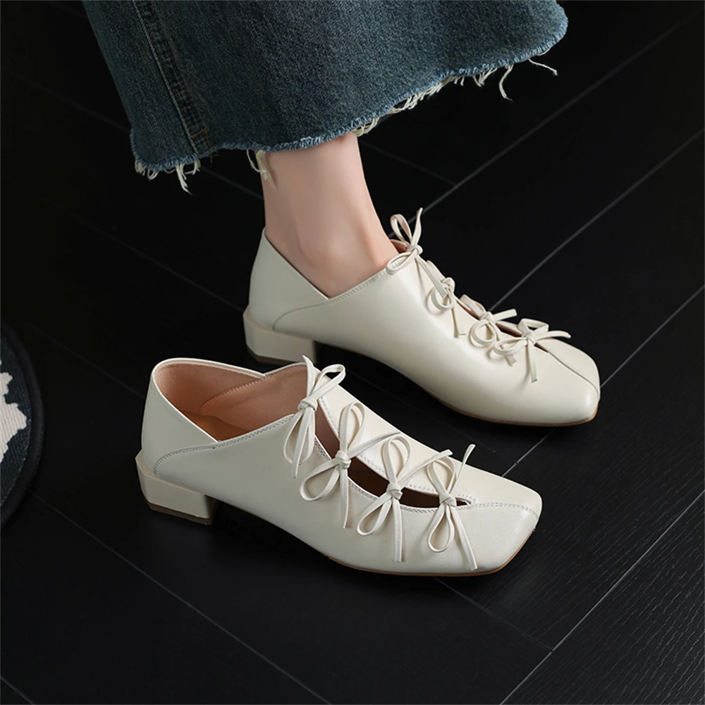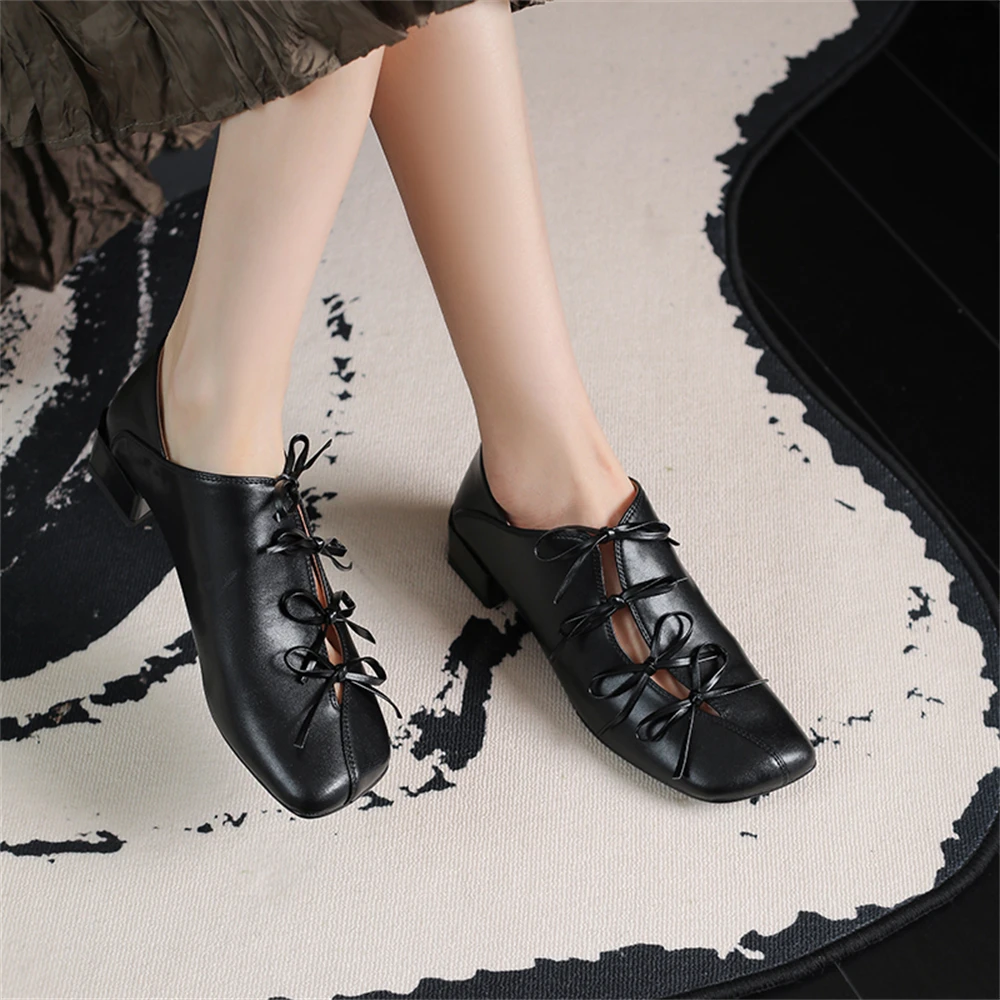 LBSFY  -  2025 Women Genuine Leather Square Toe Thick Heel Mature Sweet Dating Bowtie Party Wedding Shoes Woman Prom Pumps
