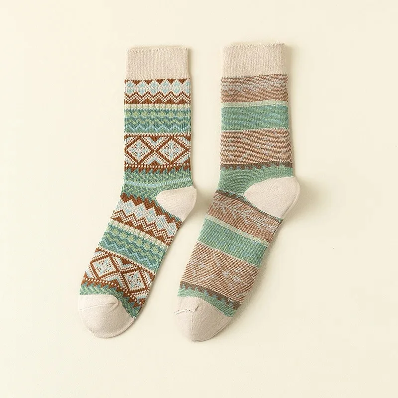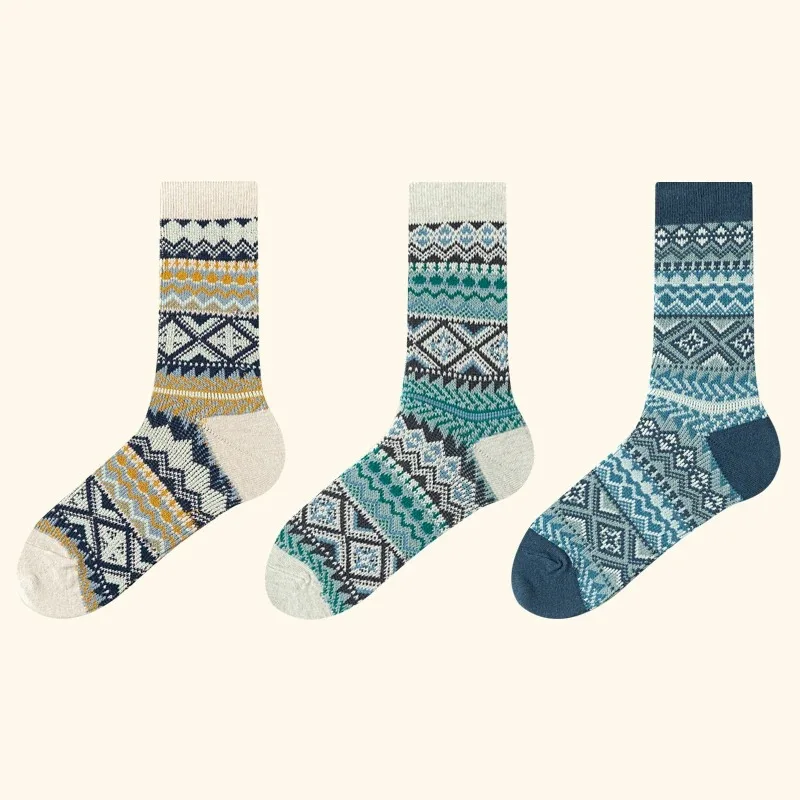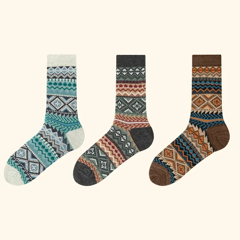 Lbsfy 3 Pairs Men's Retro Socks Ethnic Style Geometric Stripes Cotton Crew Socks Male Breathable and Sweat-absorbing Winter Warm Sock