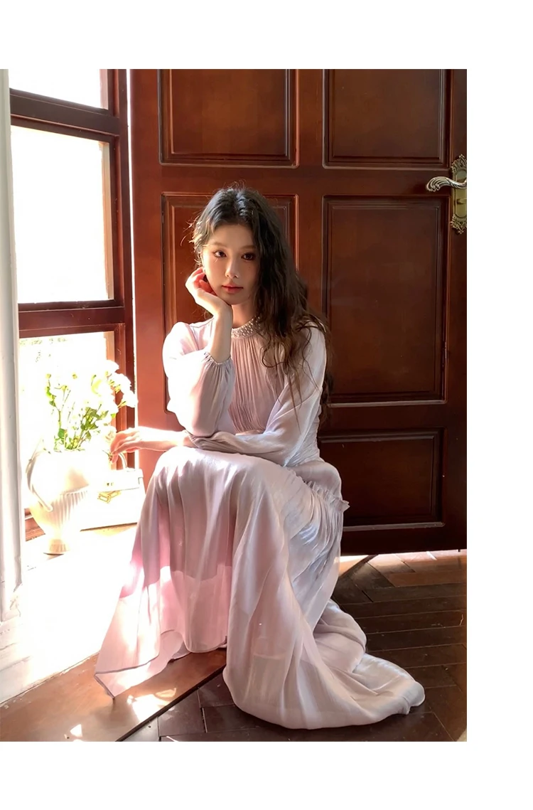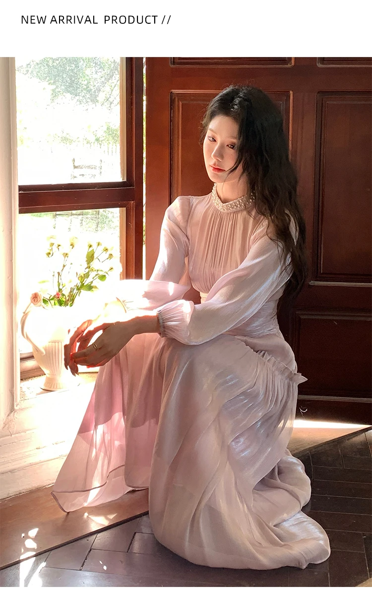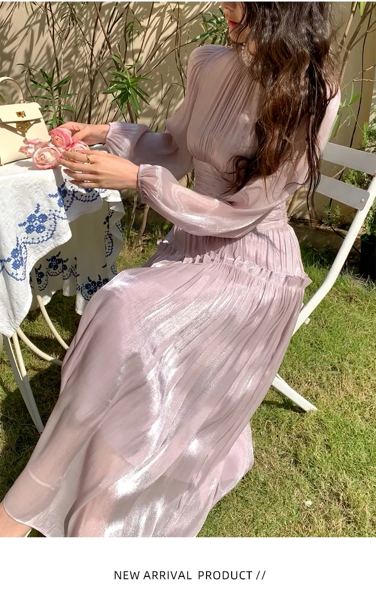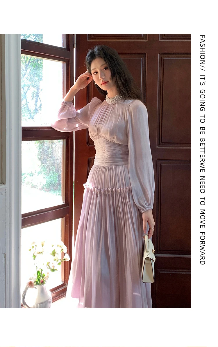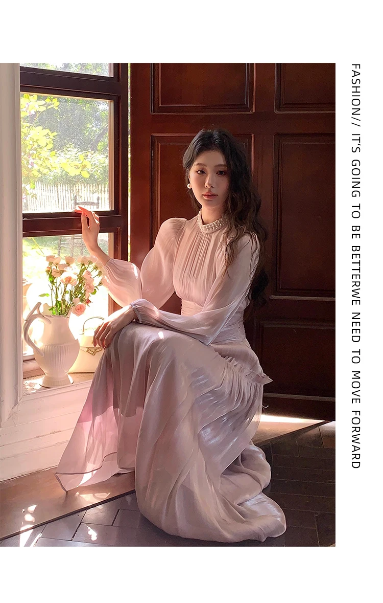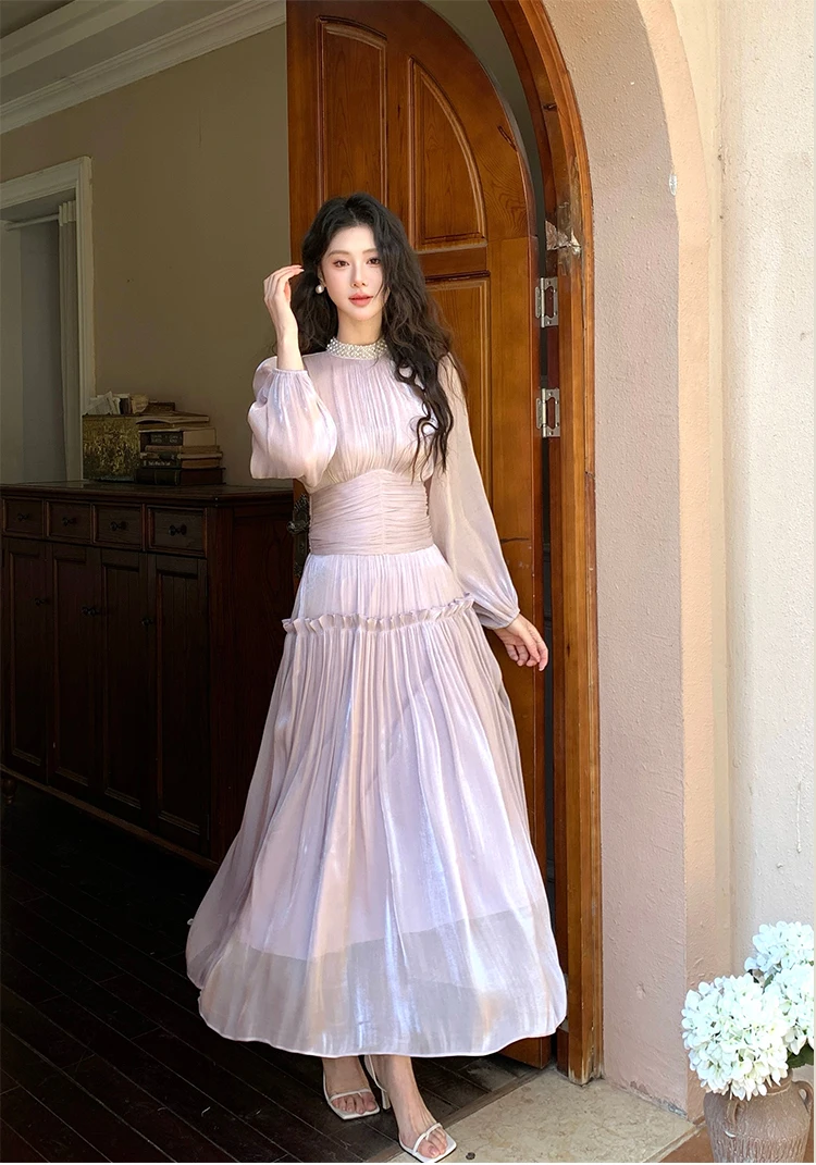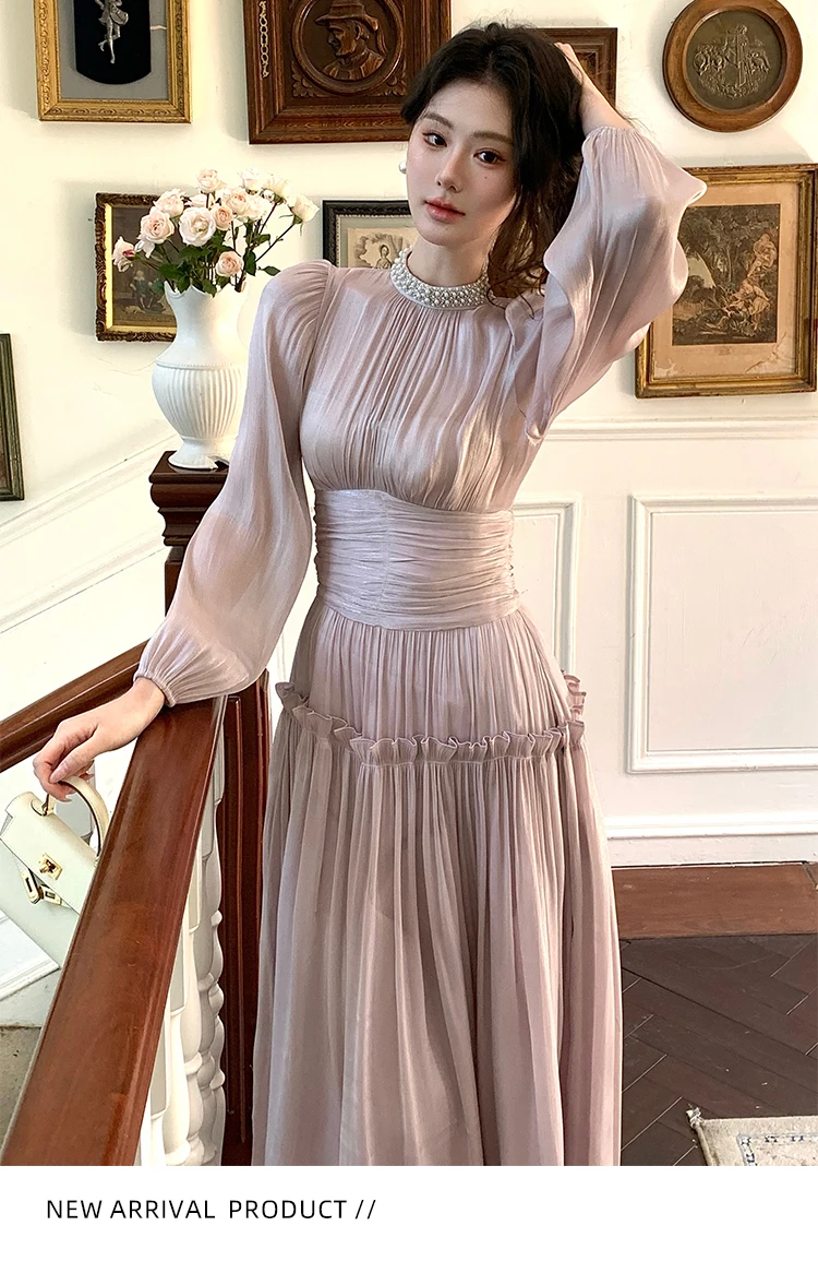 LBSFY -A-line Casual Nail Bead Vintage French style Party Dresses Spring Pleated Waist Cinched Long Bubble sleeve Dress