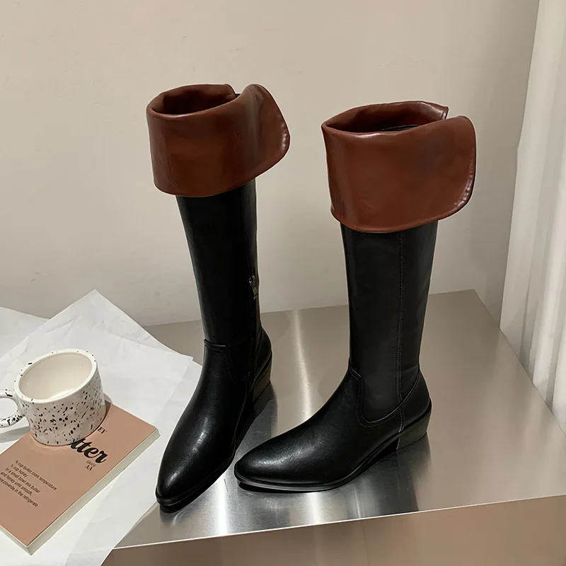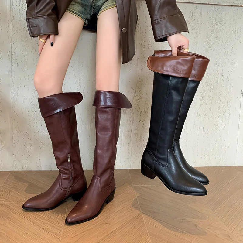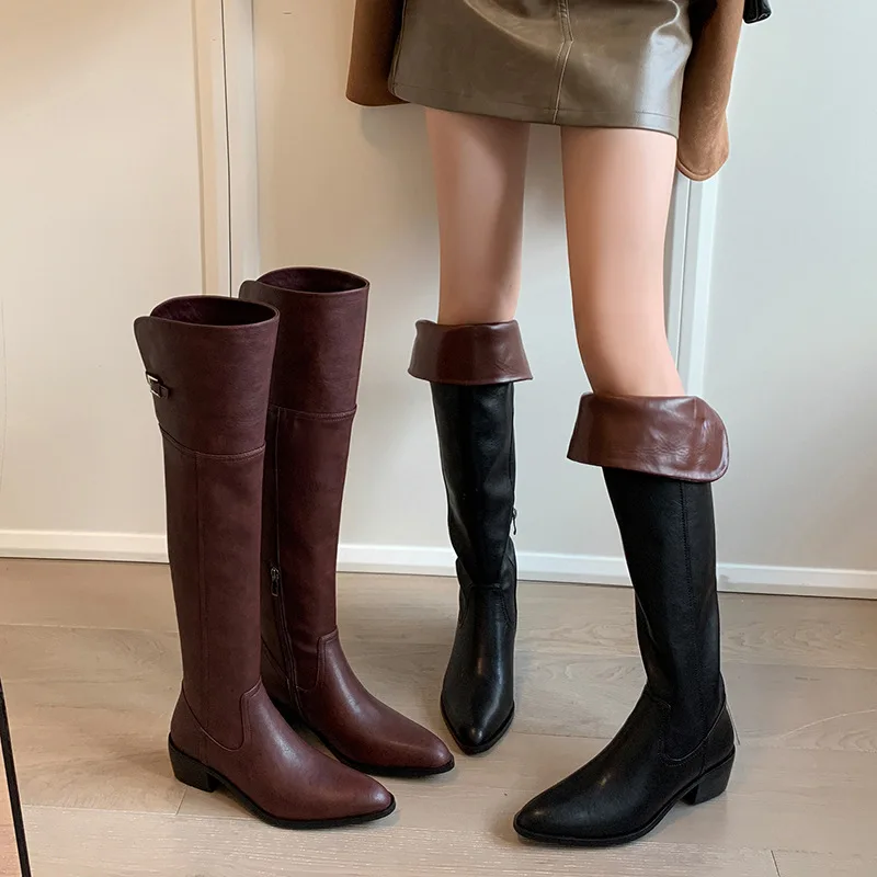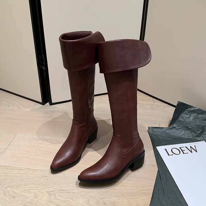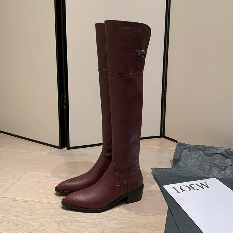 LBSFY - Angola Red Two Wear Cowhide Knee Over Boots New Pointed Coarse Heel Side Zipper Middle Heel Fashion Boots Large Boots