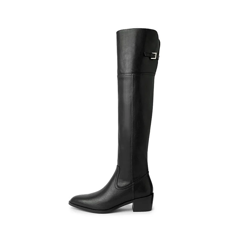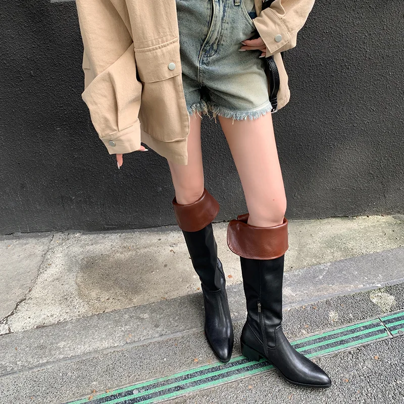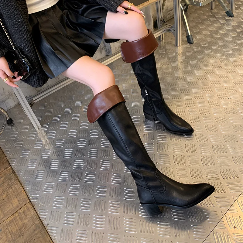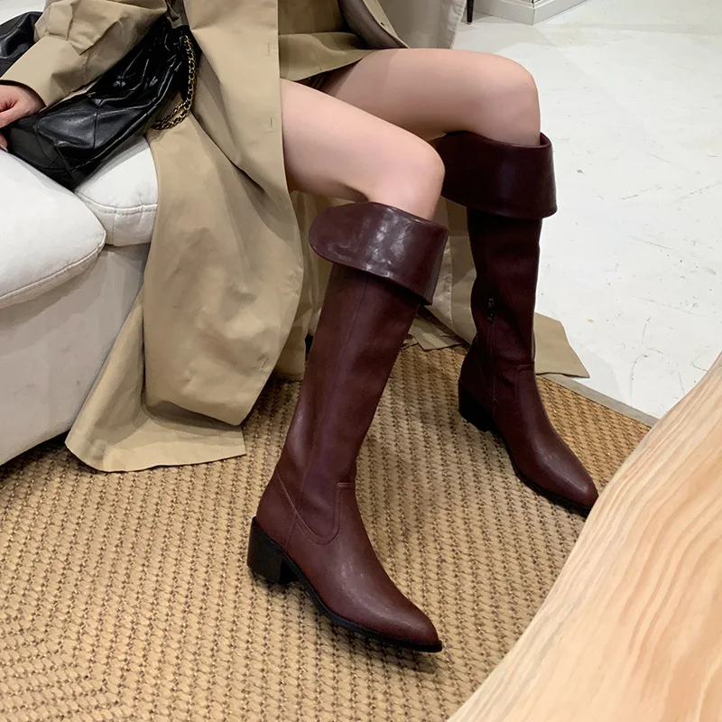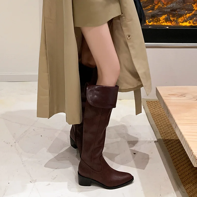 LBSFY - Angola Red Two Wear Cowhide Knee Over Boots New Pointed Coarse Heel Side Zipper Middle Heel Fashion Boots Large Boots