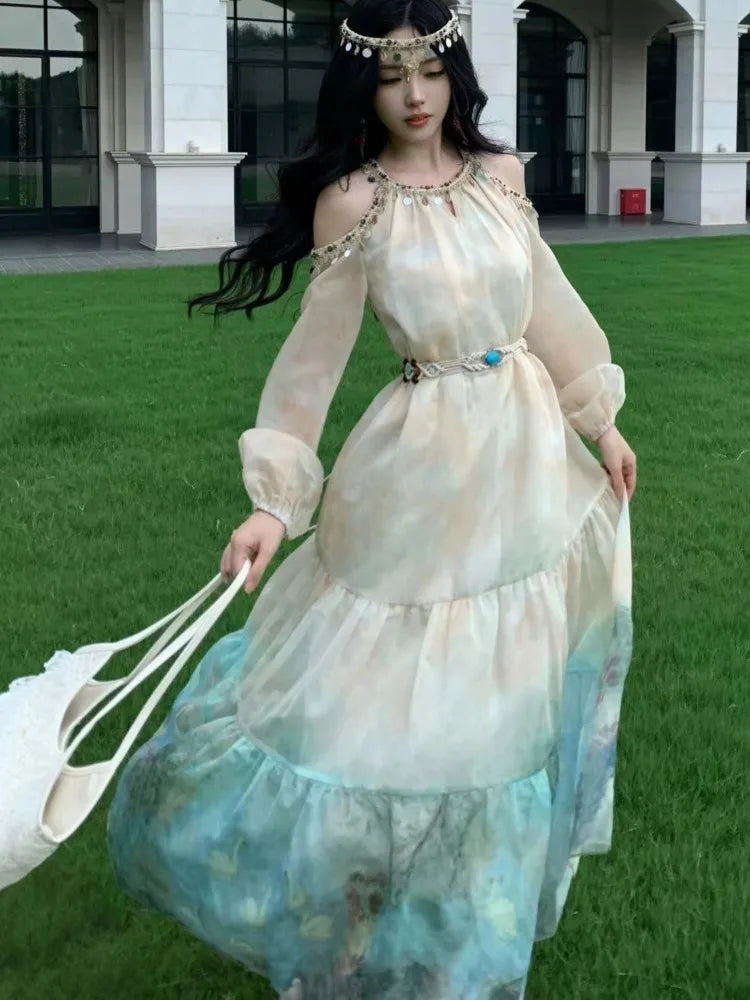 LBSFY -Autumn Printed Midi Dress for Women Vintage Off Shoulder Halter Long Sleeve Loose A-Line Casual Dresses Female Vestidos Mujer