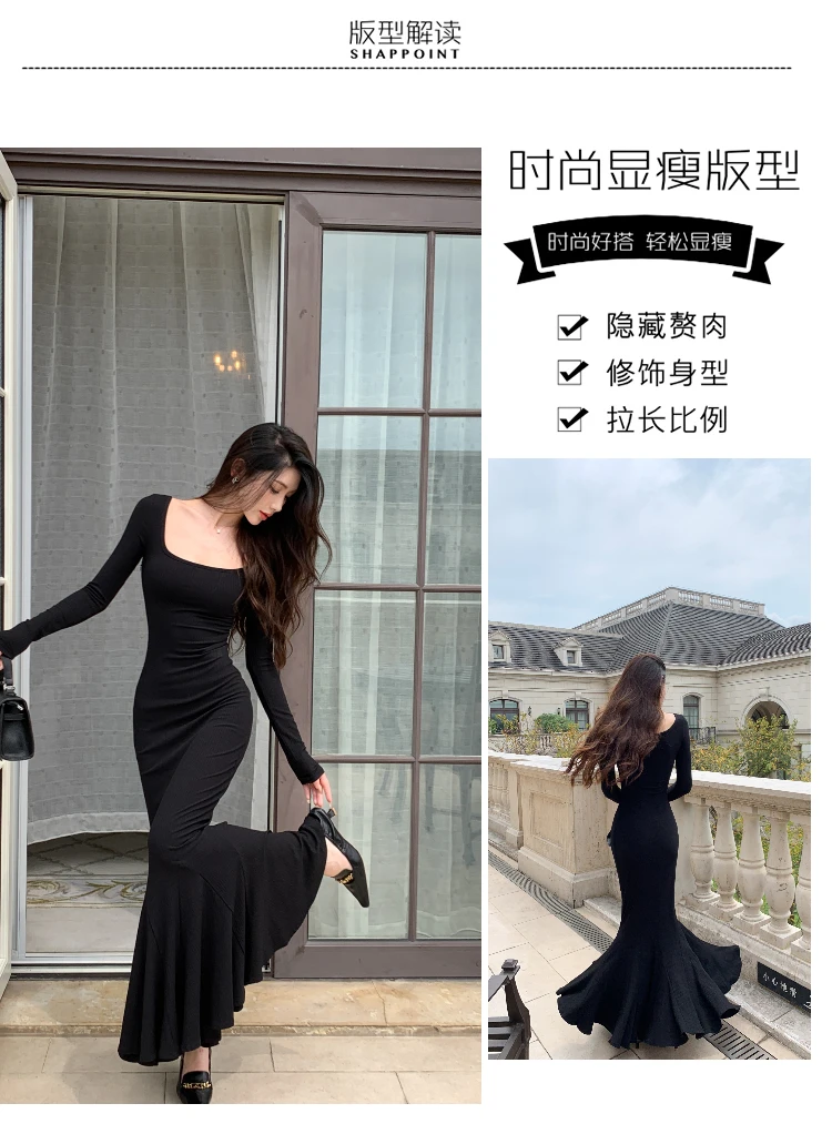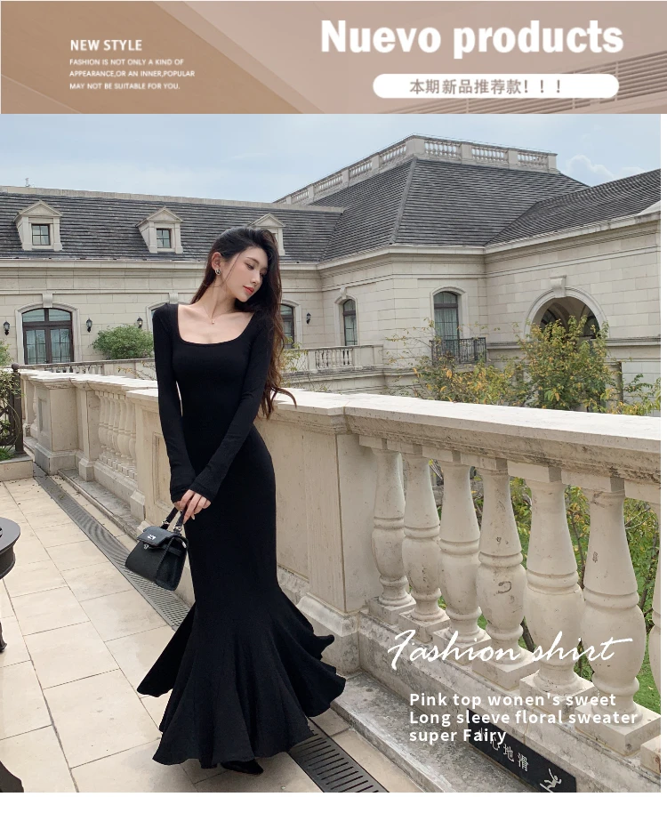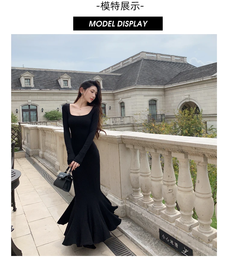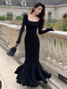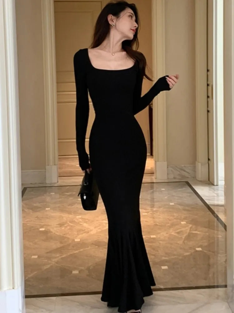 LBSFY -Autumn Sexy Black Mermaid Party Dress for Women Square Collar Long Sleeve Slim Bodycon Vestidos Elegant Streetwear Long Robe