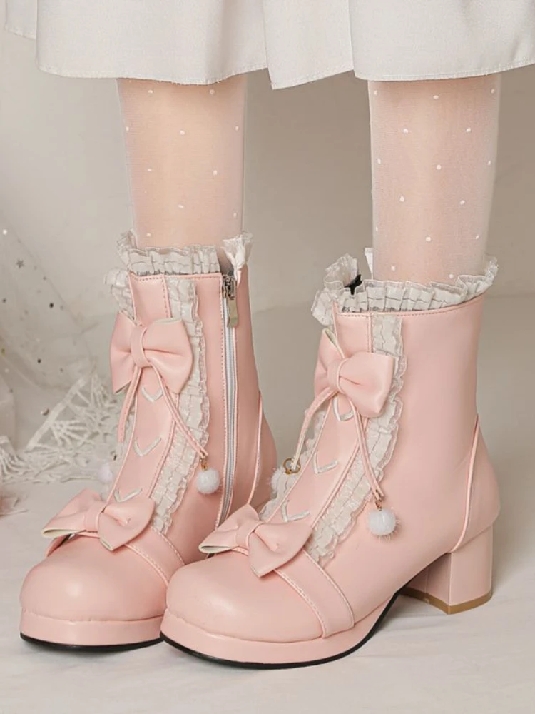 LBSFY - Autumn Sweet Pink New Lolita Boots Women Japanes Style High Heels Ankle Boots Female Kawai Lace Bow Design Lace-up Martens Shoes