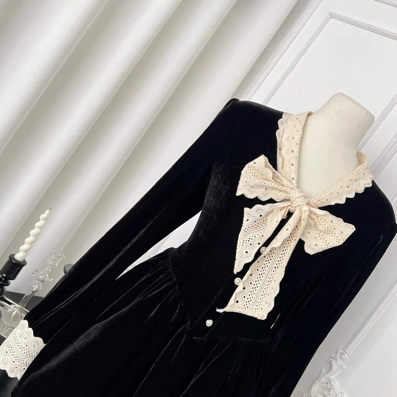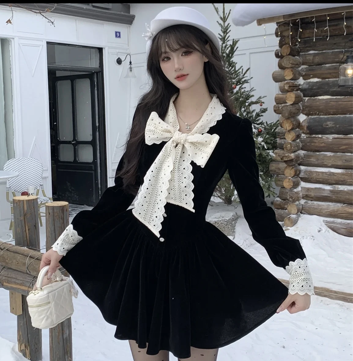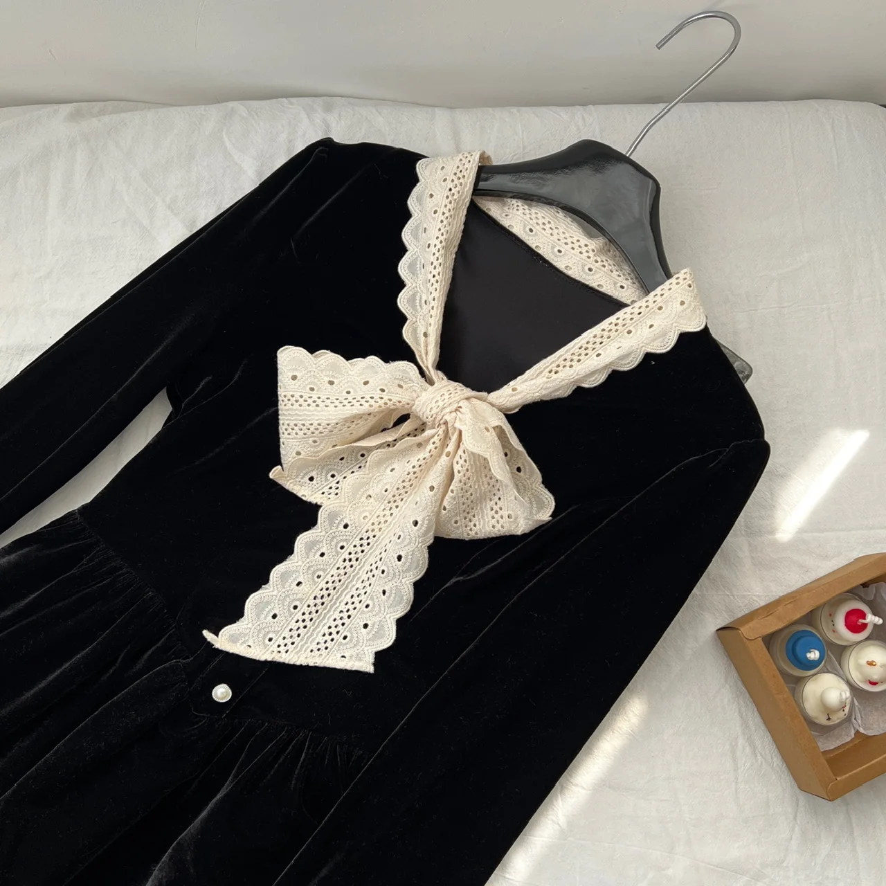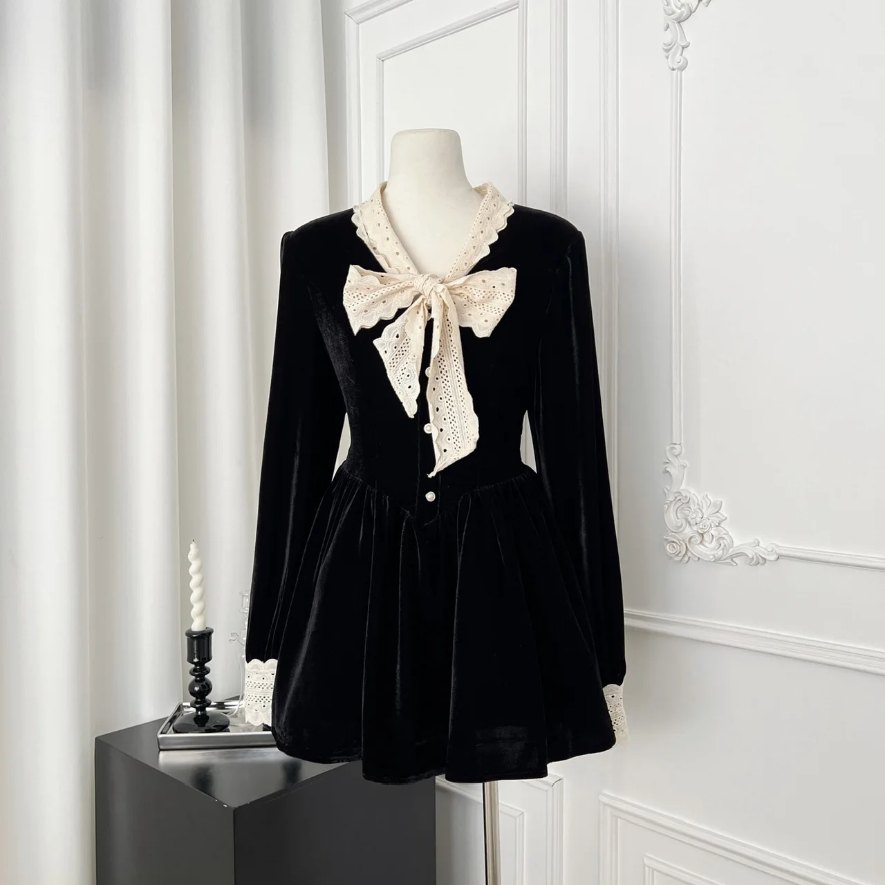 LBSFY -Autumn Velvet Mini Dress for Women French Vingate Bow Neck Lace Patchwork Evening Party Dresses Korean One Piece Vestidos Mujer