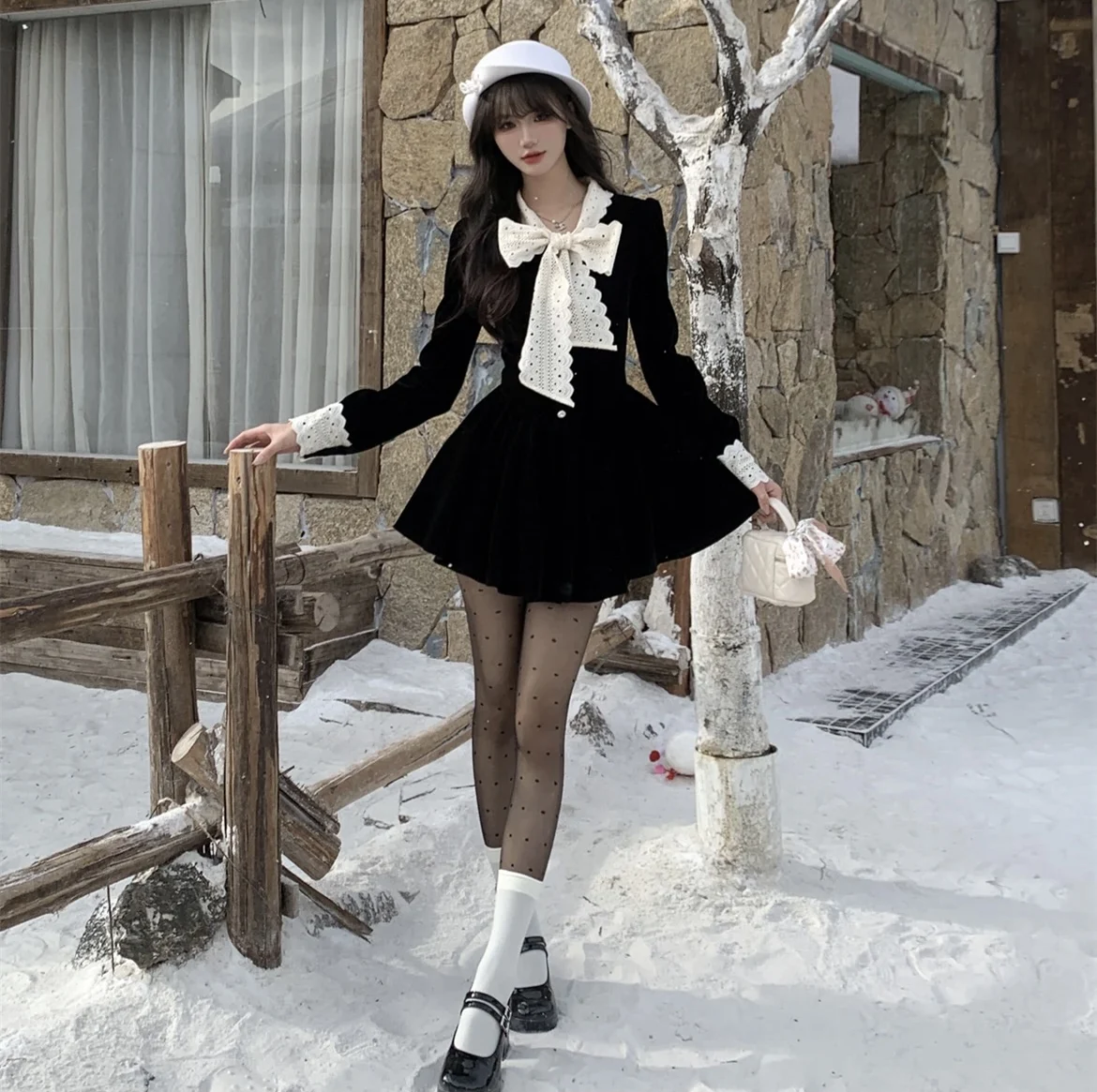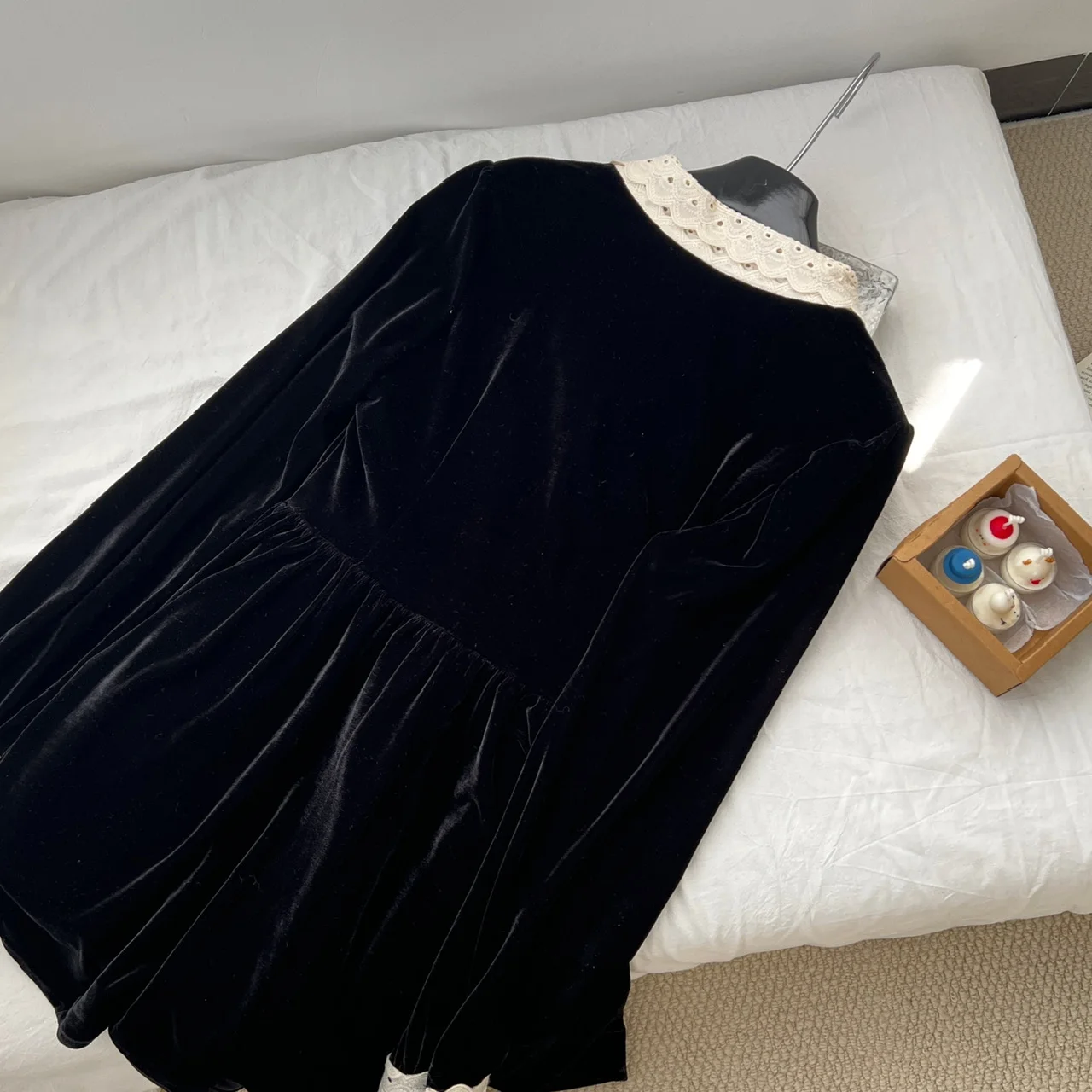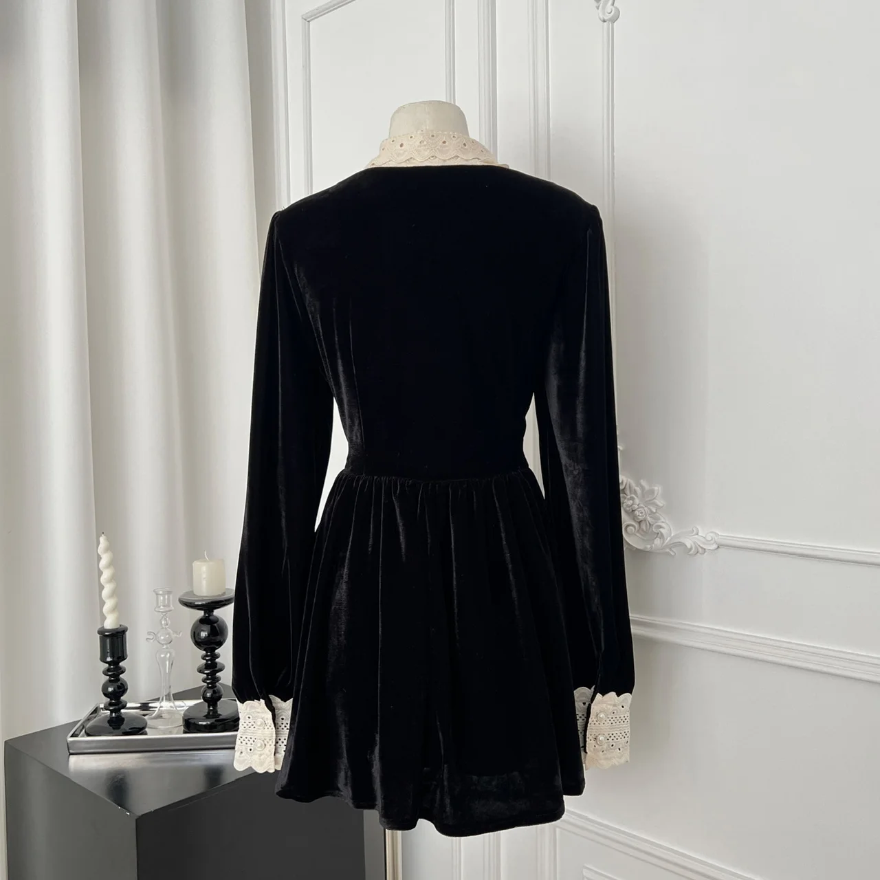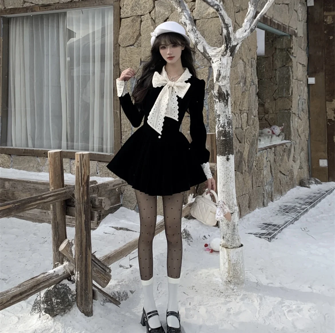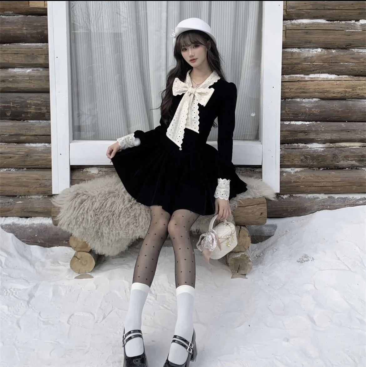 LBSFY -Autumn Velvet Mini Dress for Women French Vingate Bow Neck Lace Patchwork Evening Party Dresses Korean One Piece Vestidos Mujer