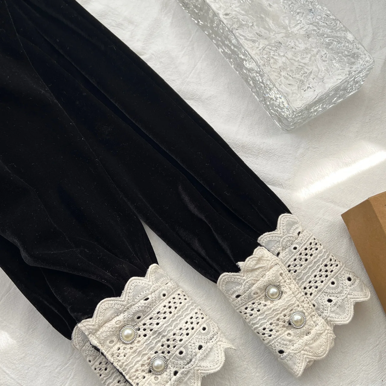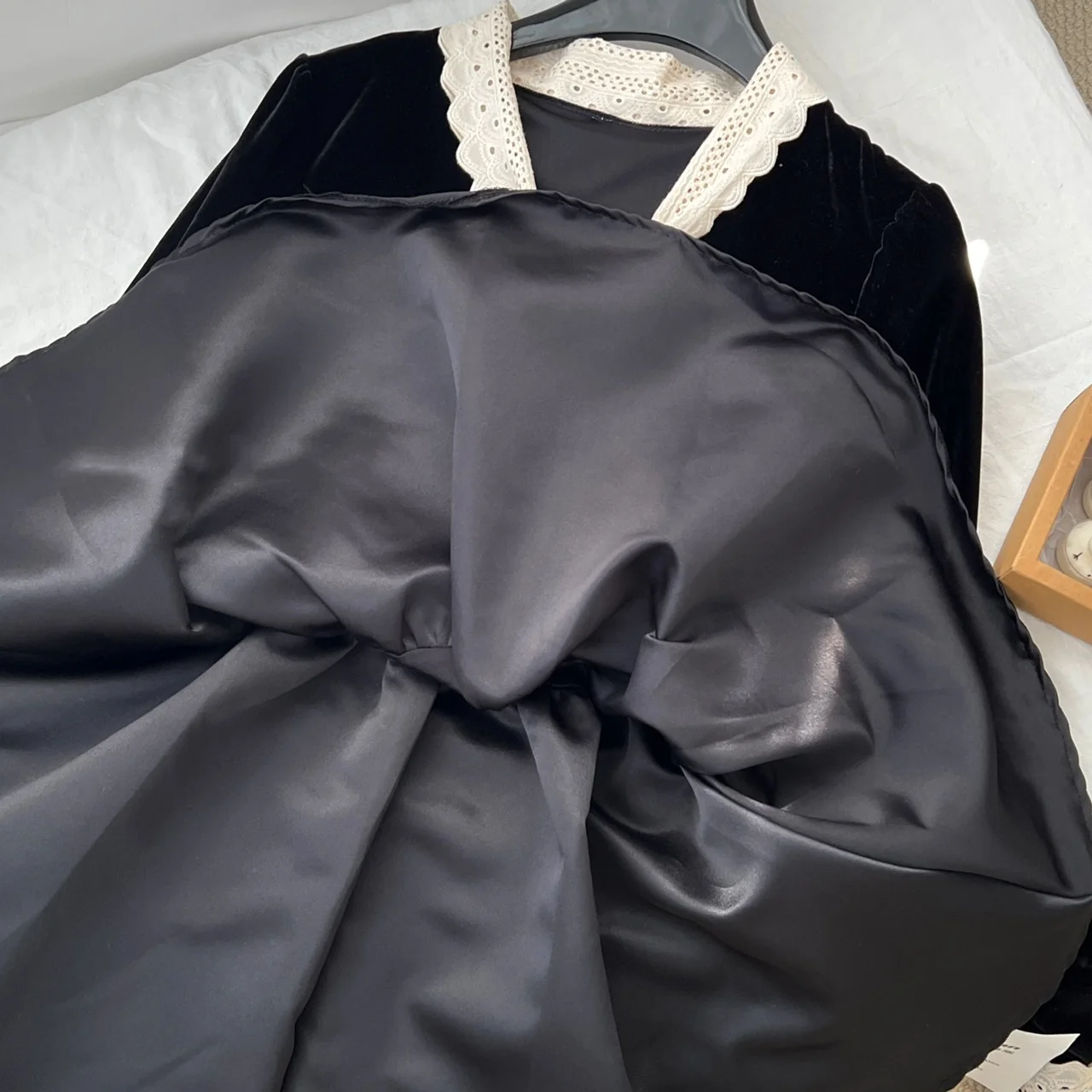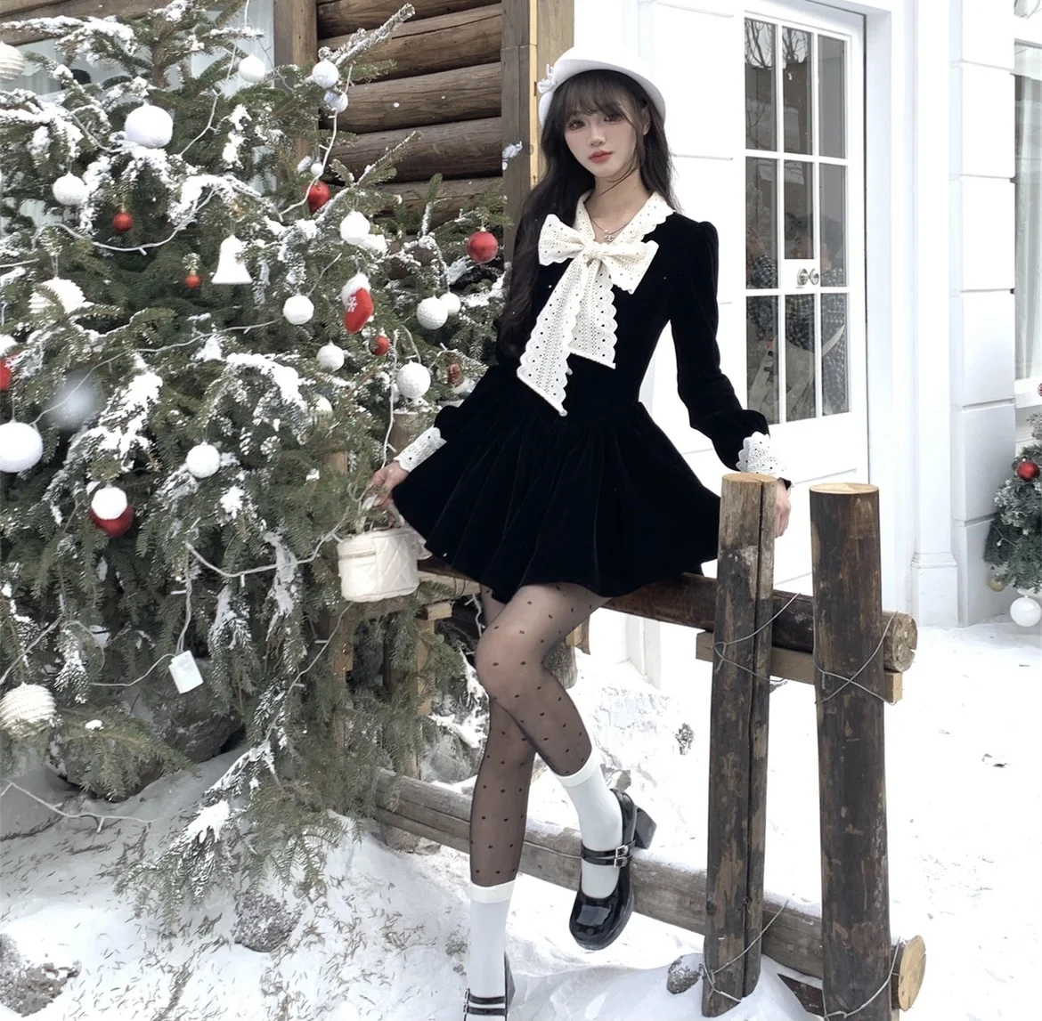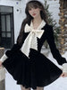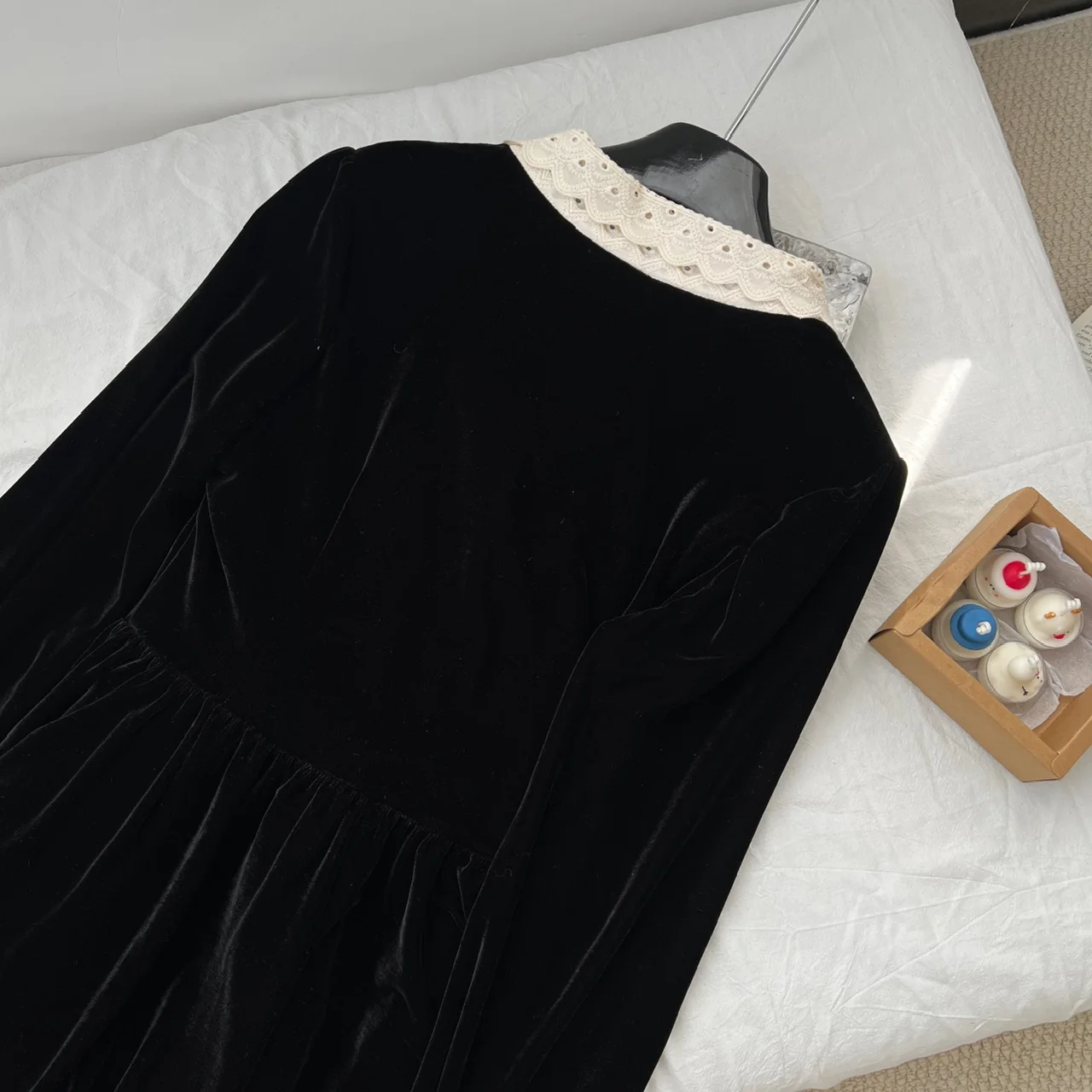 LBSFY -Autumn Velvet Mini Dress for Women French Vingate Bow Neck Lace Patchwork Evening Party Dresses Korean One Piece Vestidos Mujer