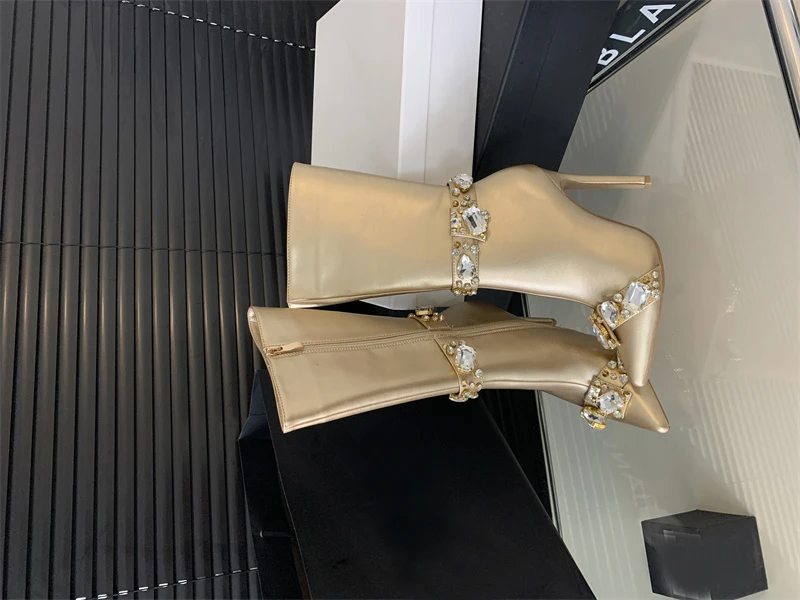 LBSFY - Autumn Winter Zip Cozy Leather Ankle Boots Women High Quality Crystal Diamond Pointed Toe Stiletto Heels Party Prom Shoes
