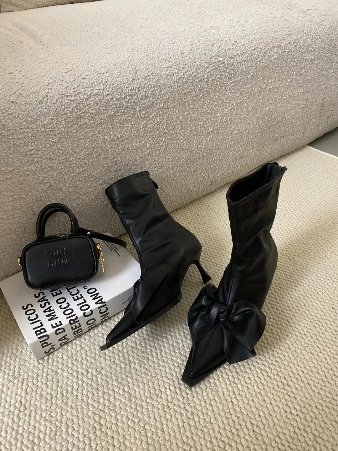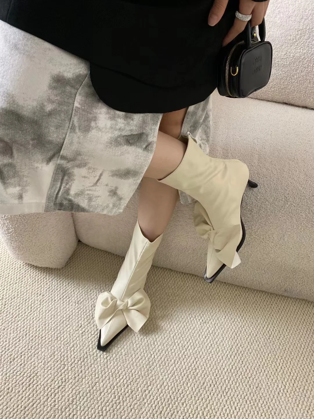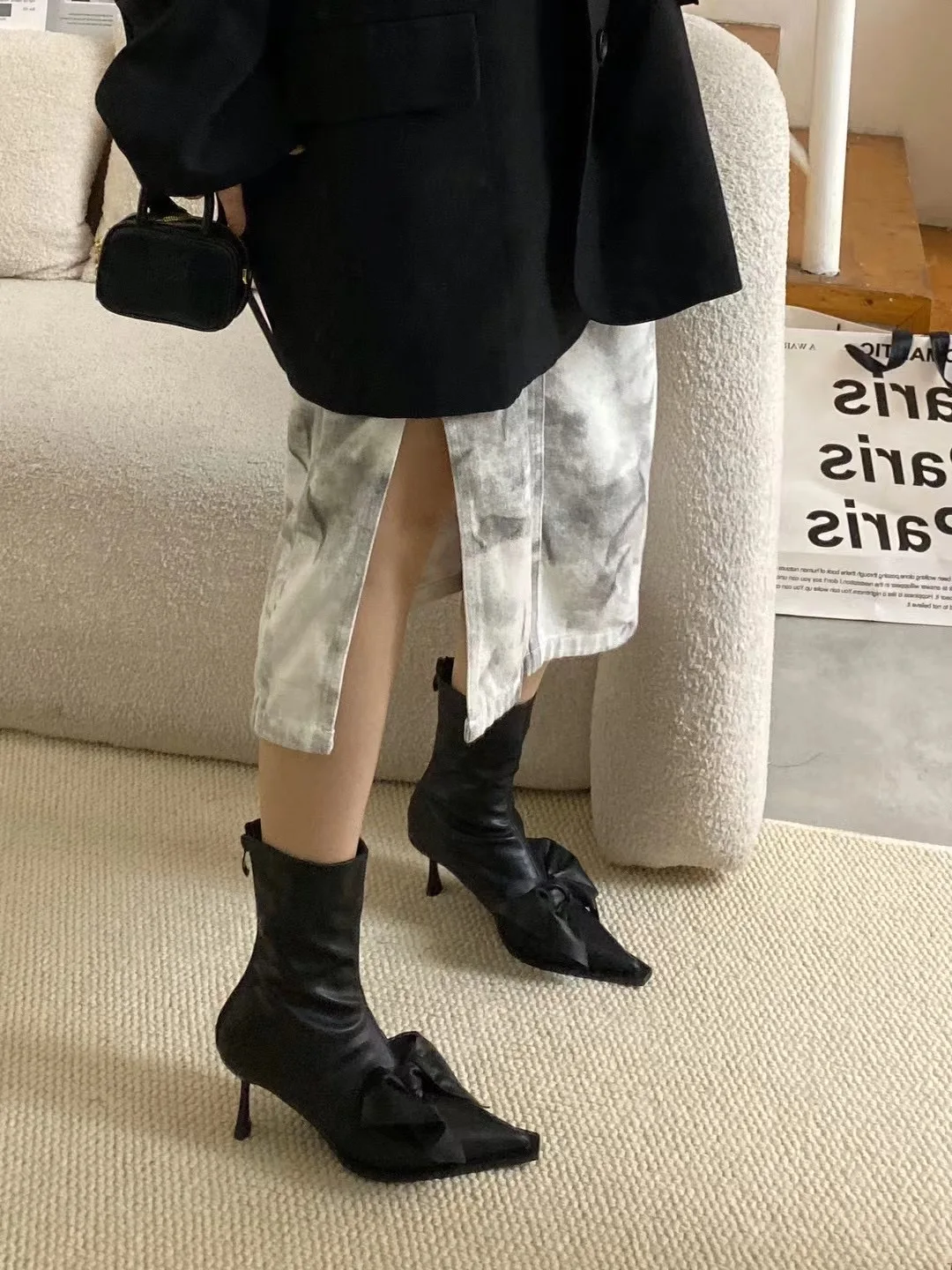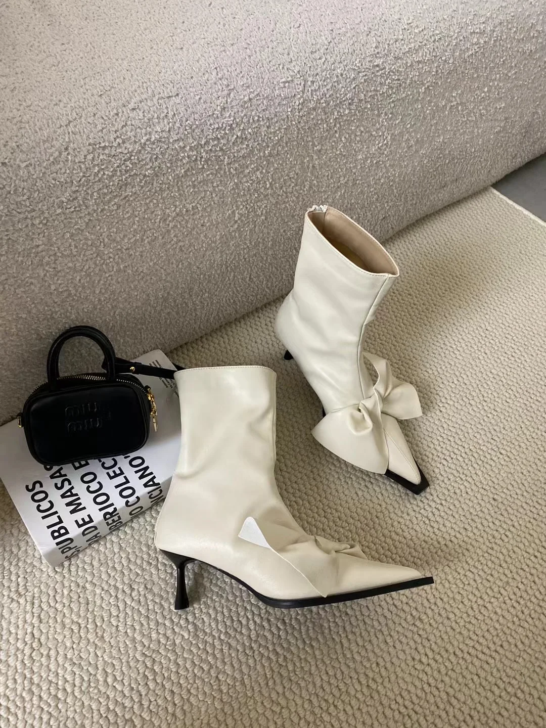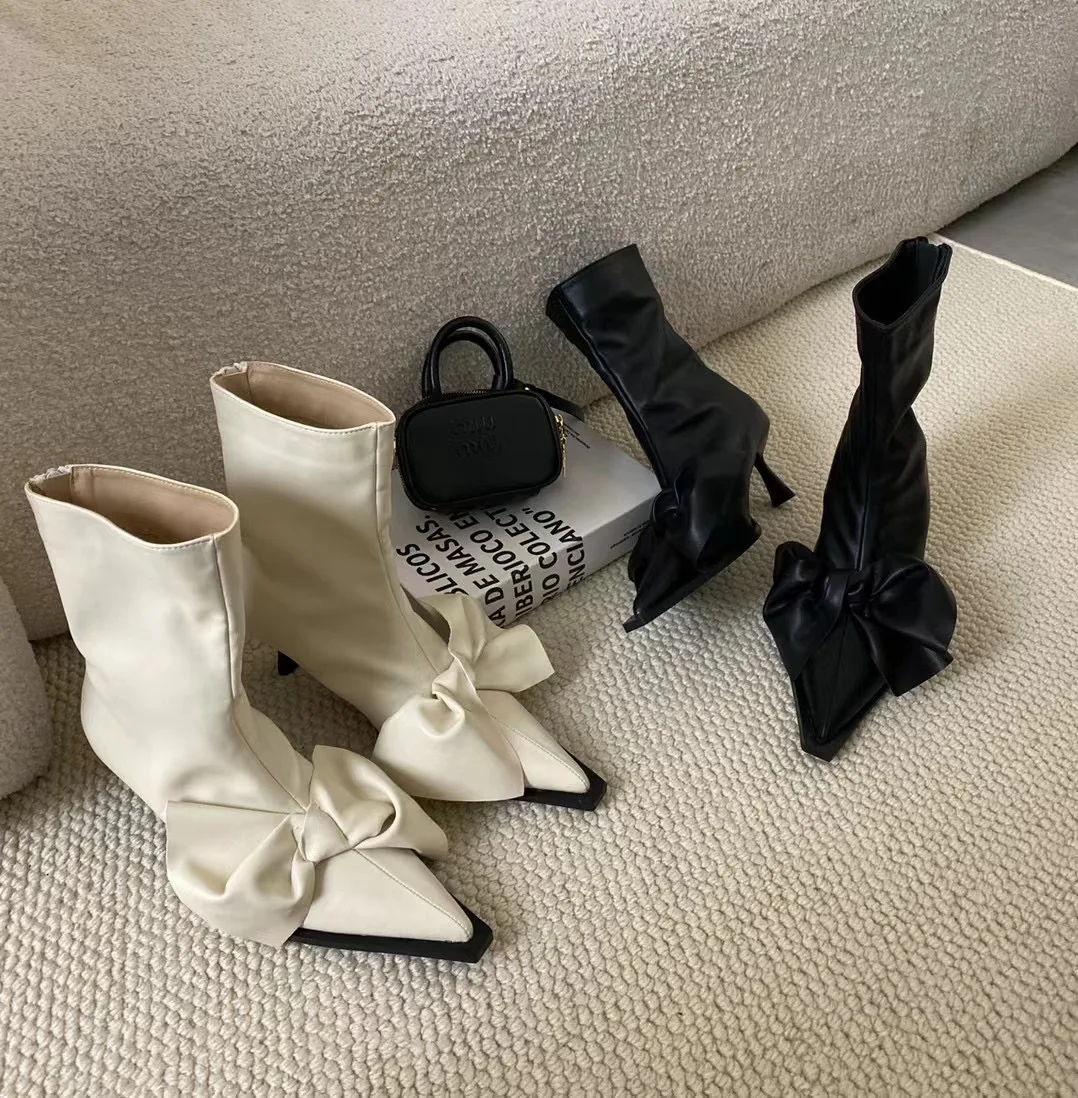 LBSFY - Big Cute Bow Women Ankle Boots Black White Women SHort Sock Botas Thin High Heels Back Zipper Winter Autumn Chelsea Boots 35-39