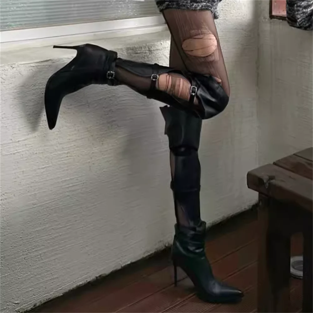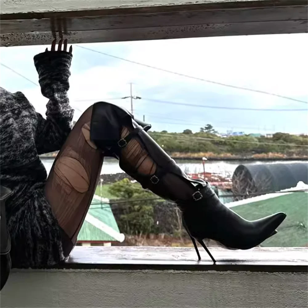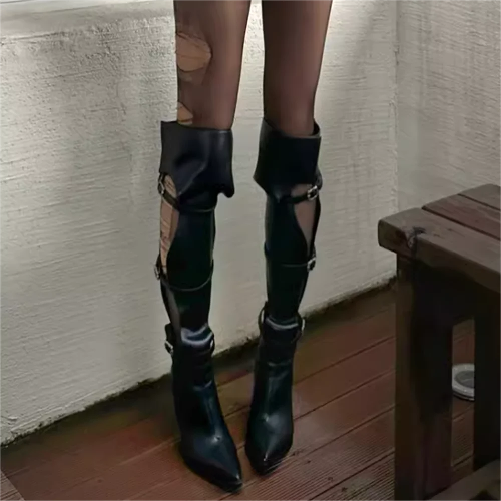 LBSFY - Black Hollow Out Strappy Buckle Boots Knee High Pointed Toe Shoes for Women Thin High Heels Sexy Shoes 2024 Zapatos Para Mujere