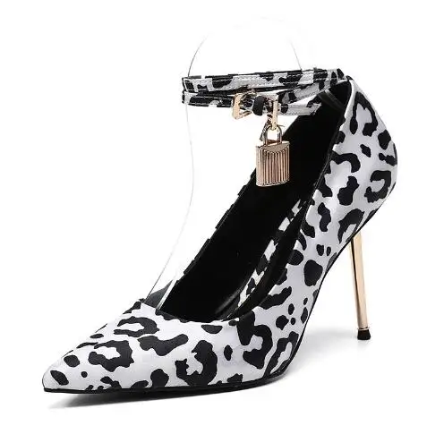 LBSFY - Black Pink Leopard Pointed Toe Sliver Lock Decor Pumps Woman Sexy Shallow Ankle Buckle Stiletto Heels Party Dress Shoes Size 43