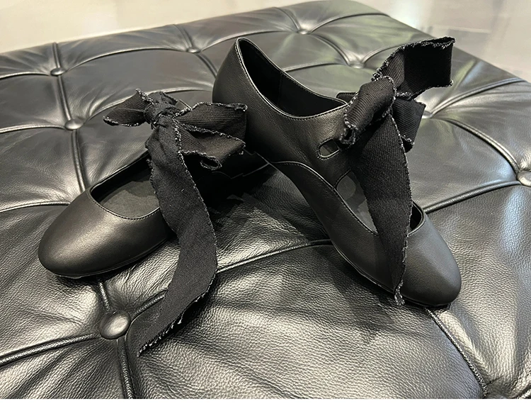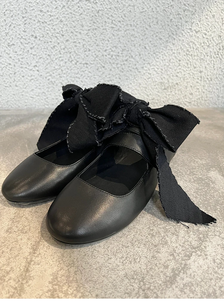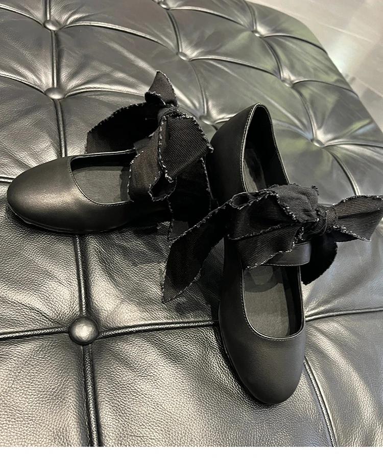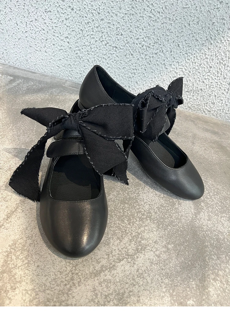 LBSFY - Black Round Toe Strappy Ballet Shoes for Women Lace-Up Bowknot Flat Leather Shoes Design Ladies Retro Casual Zapatos De Mujer