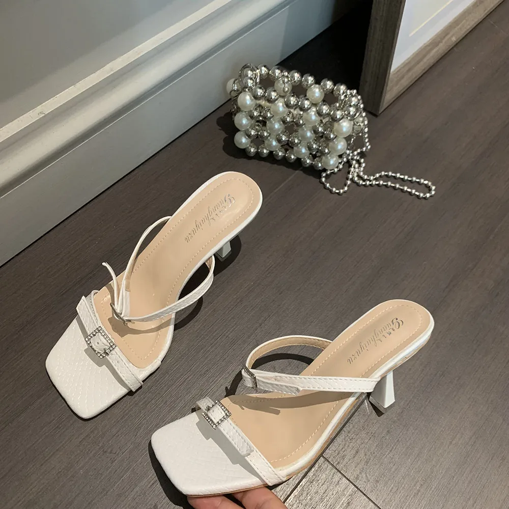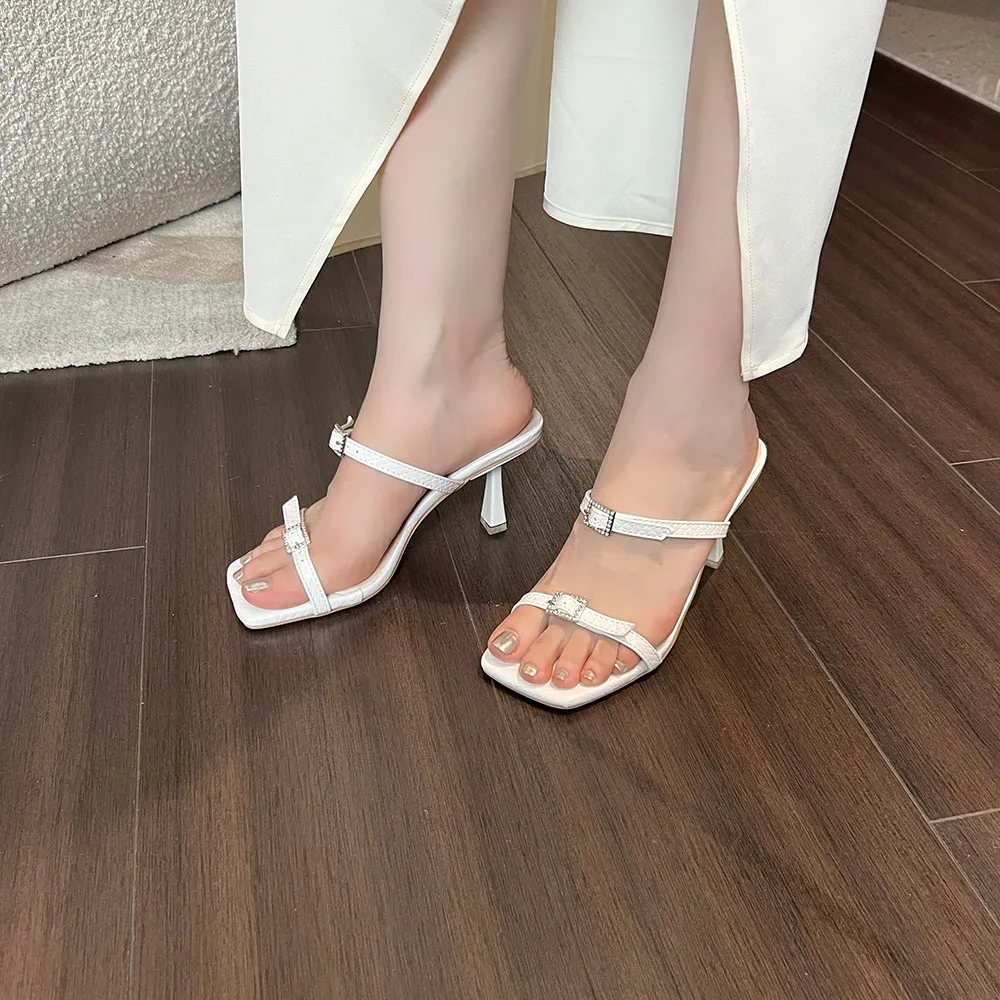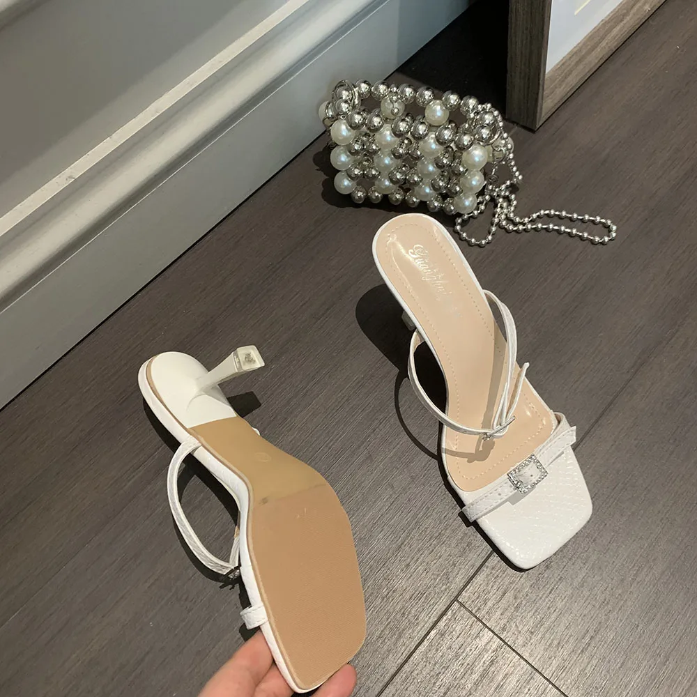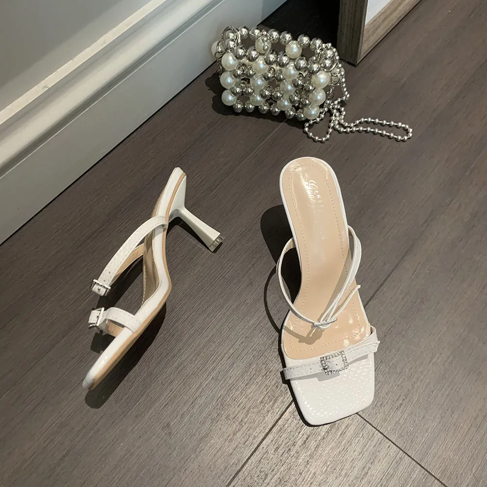 LBSFY - Black White Women Sandals Slides Thin High Heels Summer Outside Mules Shoes Stiletto Party Pumps Belt Rhinestone Buckle Sandals