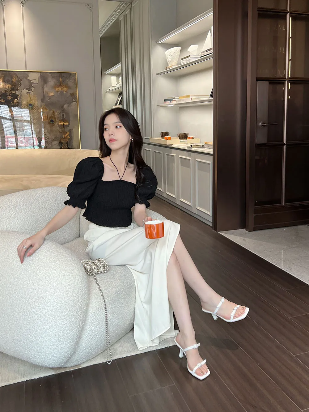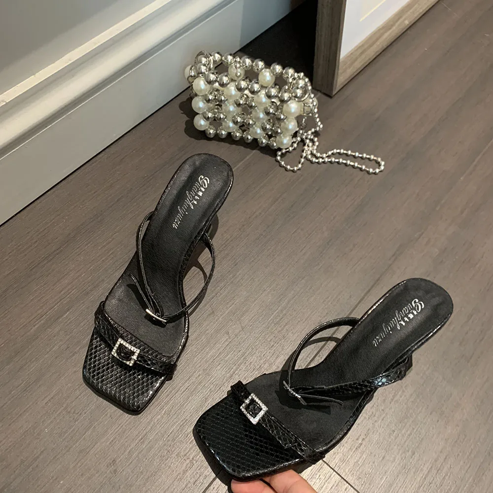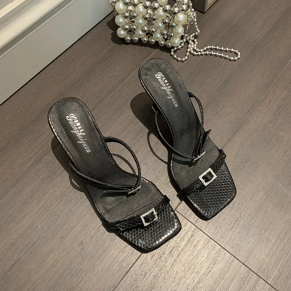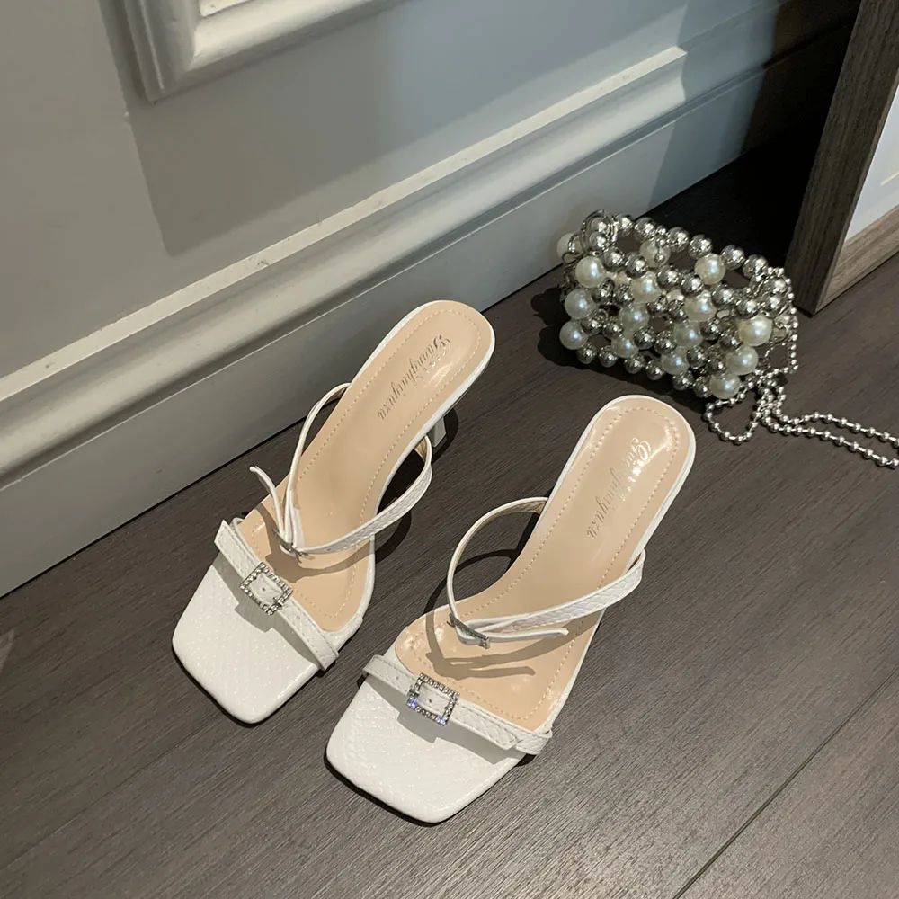 LBSFY - Black White Women Sandals Slides Thin High Heels Summer Outside Mules Shoes Stiletto Party Pumps Belt Rhinestone Buckle Sandals