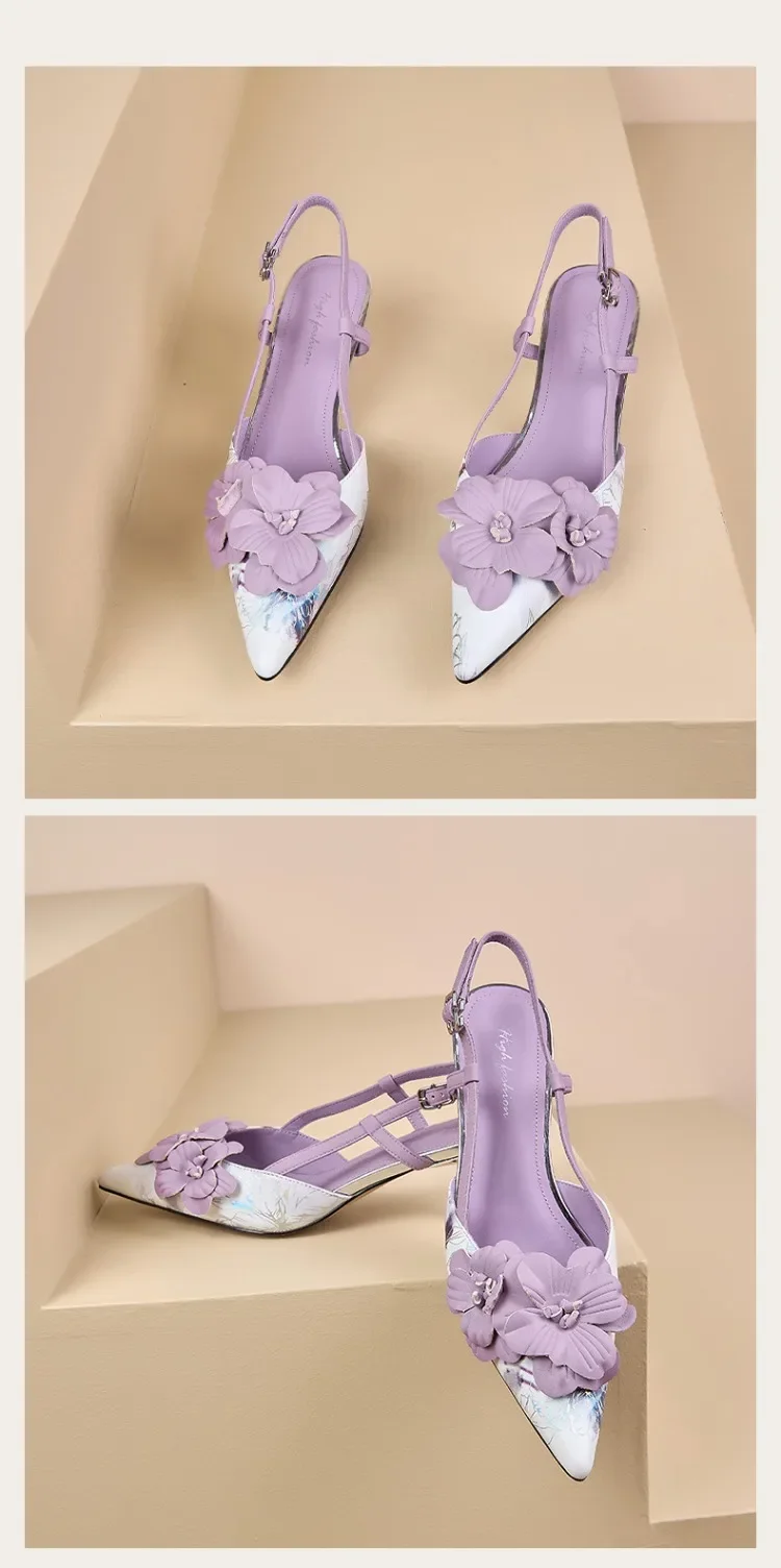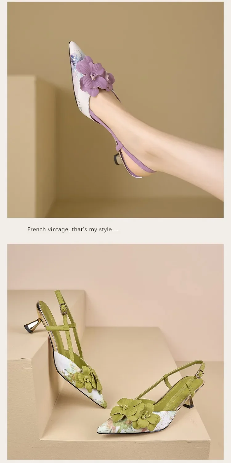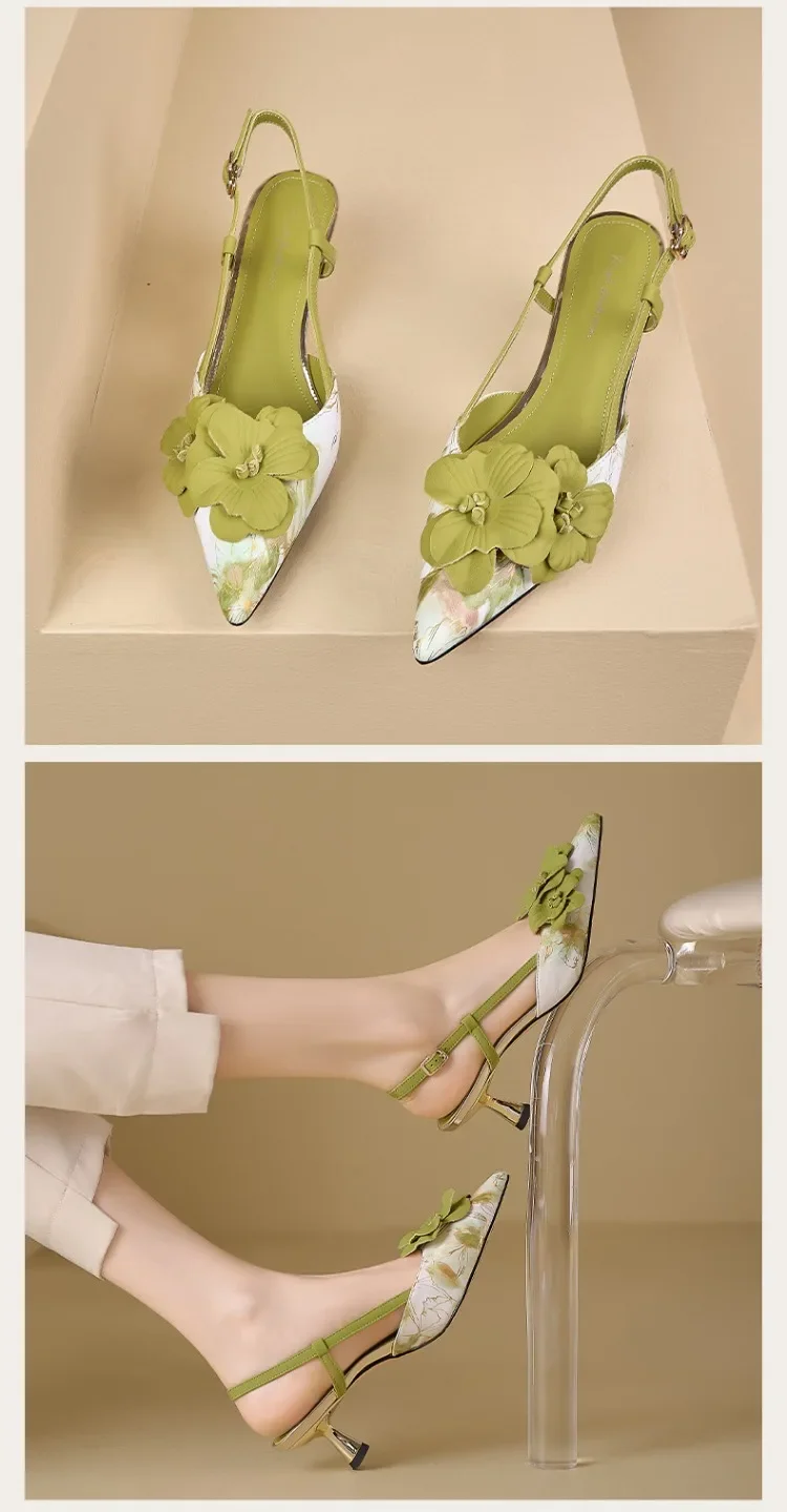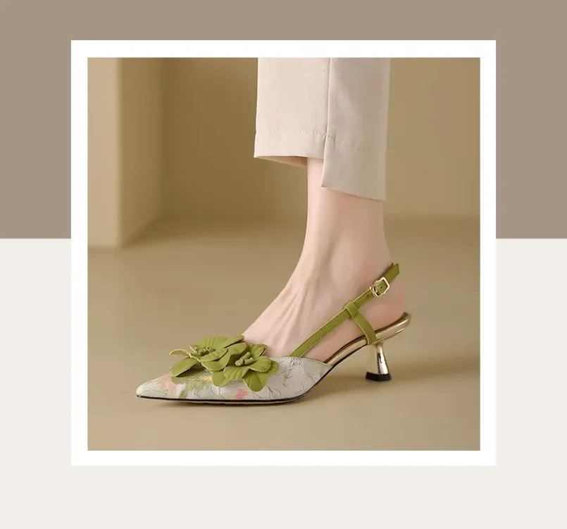 LBSFY - Brand Designer Flower High Heels Women Pointed Elegant Office Shoes Low Heel Party Dress Genuine Leather Fashion Sandals Women