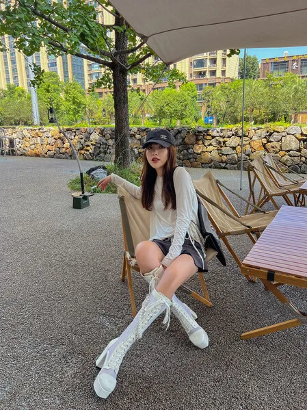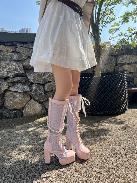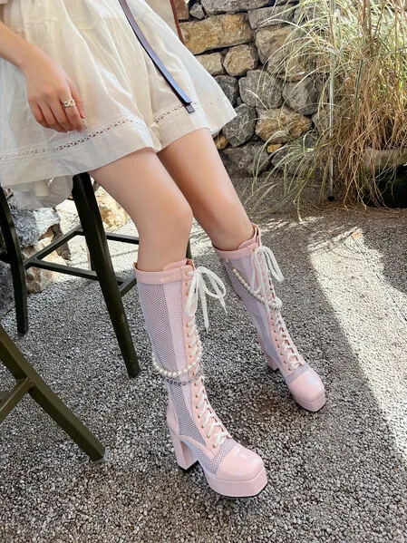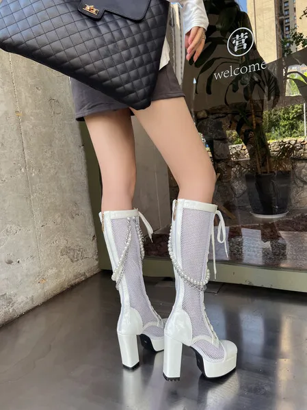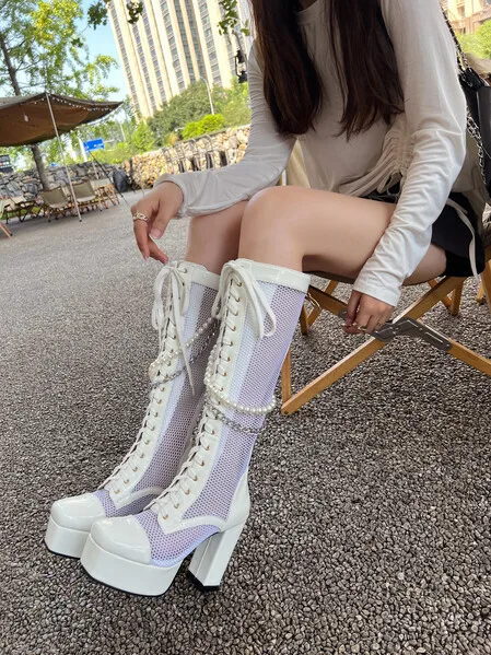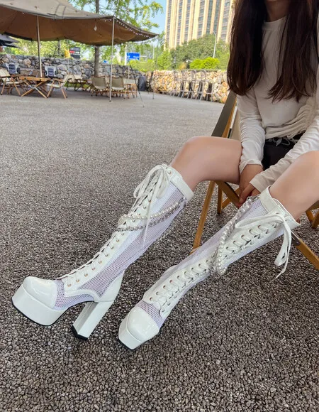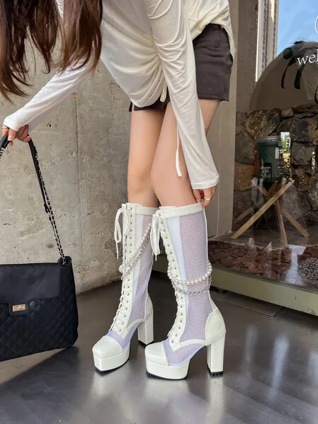 LBSFY - Breathable Mesh Stitched Glossy Patent Leather Motorcycle Boots Square Toe Platform Cross Lace Chain Pearl String Women's Boots