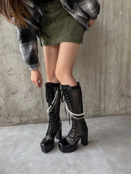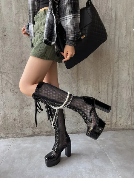 LBSFY  -  Breathable Mesh Stitched Glossy Patent Leather Motorcycle Boots Square Toe Platform Cross Lace Chain Pearl String Women's Boots