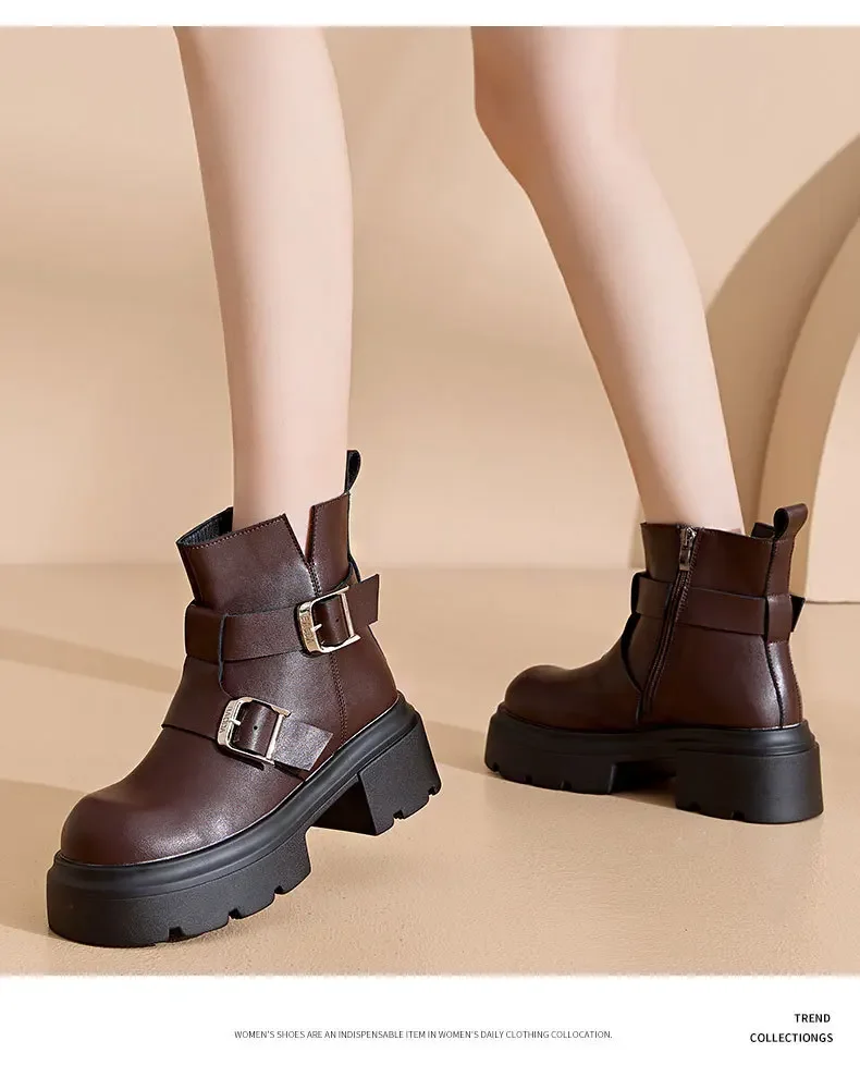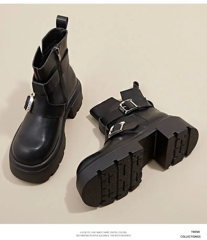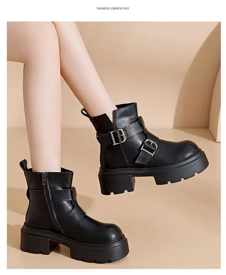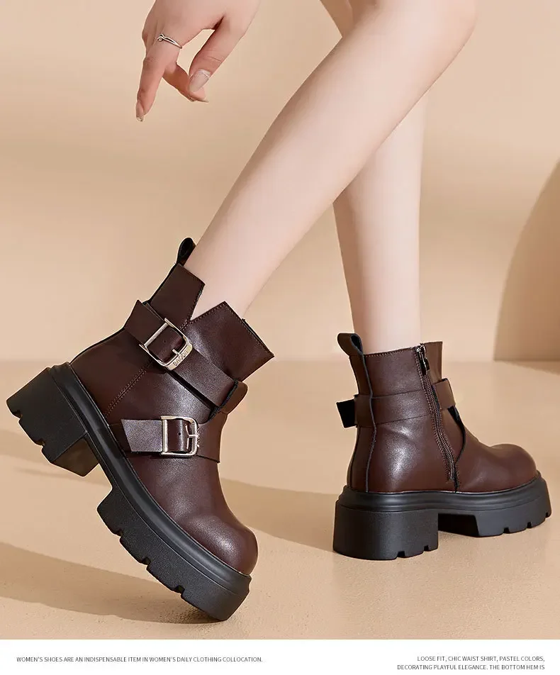 LBSFY - British Cow Leather Metal Buckle Women's Ankle Boots Designer Casual Shoes for Women Fashion Spring Autumn Platform Boots Female