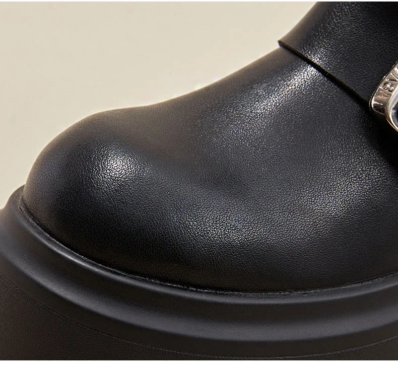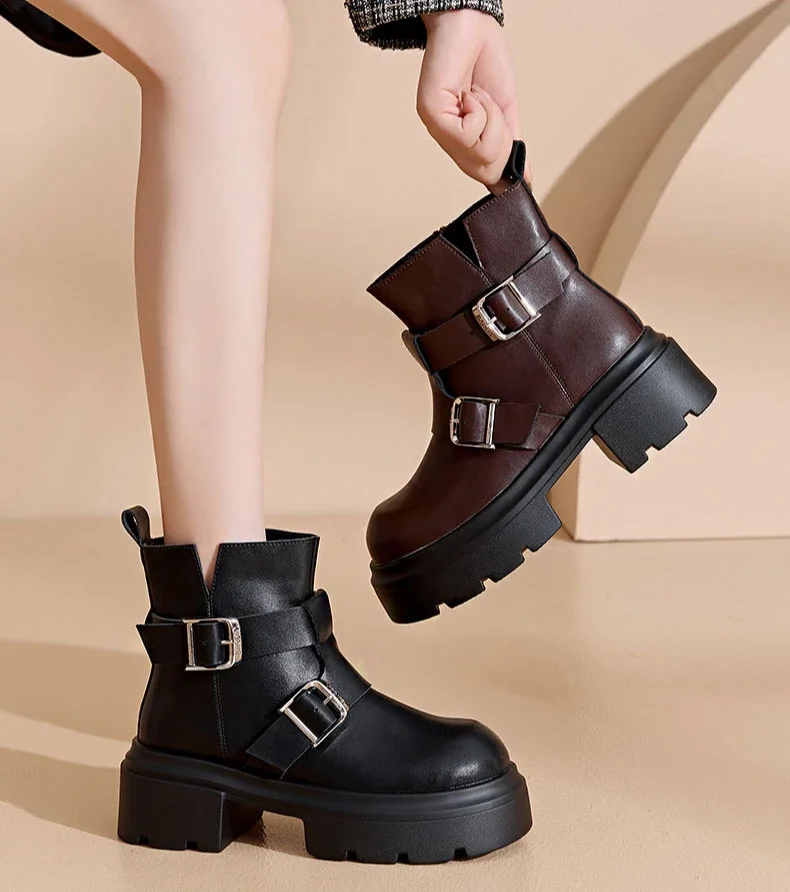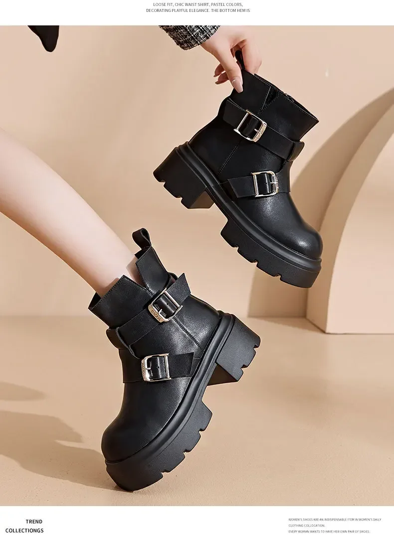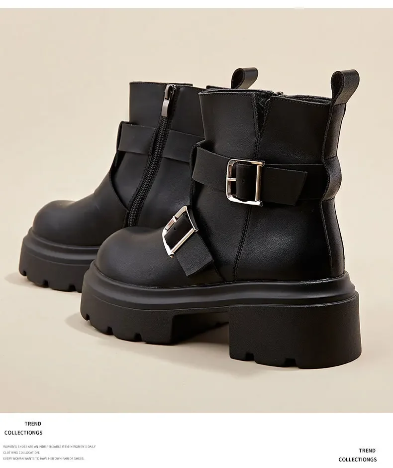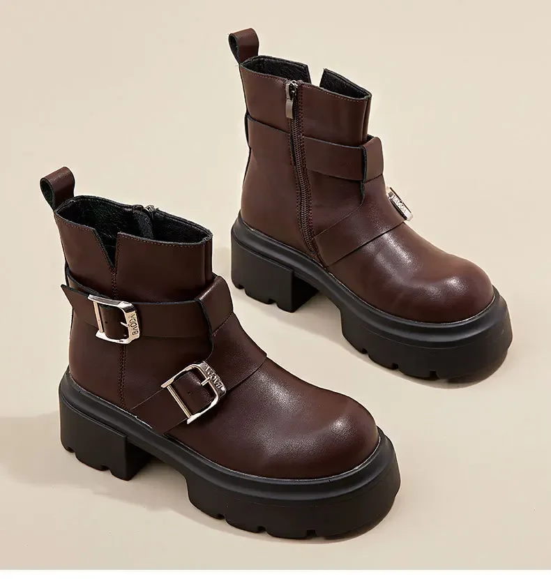 LBSFY - British Cow Leather Metal Buckle Women's Ankle Boots Designer Casual Shoes for Women Fashion Spring Autumn Platform Boots Female