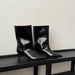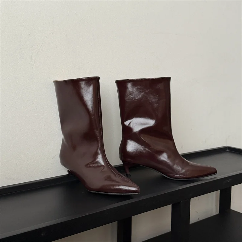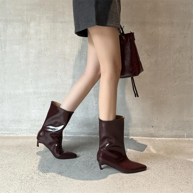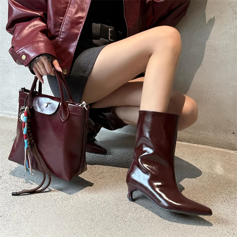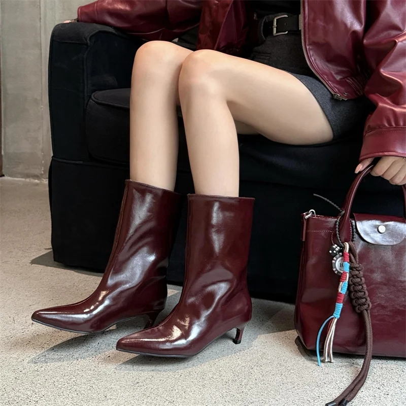 LBSFY - Burgundy Wide Calf Boots Ankle PU Leather Pointed Toe Thin Heels Winter Boots Women