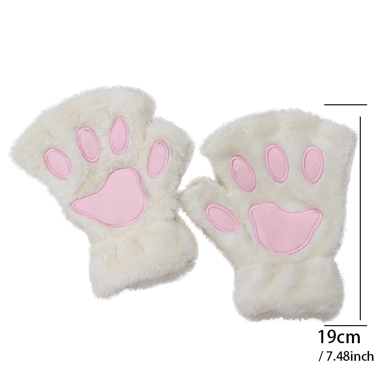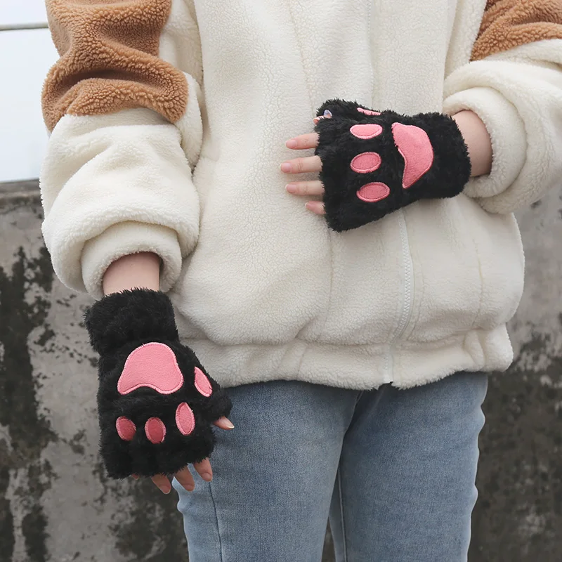 Cartoon Cat Paw Gloves Winter Cute Girl Open Finger Gloves Women Plush Warm Mittens Thickened Fluffy Bear Paw Half Finger Gloves