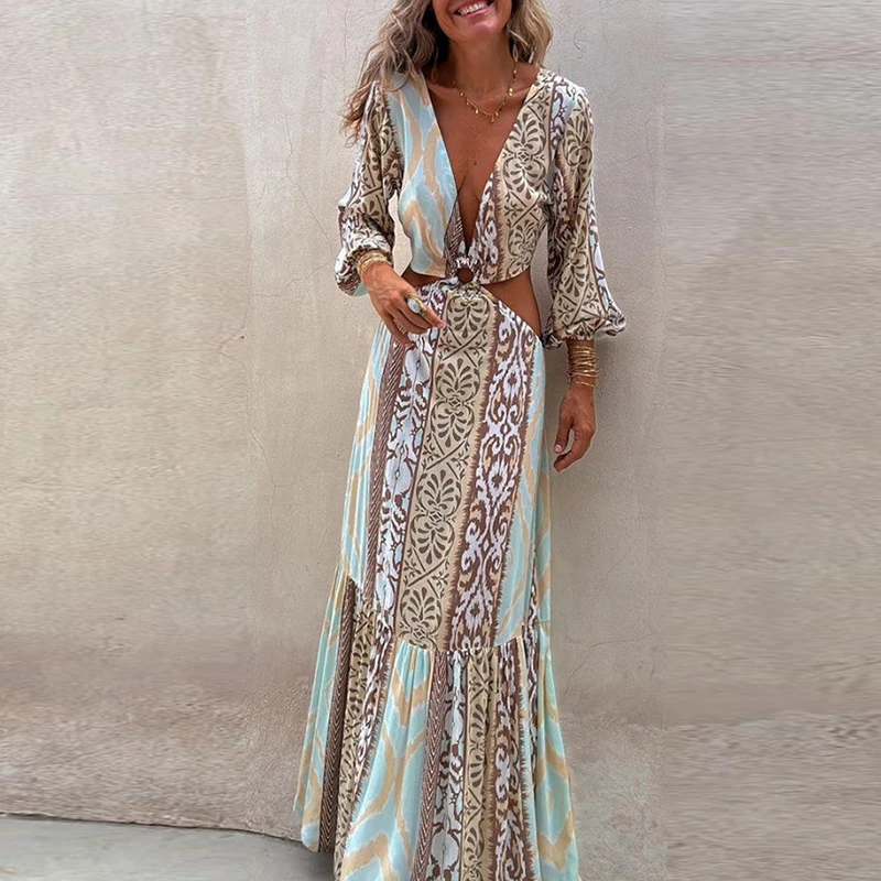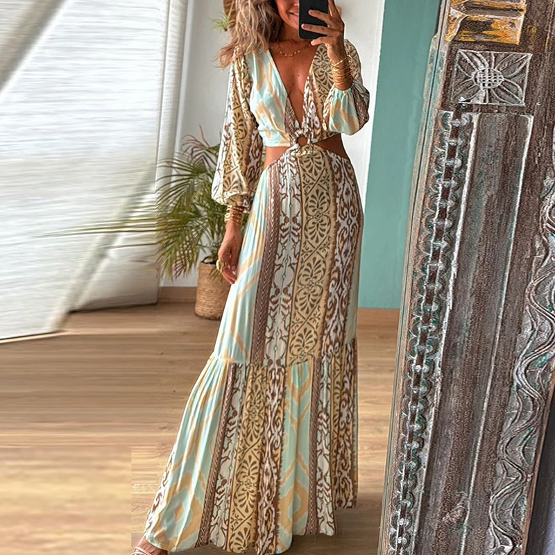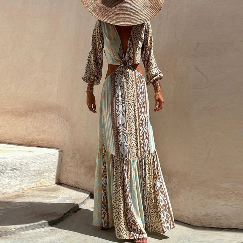 LBSFY - Casual Bohemian Holiday Maxi Dress Sexy Deep V Hollow High Waisted Beach Dress Spring Summer Long Sleeved Pleated Women's Dress