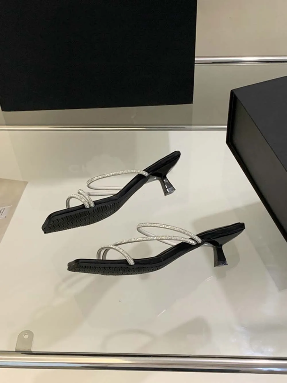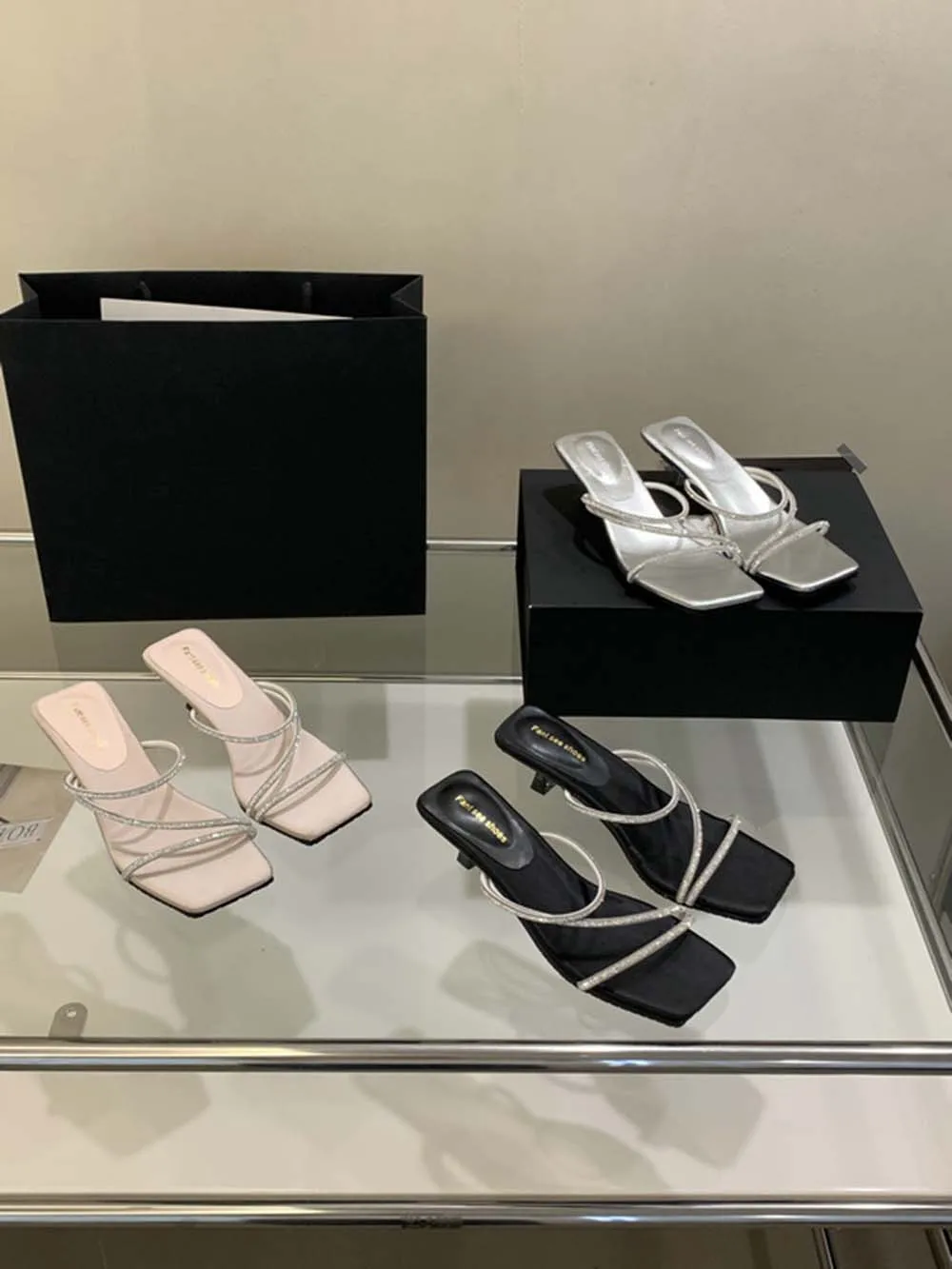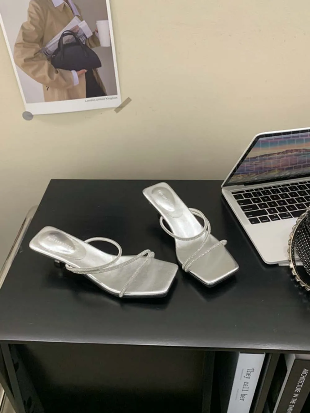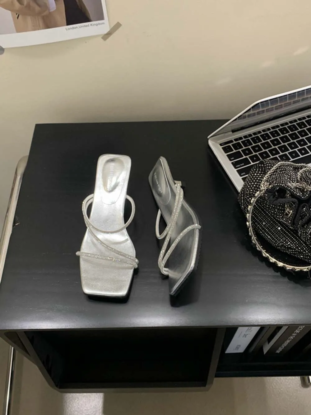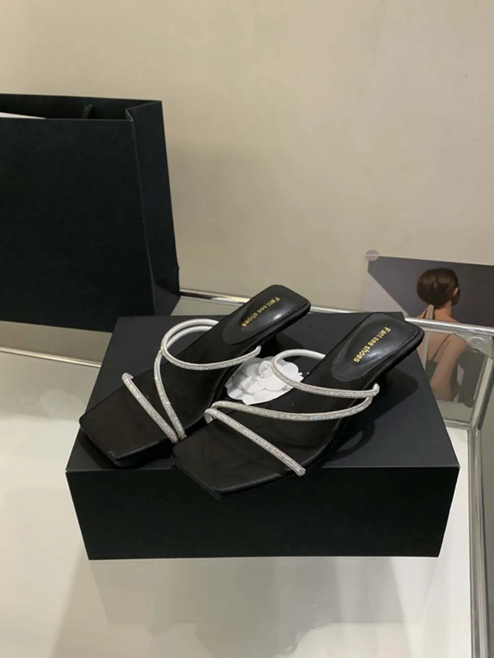 LBSFY - Chain Women Slides Slippers Thin Low Heels Black Silver Gold Summer Outside Low Heeled Sexy Party Pumps Size 35-39
