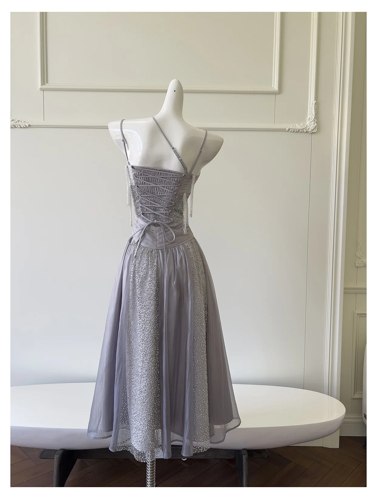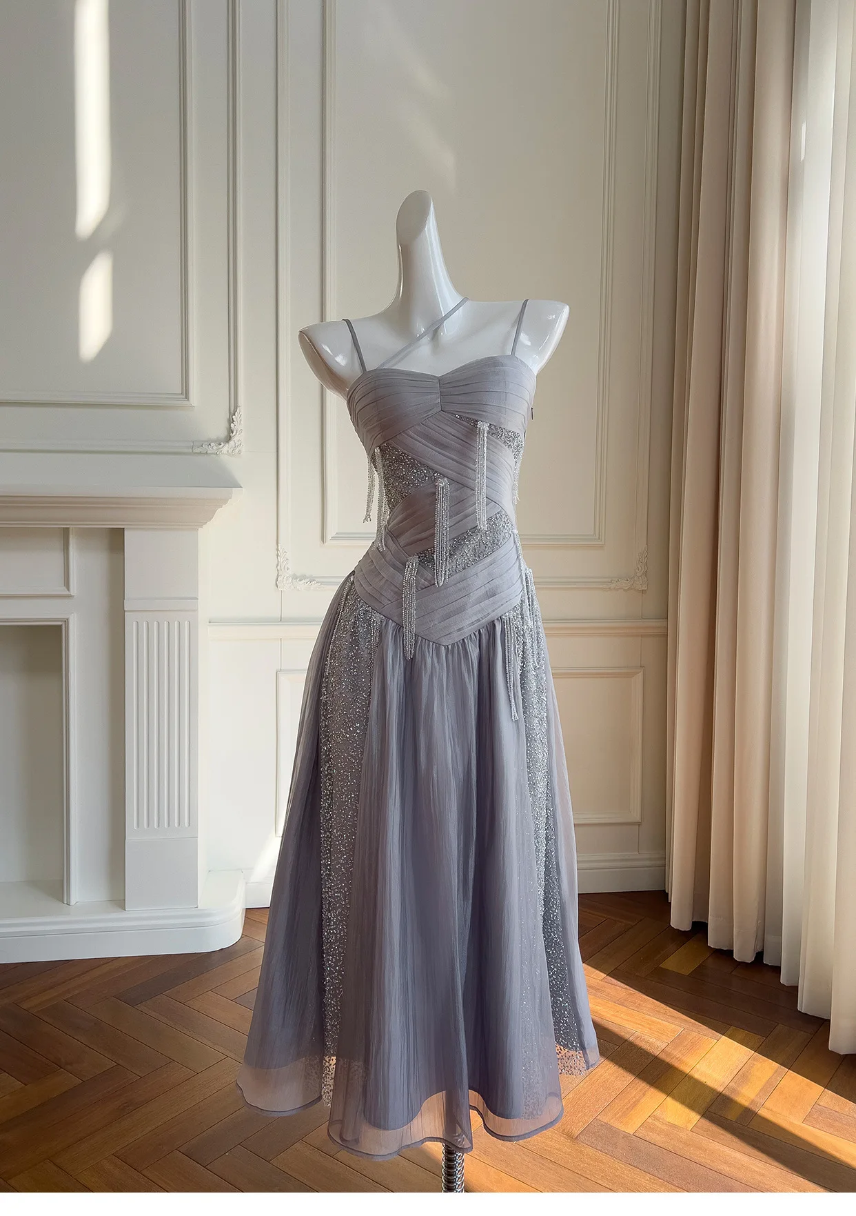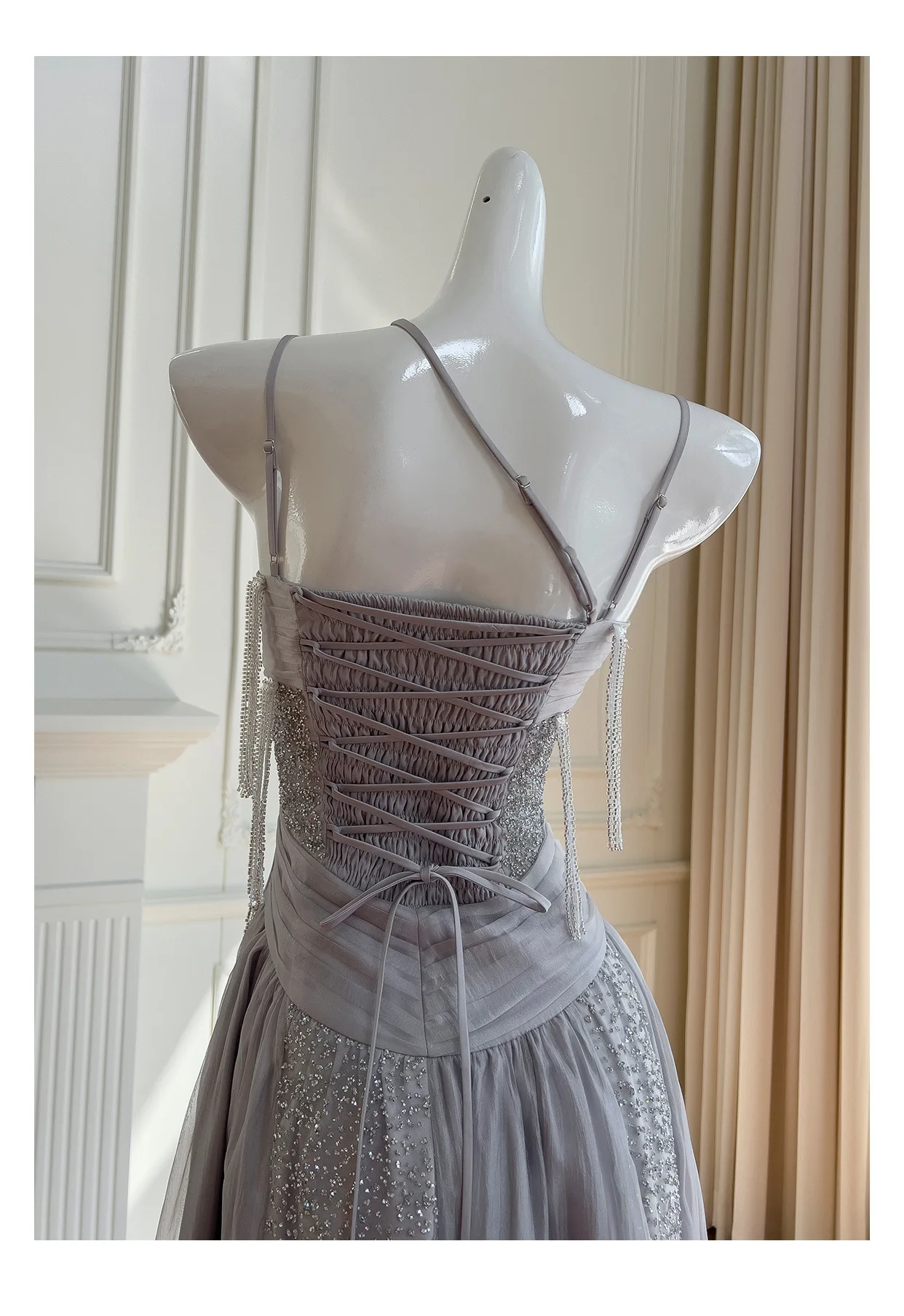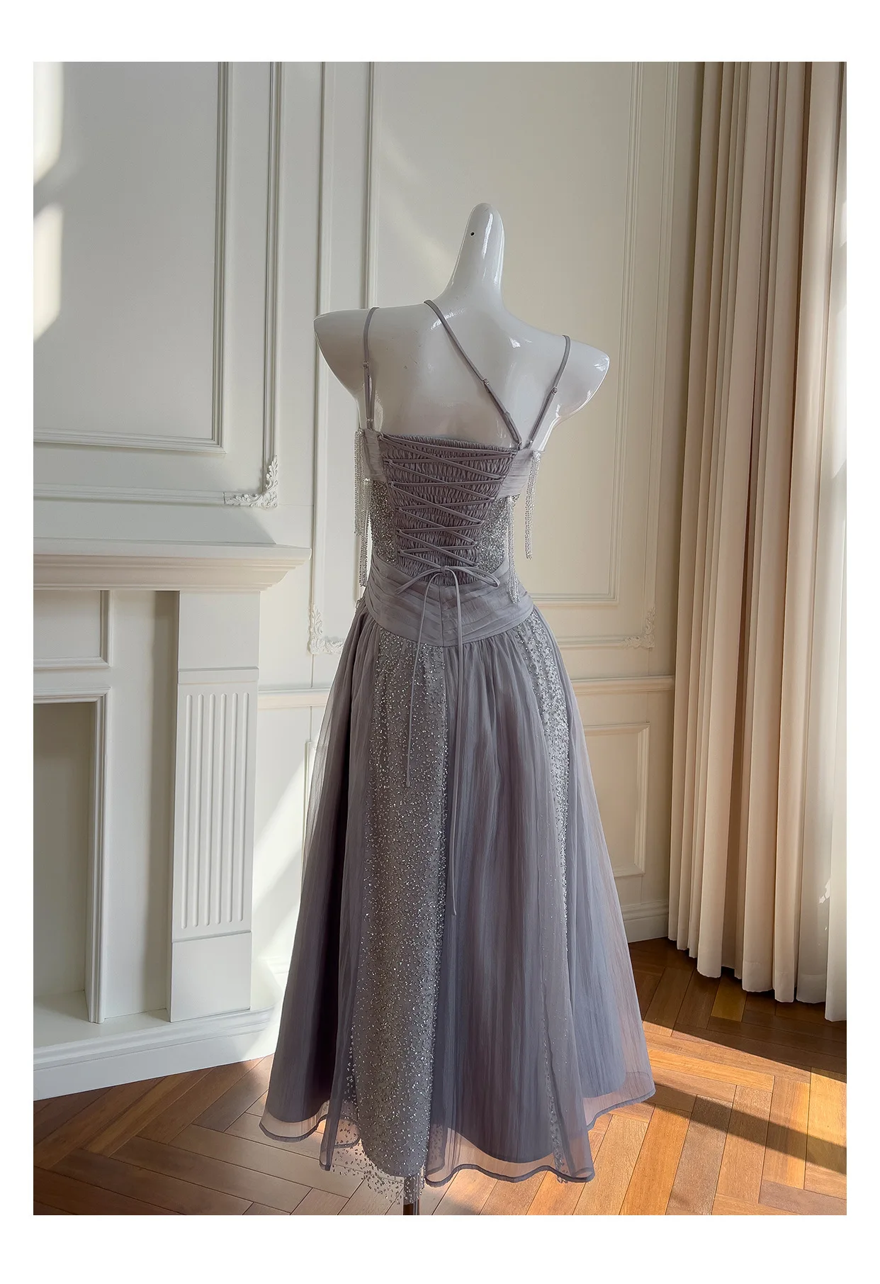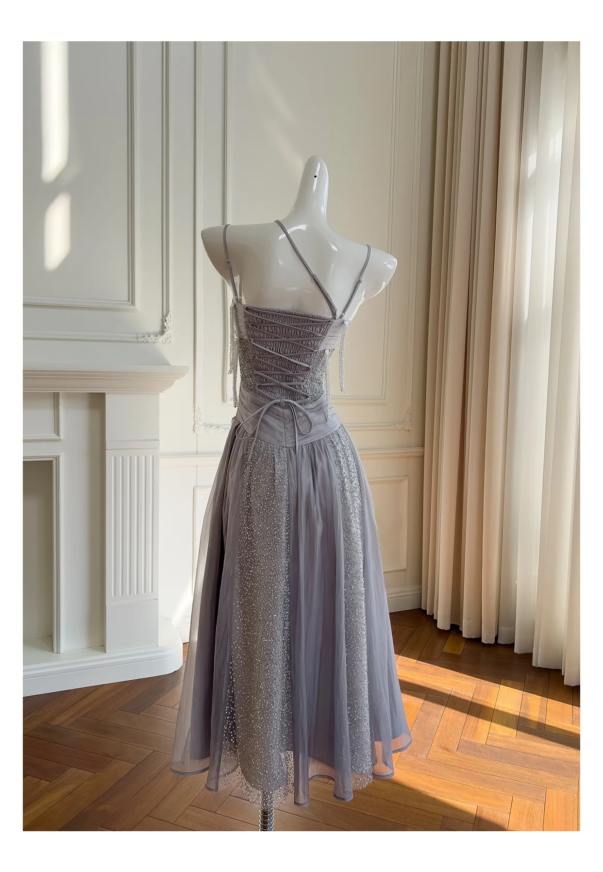 LBSFY -Charming Women's Gray Tulle Midi Dress With Lace Appliques Neckline Sleeveless Party Formal Gown Elegant