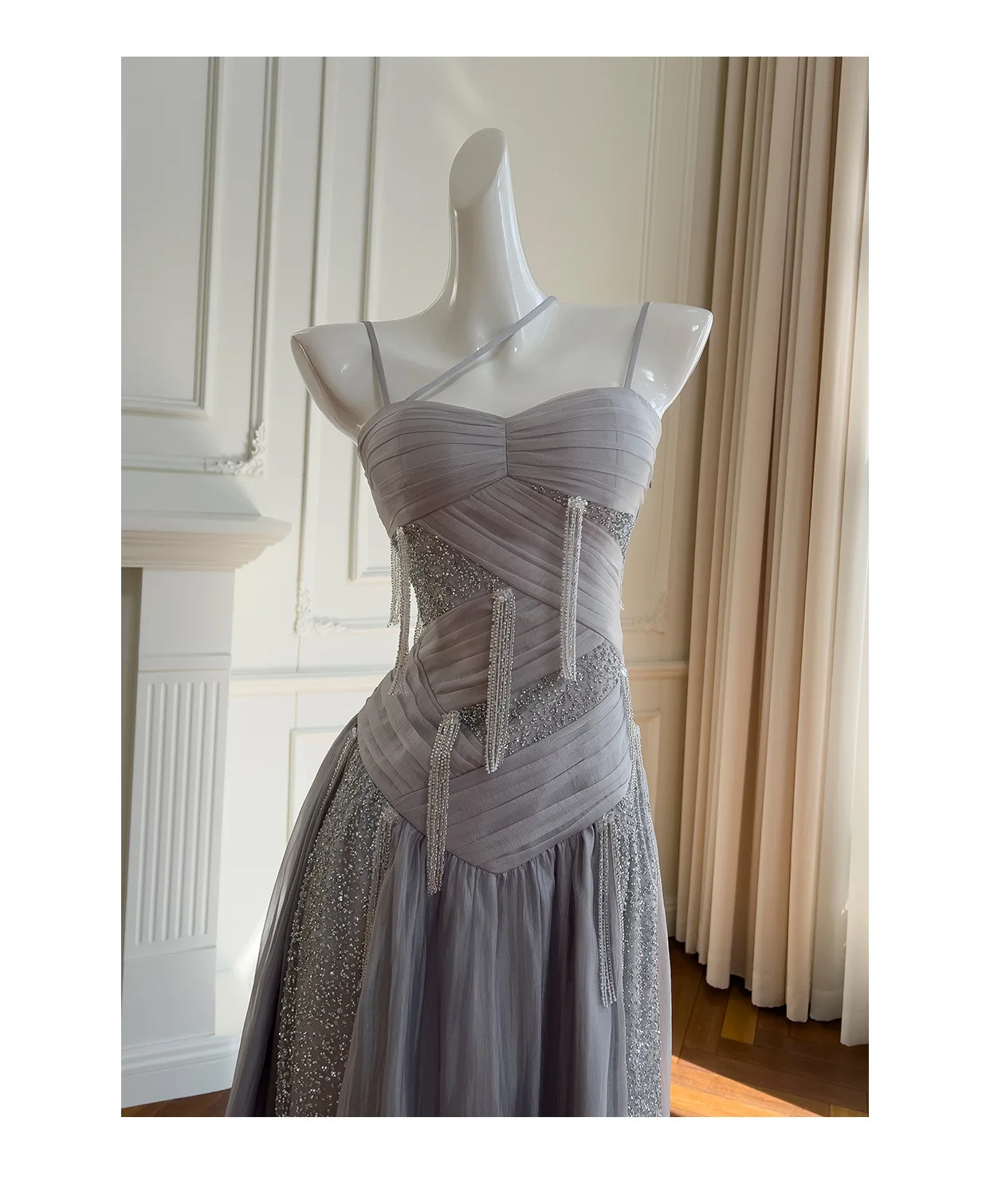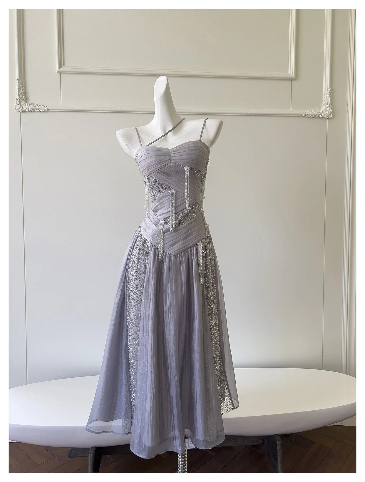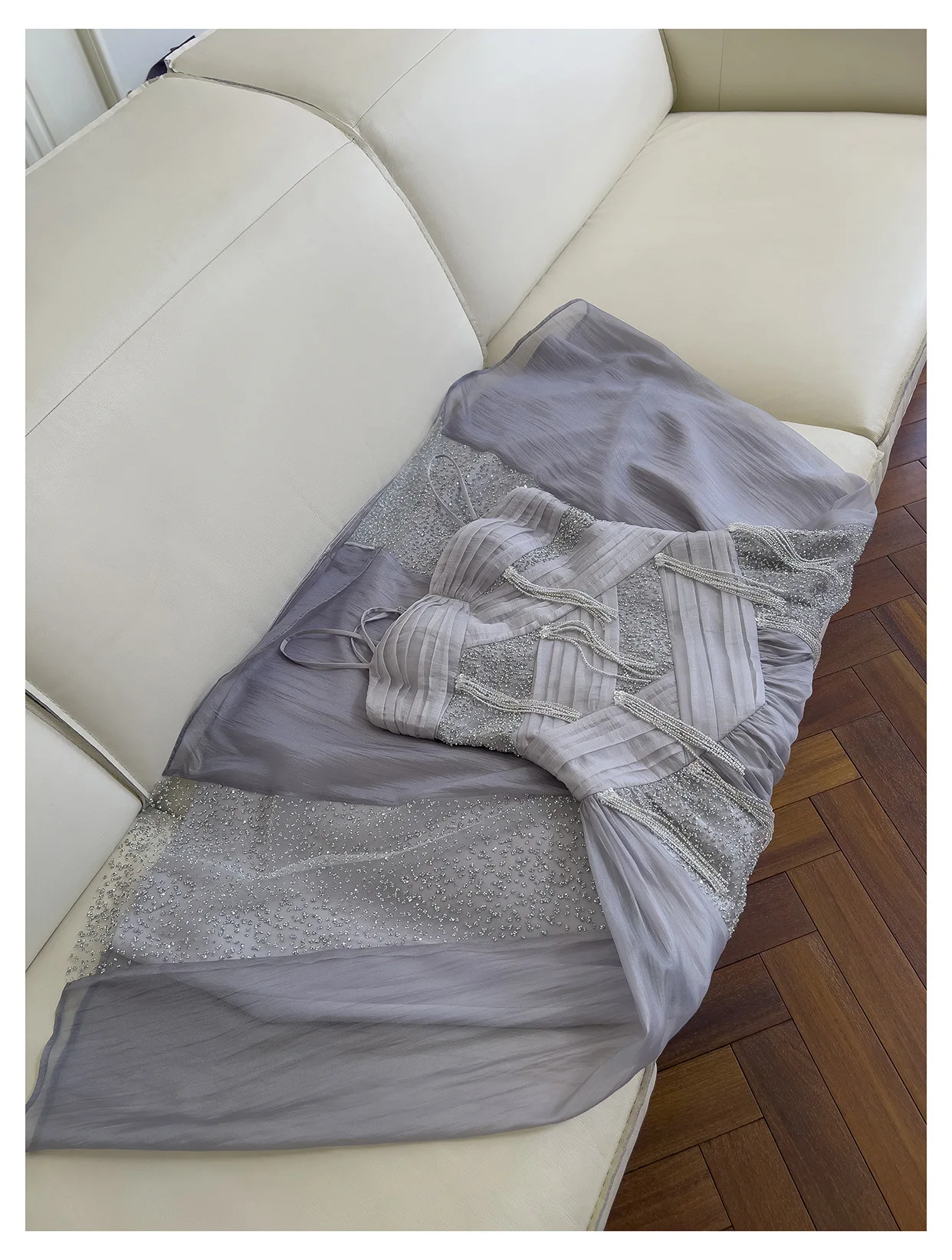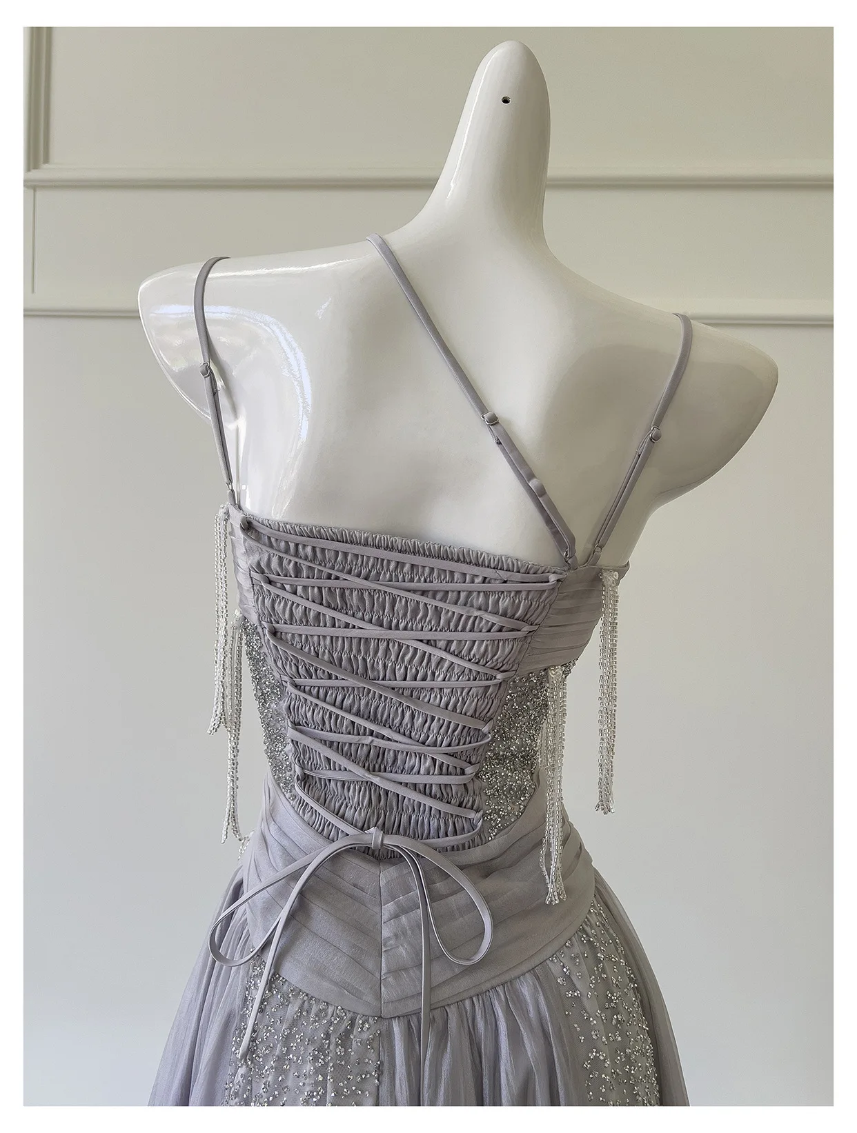 LBSFY -Charming Women's Gray Tulle Midi Dress With Lace Appliques Neckline Sleeveless Party Formal Gown Elegant