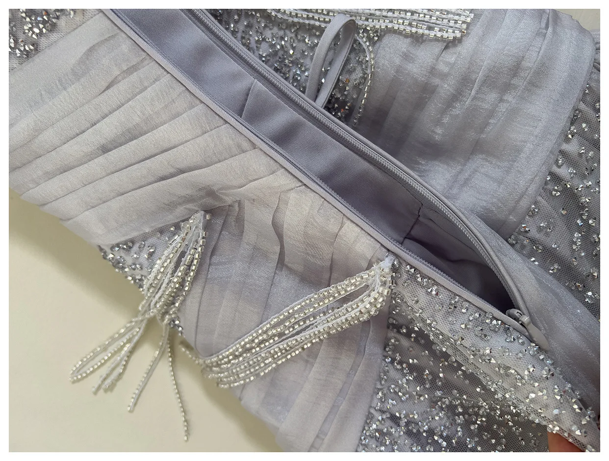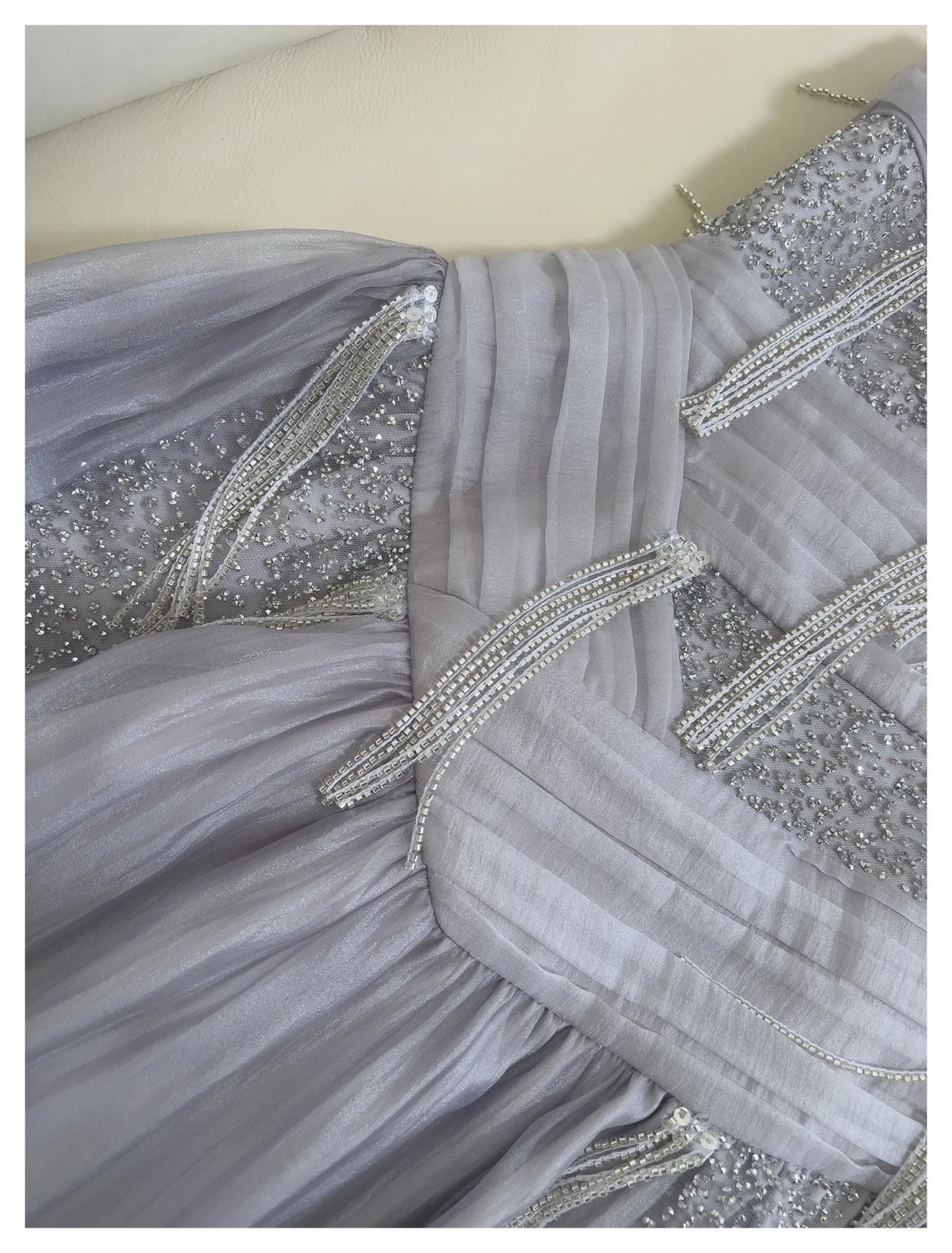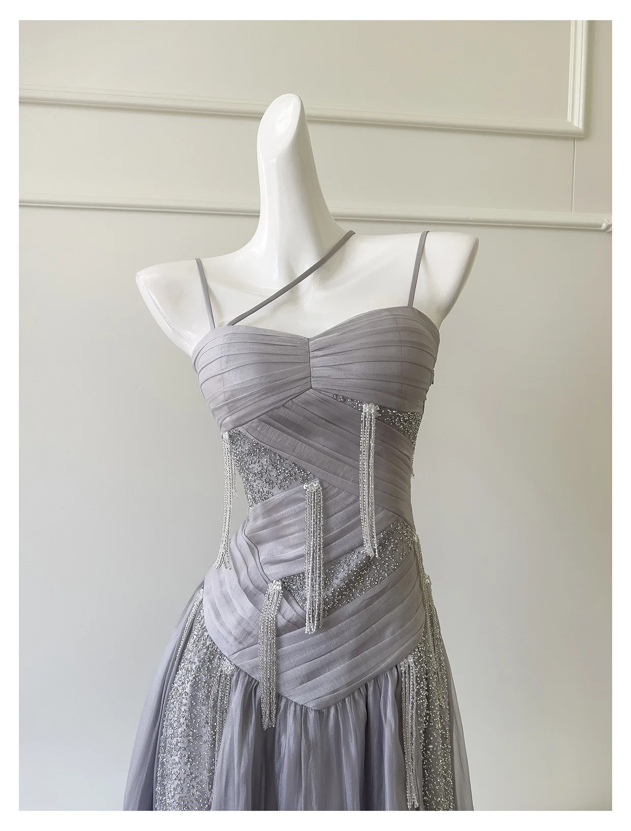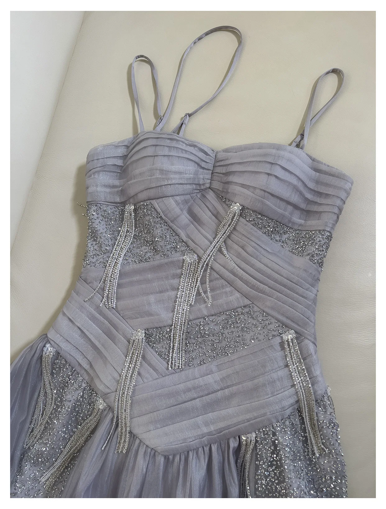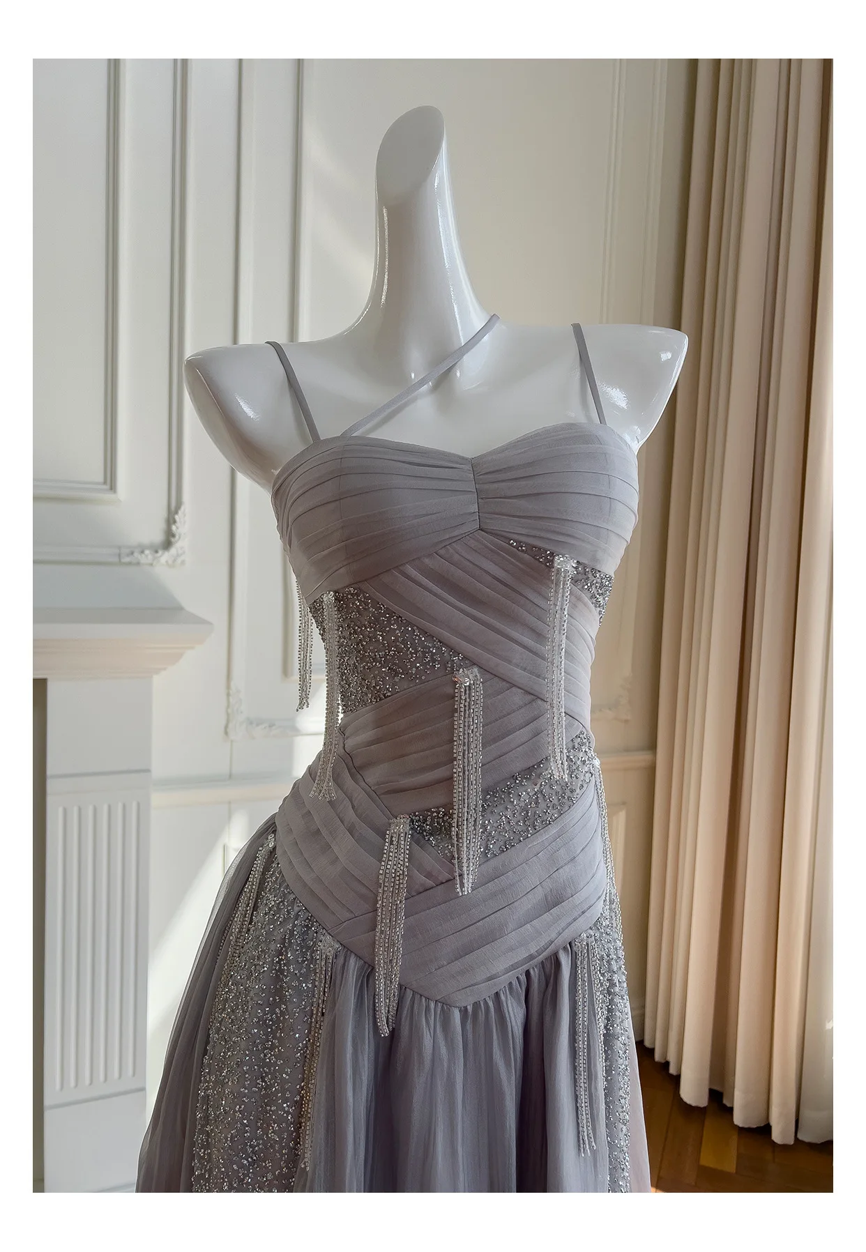 LBSFY -Charming Women's Gray Tulle Midi Dress With Lace Appliques Neckline Sleeveless Party Formal Gown Elegant