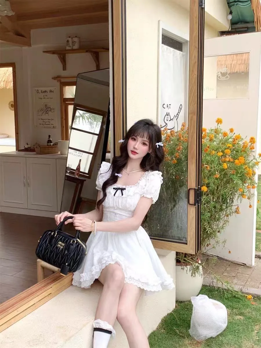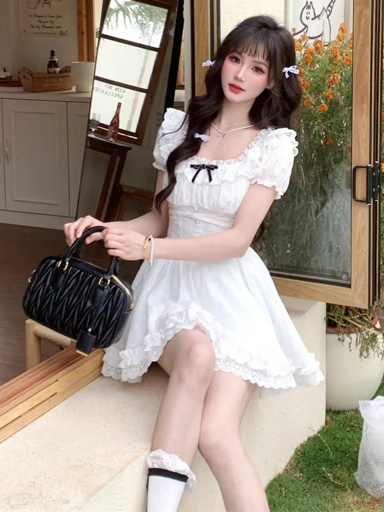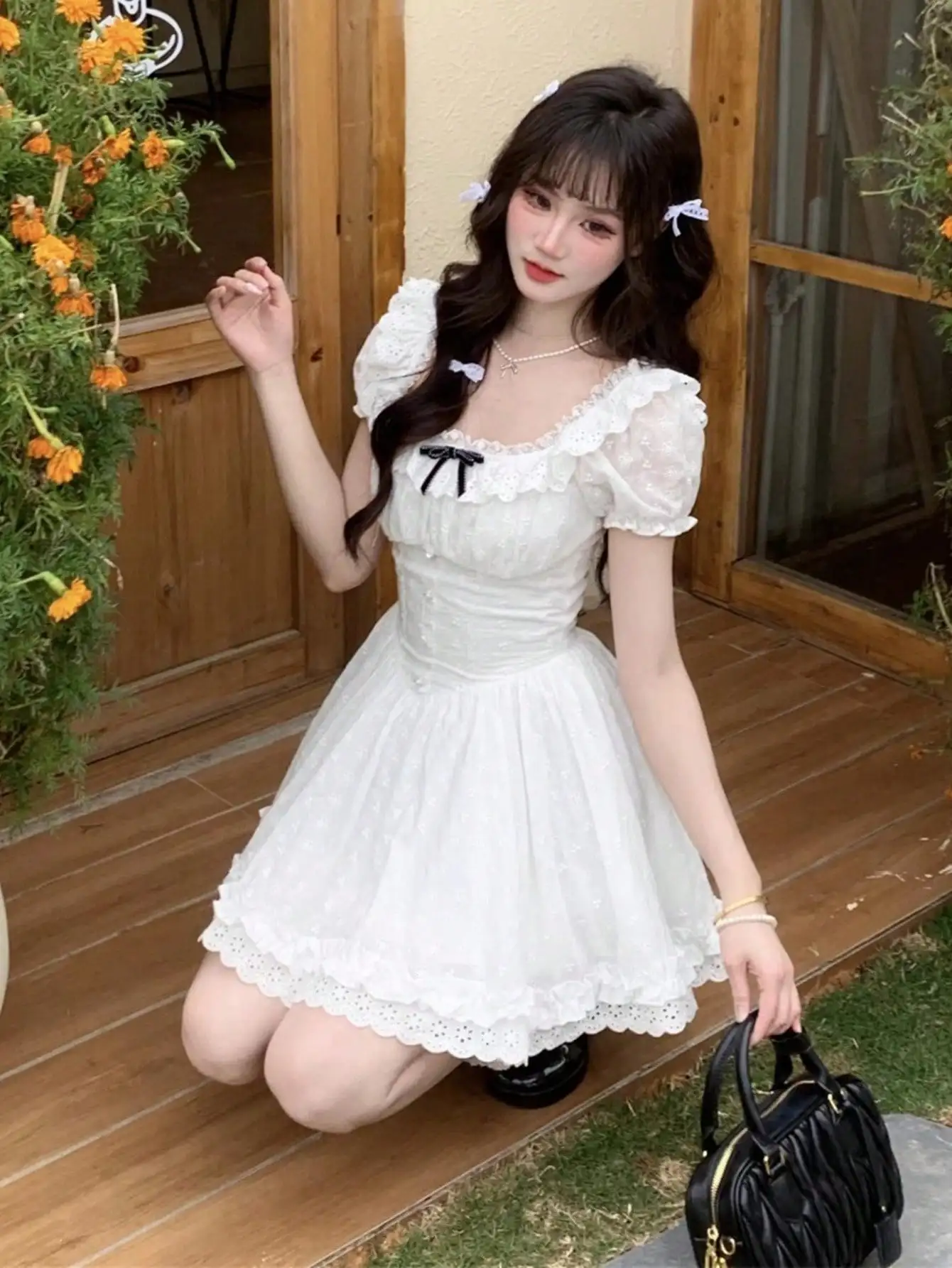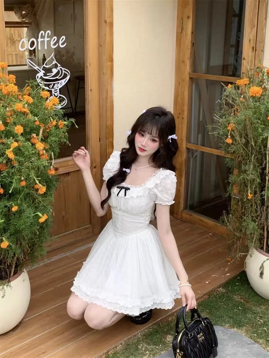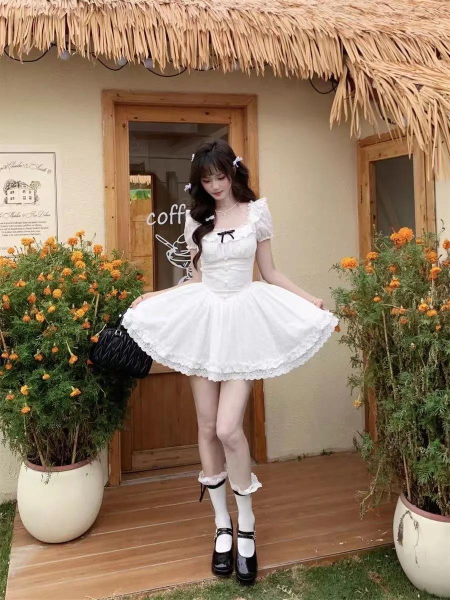 LBSFY -Chic 2025 Summer Sweet Lace Spliced Birthday Party Dress Women Square-Collar High Waist Bubble Short Sleeve A-Line Short Dresses