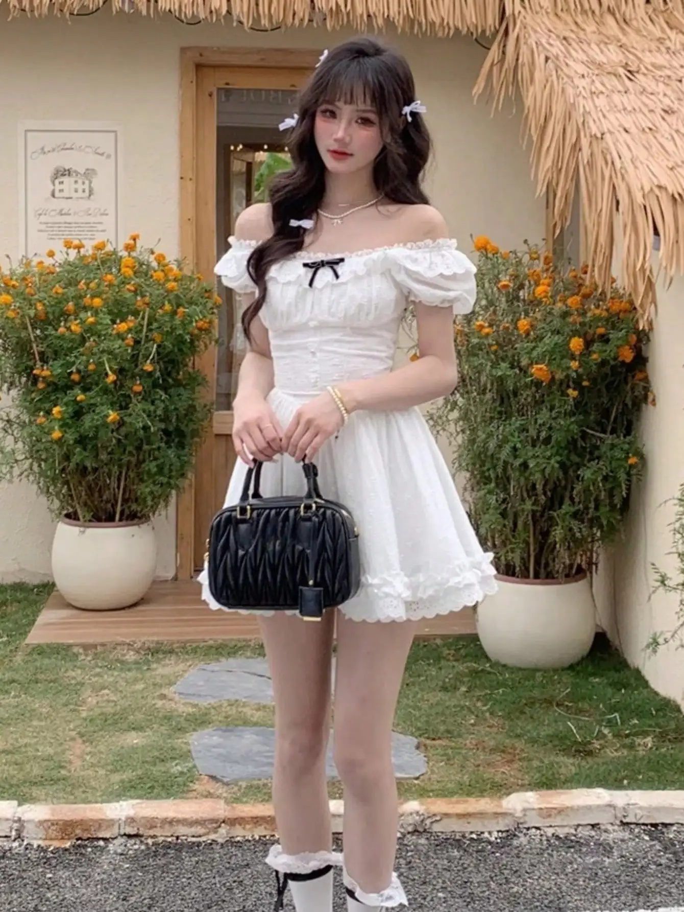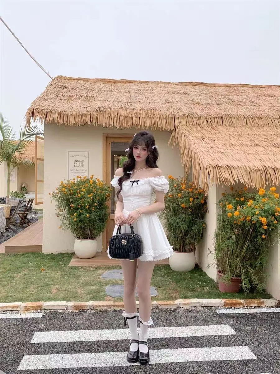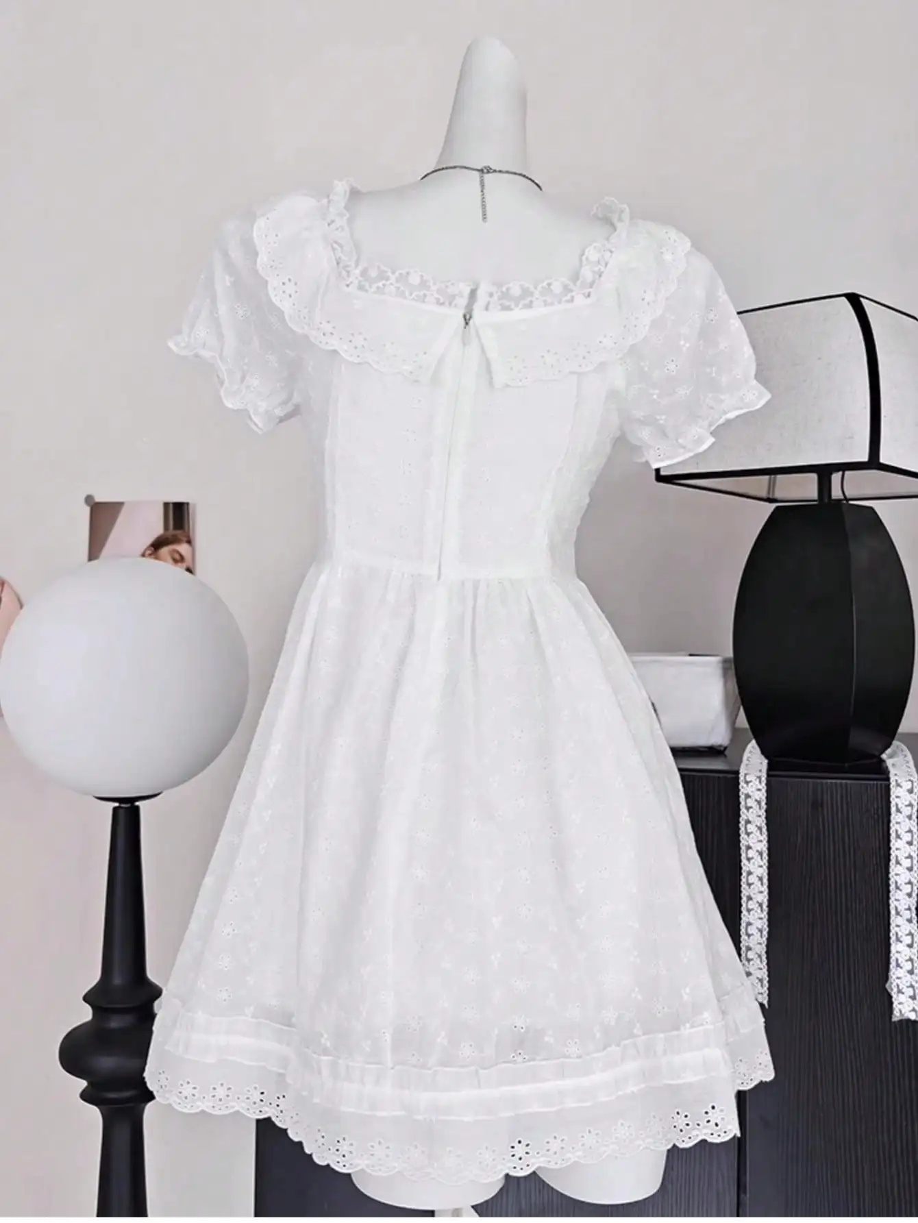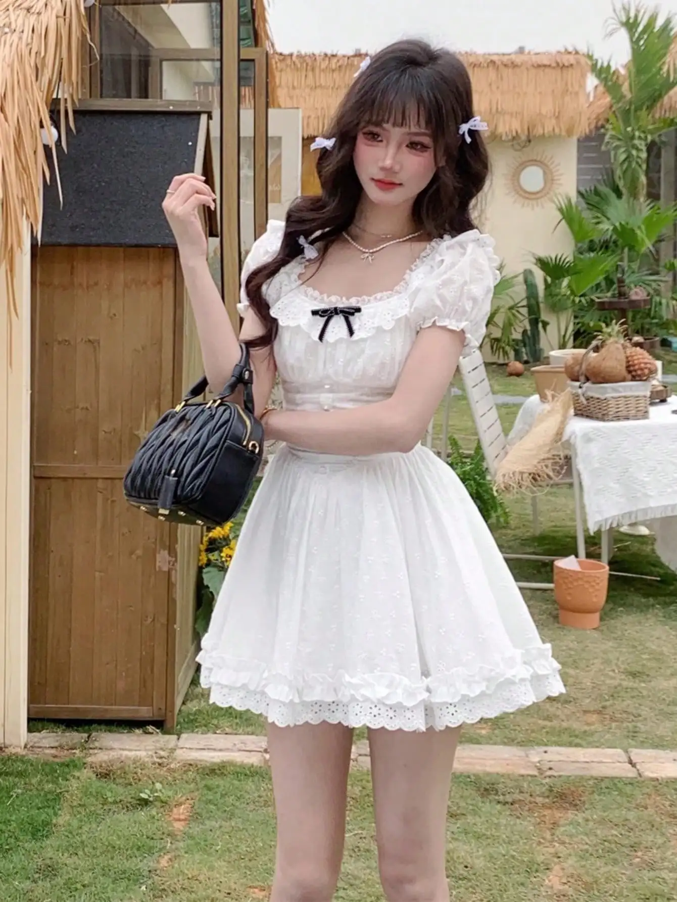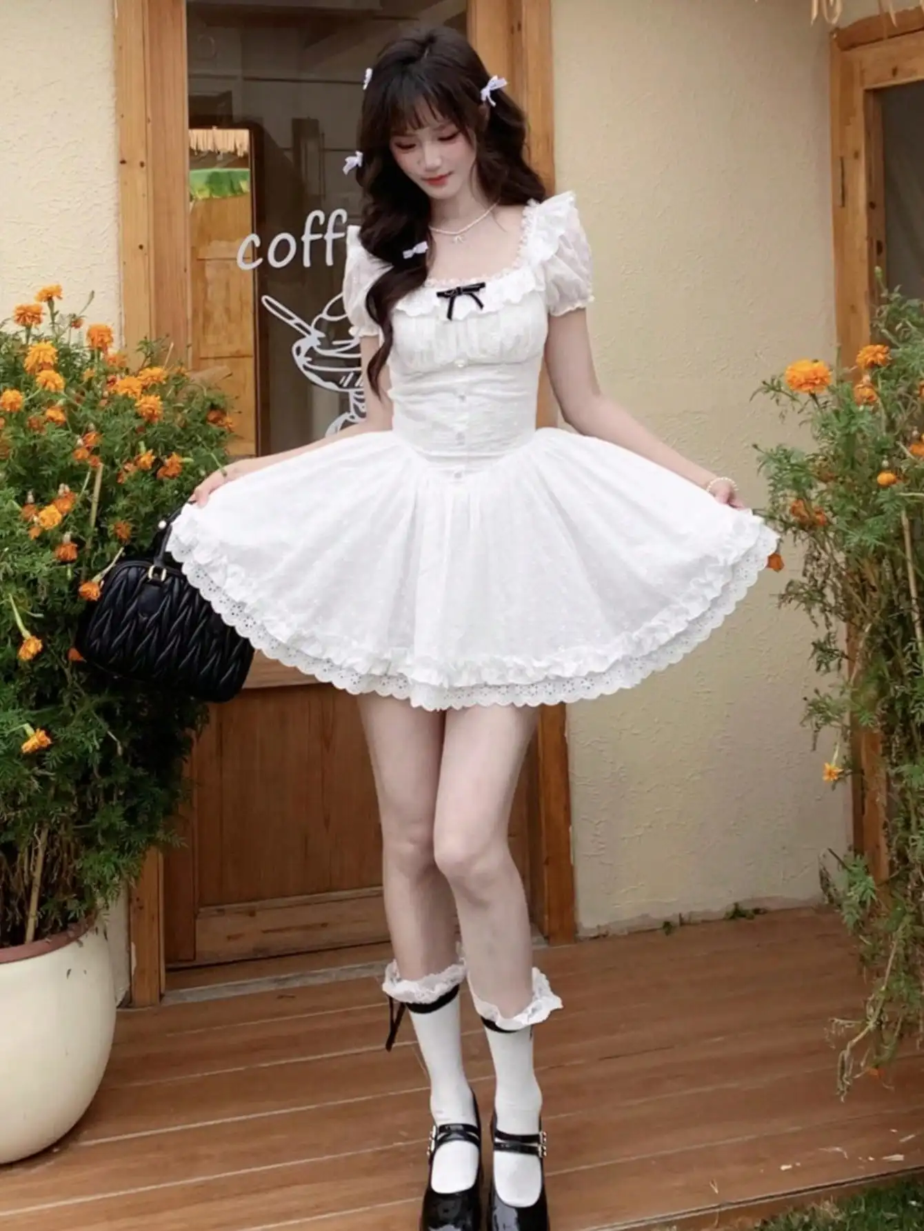 LBSFY -Chic 2025 Summer Sweet Lace Spliced Birthday Party Dress Women Square-Collar High Waist Bubble Short Sleeve A-Line Short Dresses