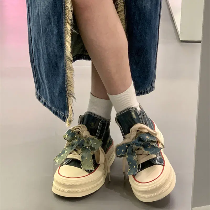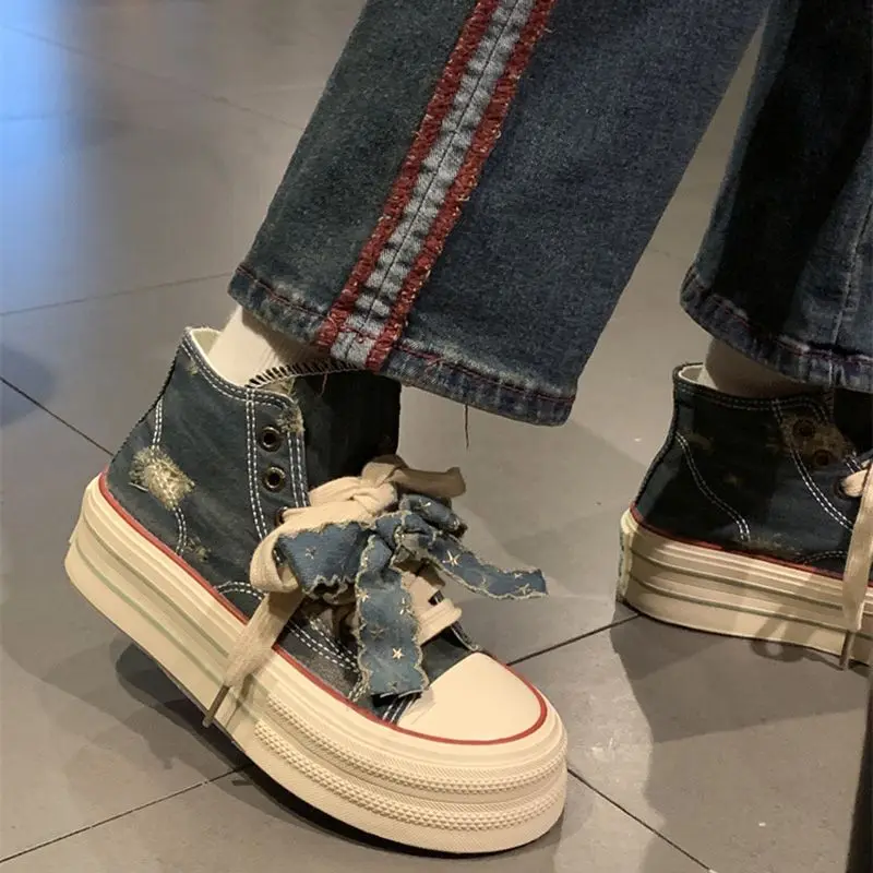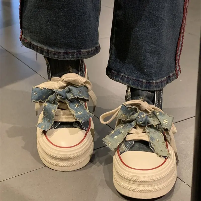 LBSFY - Chic Women Breathable Bow Sneakers Blue Denim Shell Shoes For Girls Thick Heel Sneakers Casual Running Platform Y2K Lolita Shoes