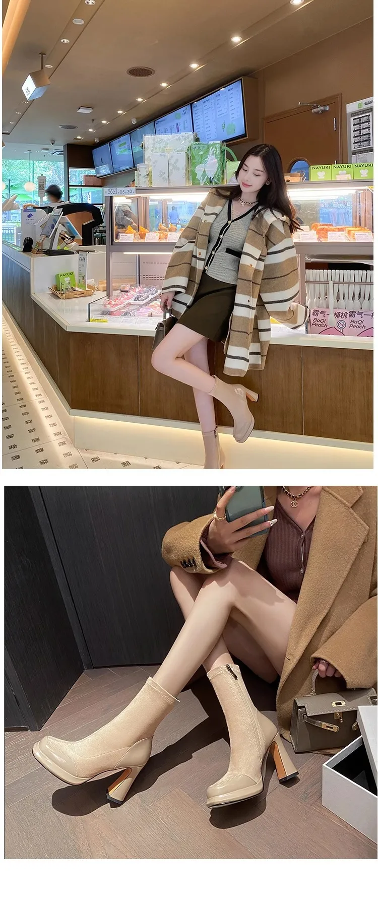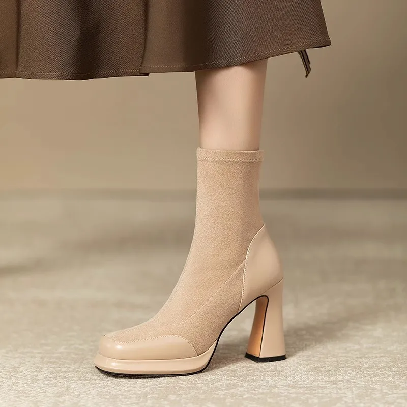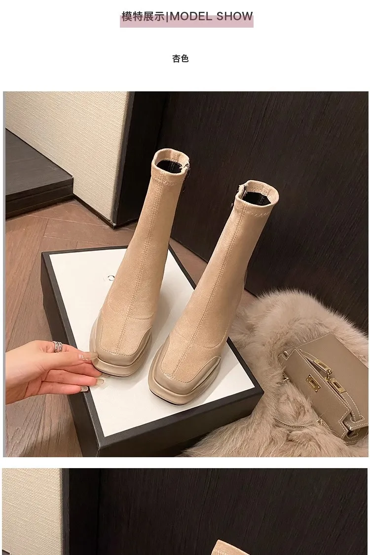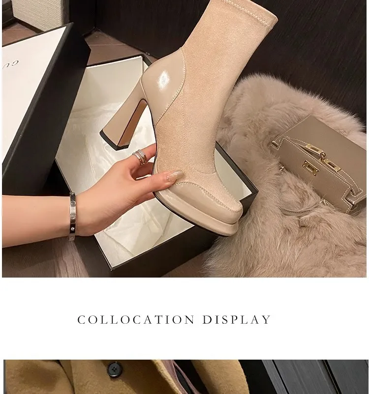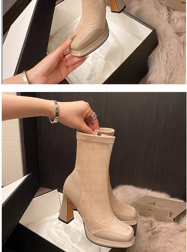 LBSFY - Chunky Heel Short Boots for Women Autumn Winter Splicing Waterproof Platform Skinny Boots Suede Temperament High-heeled Botines
